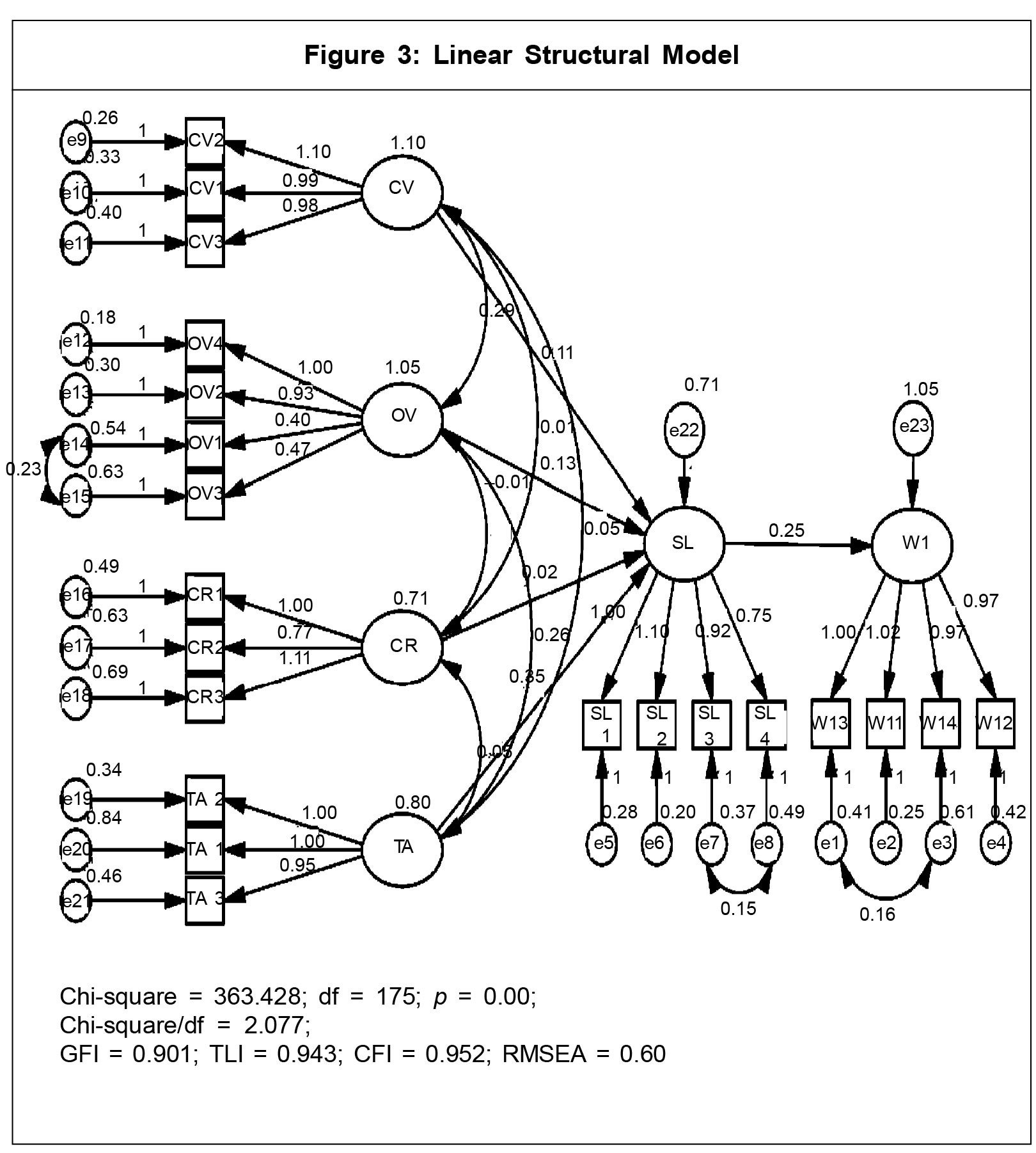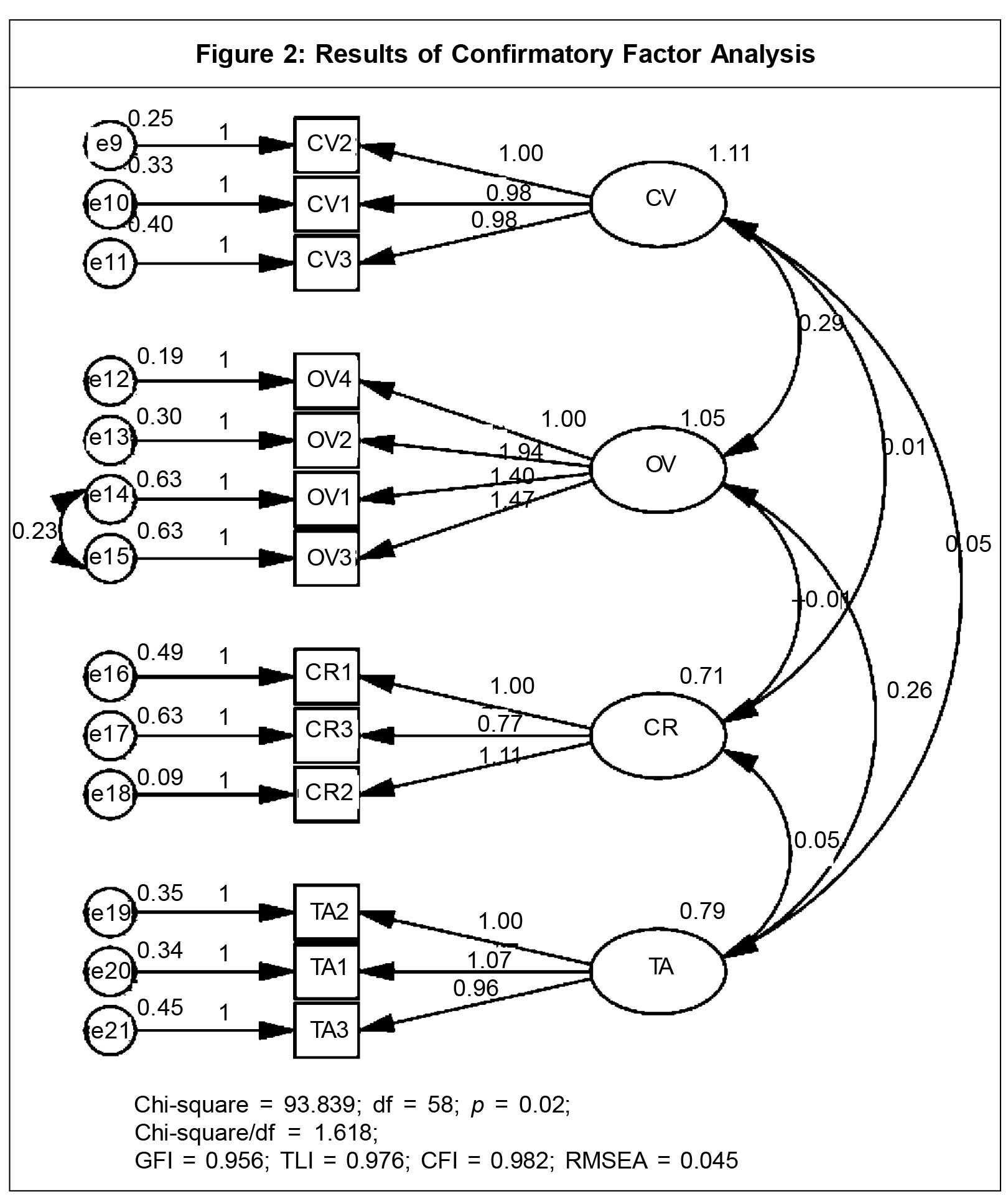 CFI = 0.982; TLI = 0.976; GFI = 0.956 and RMSEA = 0.045 (see Figure 2); these indexes satisfy the requirements when assessing the overall fit. Therefore, it is concluded that the model fits the actual data.