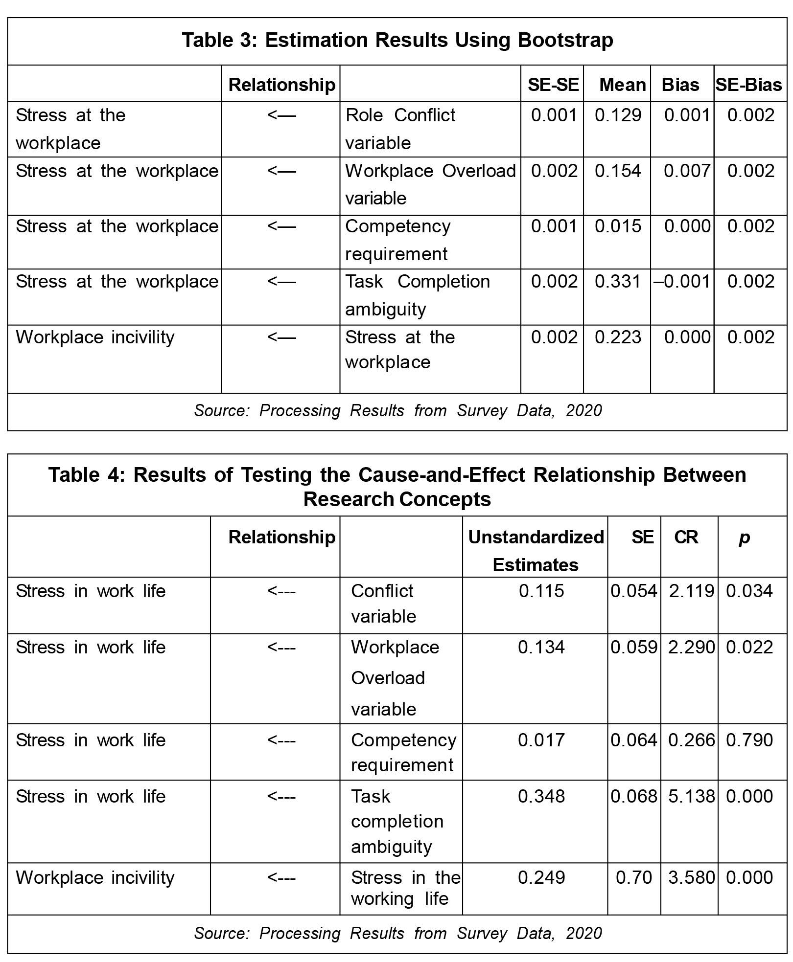 After the measurement model has been validated by CFA, the study determined the SEM. The data processing results are used to analyze the factors affecting the job stress of employees at the supermarket and the relationship between work stress and workplace incivility. The processing results are presented in Table 4 and Figure 3. The model has 175 degrees of freedom and Chi-square/df = 2.077; CFI = 0.952; TLI = 0.943; GFI = 0.901 and RMSEA = 0.60. These indexes satisfy the requirements when assessing general suitability.