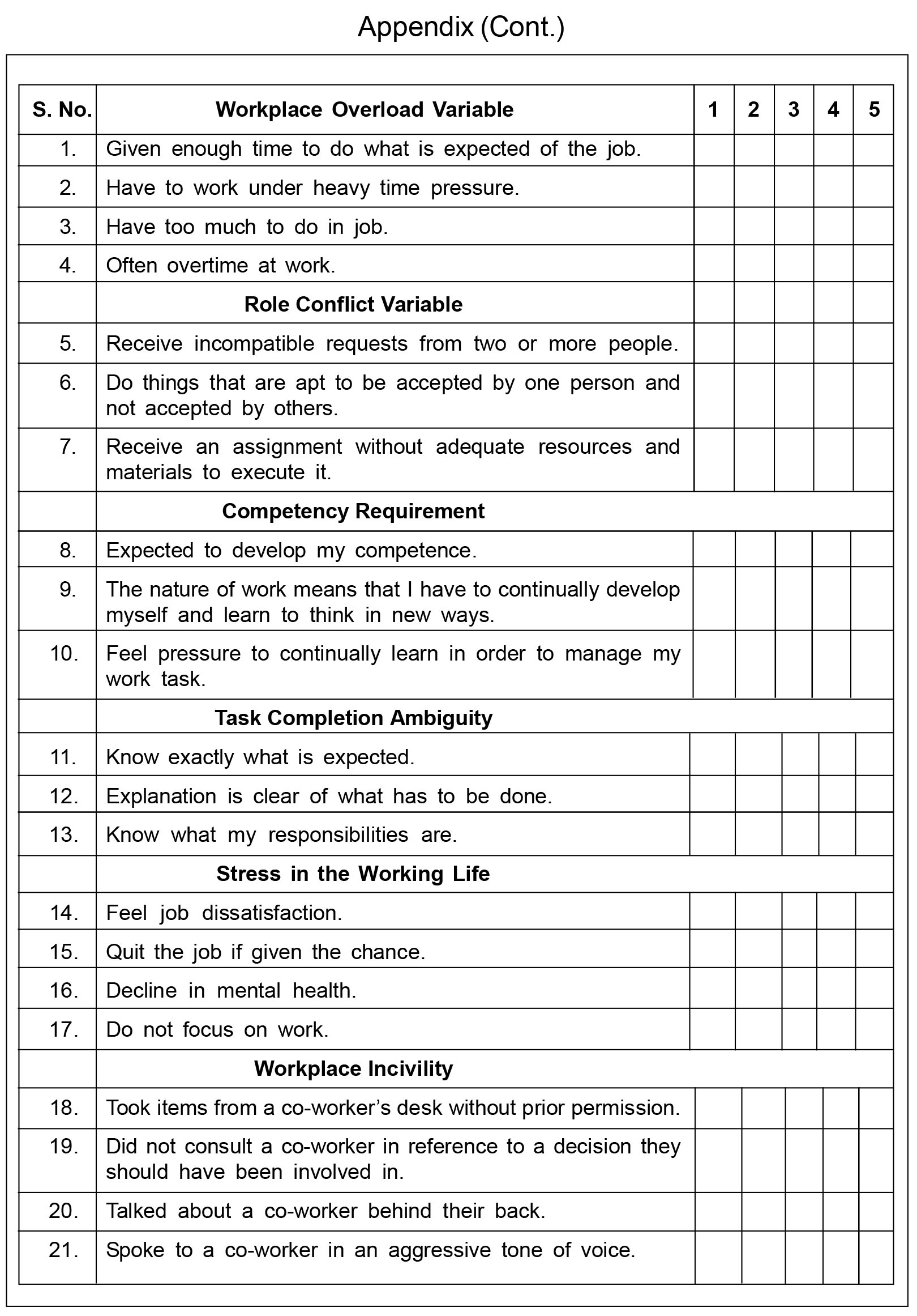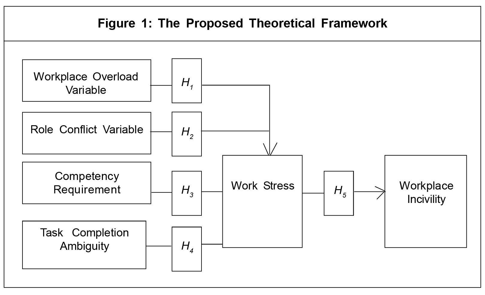 Based on the studies of Rizzo et al. (1970), Beehr et al. (1976), Karasek and Theorell (1990), Lisa and Paul (2005), Naswall et al. (2008), Taylor et al. (2012), and Sathasivam et al. (2015), a conceptual model was developed that consisted of the determinants of stress in the workplace and the relationship between working stress and workplace incivility. The hypotheses are proposed as: