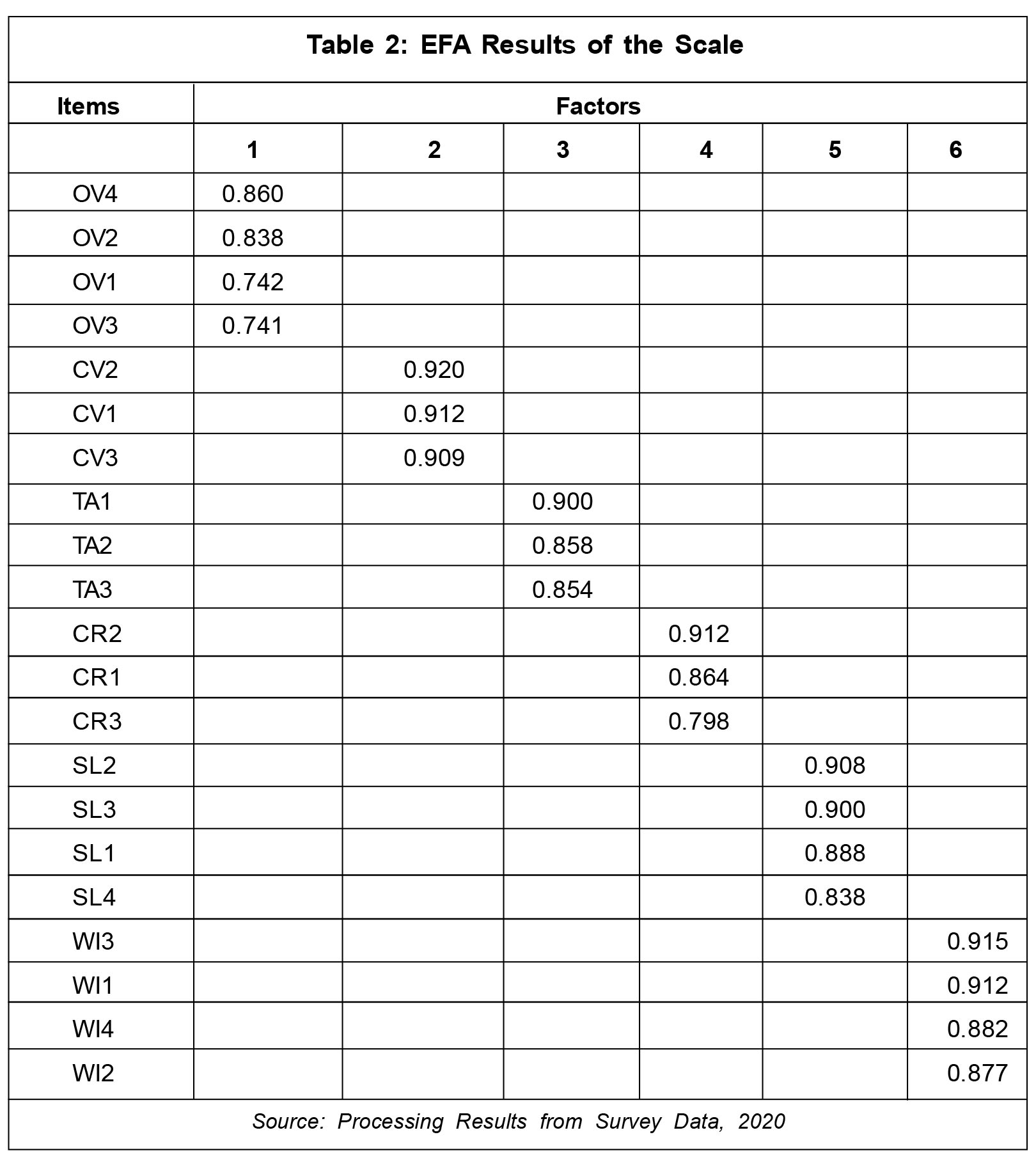 After testing Cronbach's alpha for four independent variables, 1 intermediate variable, and 1 dependent variable in the research model (Table 1), all factors have Cronbach's alpha coefficients that meet the requirements (>0.5) and no observed variables were excluded. The results of testing the reliability of the scale are summarized in Table 1. After testing the reliability coefficient of Cronbach's alpha, all observed variables meet the requirements for EFA analysis.