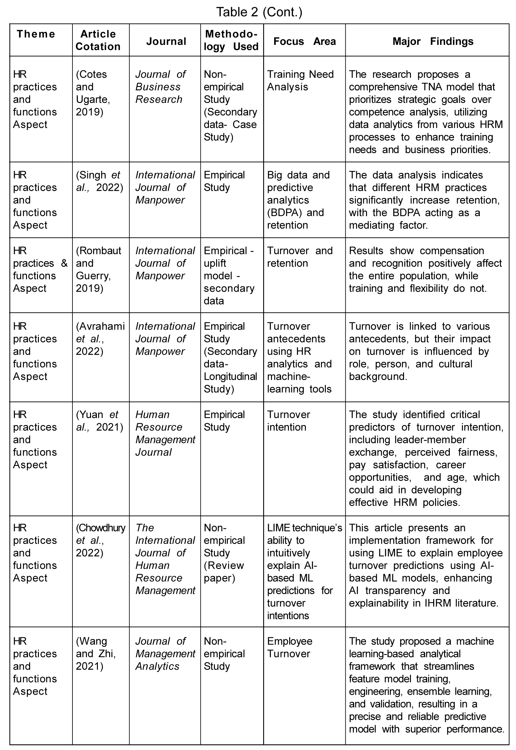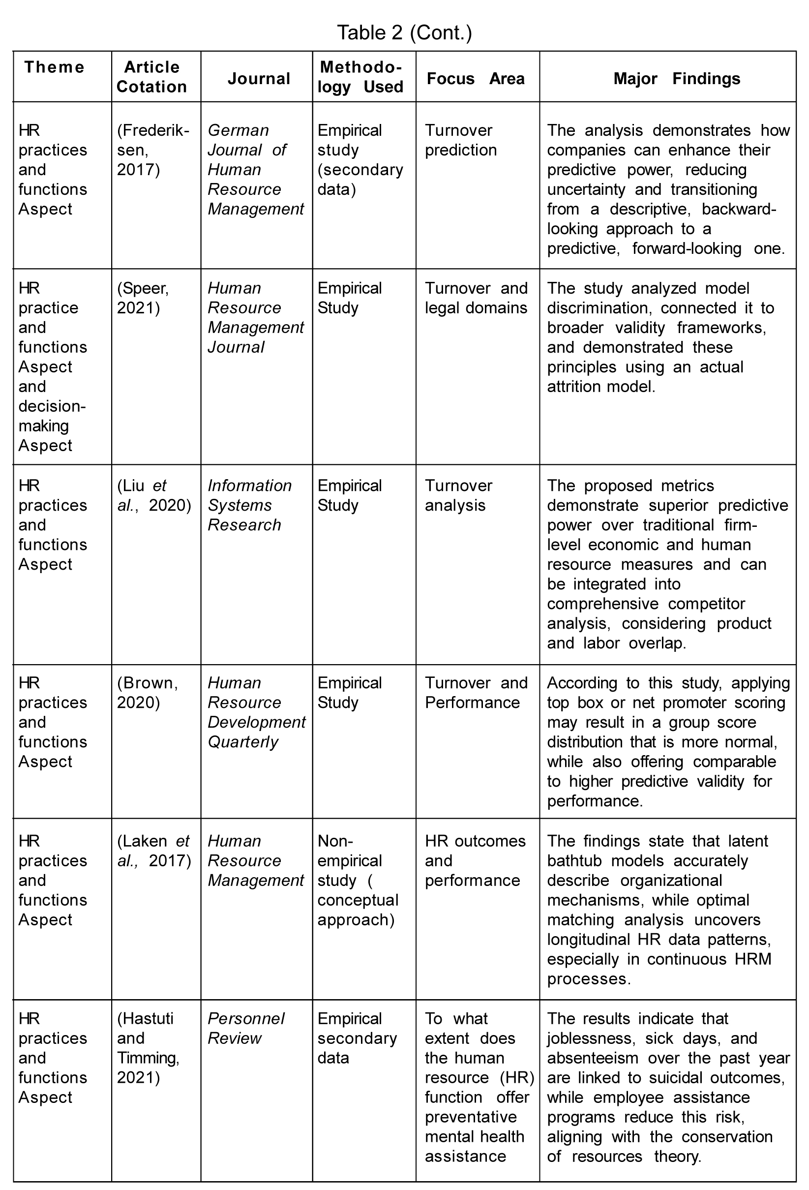 HR analytics can be a supporting tool for predicting employee turnover if used wisely by organizational management (Wright, 2017). Avrahami et al. (2022) revealed that turnover association with levels of antecedents such as competencies, cultural values, commitment, and trust is contingent upon the organization's role, person, and culture. According to Yuan et al. (2021), career opportunities, perceived fairness, age, pay satisfaction, and leader-member exchange predicts turnover intention. HR analytics can help with better business planning, risk mitigation, and adaptability to changes in the business environment by anticipating future workforce needs. Organizations use artificial intelligence-based machine learning models like Local Interpretable Model-Agnostic Explanations (LIME) technique to understand the reasons behind the predicted employee turnover (Chowdhury et al., 2022). Another machine-based analytical framework for the robust prediction of employee turnover has been developed by Wang and Zhi (2021). According to Frederiksen (2017), organizations move from descriptive to prescriptive HR analytics by analyzing job satisfaction data to predict turnover. HR analytics is a data-analytical tool that aids in assessing compensation patterns, maintaining competitive benefits and compensation, and evaluating the success of diversity and inclusion initiatives. Speer (2021) outlined a three-step process of removing or altering variables if they negatively impact diversity goals (attrition and validity) before implementing the attrition model. HR analytics traces the human capital flow across organizations through human capital overlap metrics by performing interfirm labor market competitor analysis using employee migration information (Liu et al., 2020).