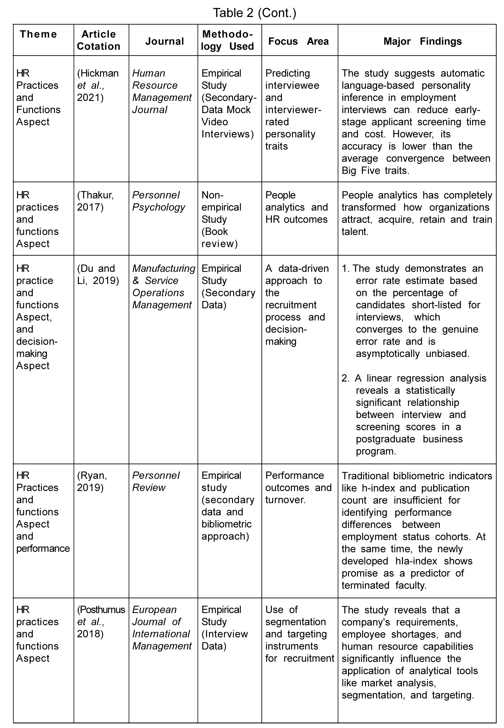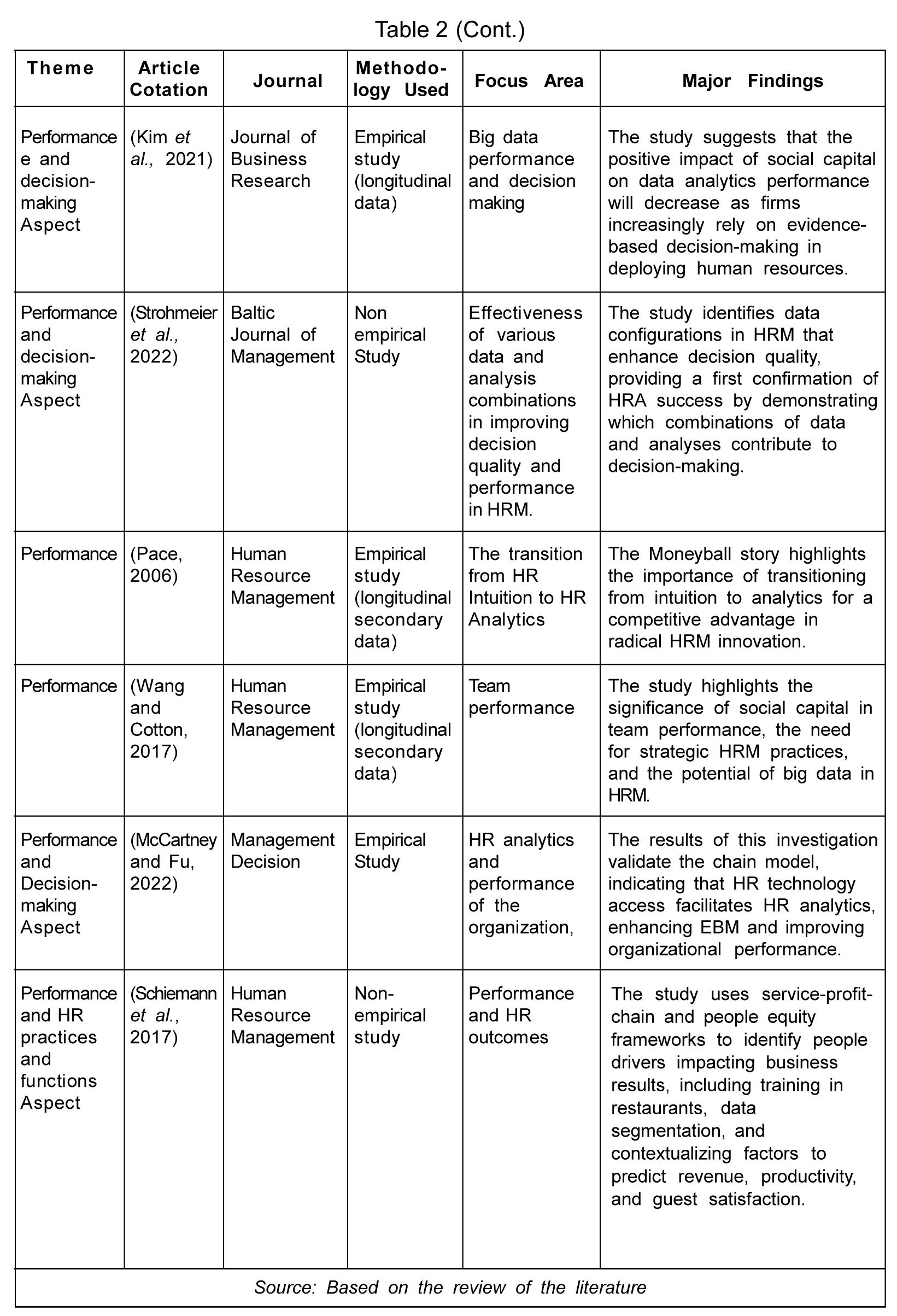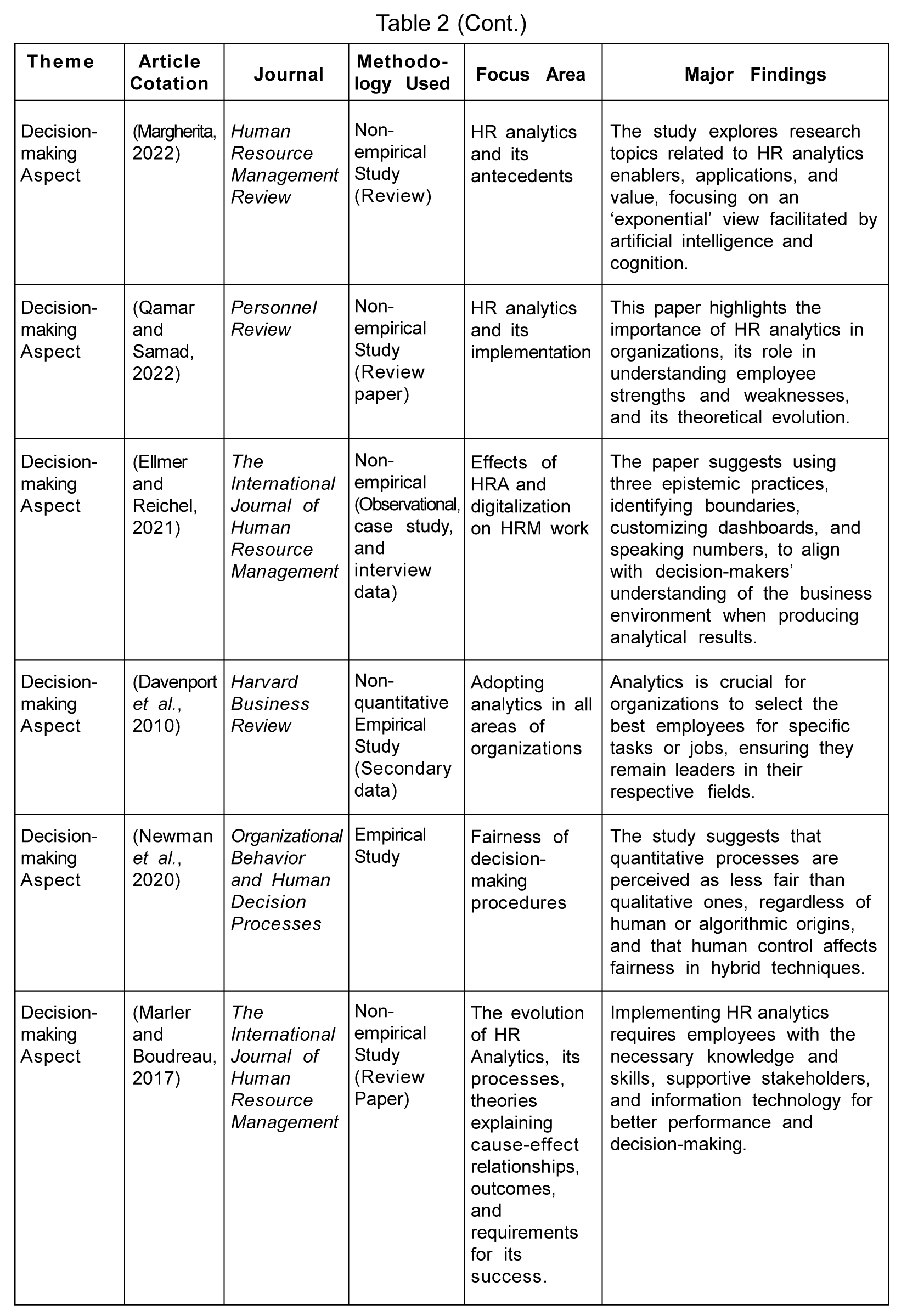 Under the umbrella of human resource management, HR analytics is gaining interest as an innovative, strategic, and practical decision-making approach. Moreover, big data analytics also significantly impacts employee selection and recruitment, organizational decision-making, performance management (McAbee et al., 2016), and talent management, as noted by Margherita (2022) and Prokesch (2017). Despite the significant advancements in analytics, there still needs to be a significant gap in understanding the role of HR analytics in HR practices. Thus, this paper aims to contribute to the existing literature on the association between HR analytics and organizational outcomes. With relevance to this, the second research question drafted is as follows: