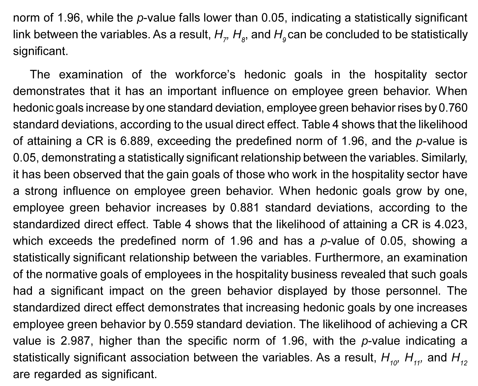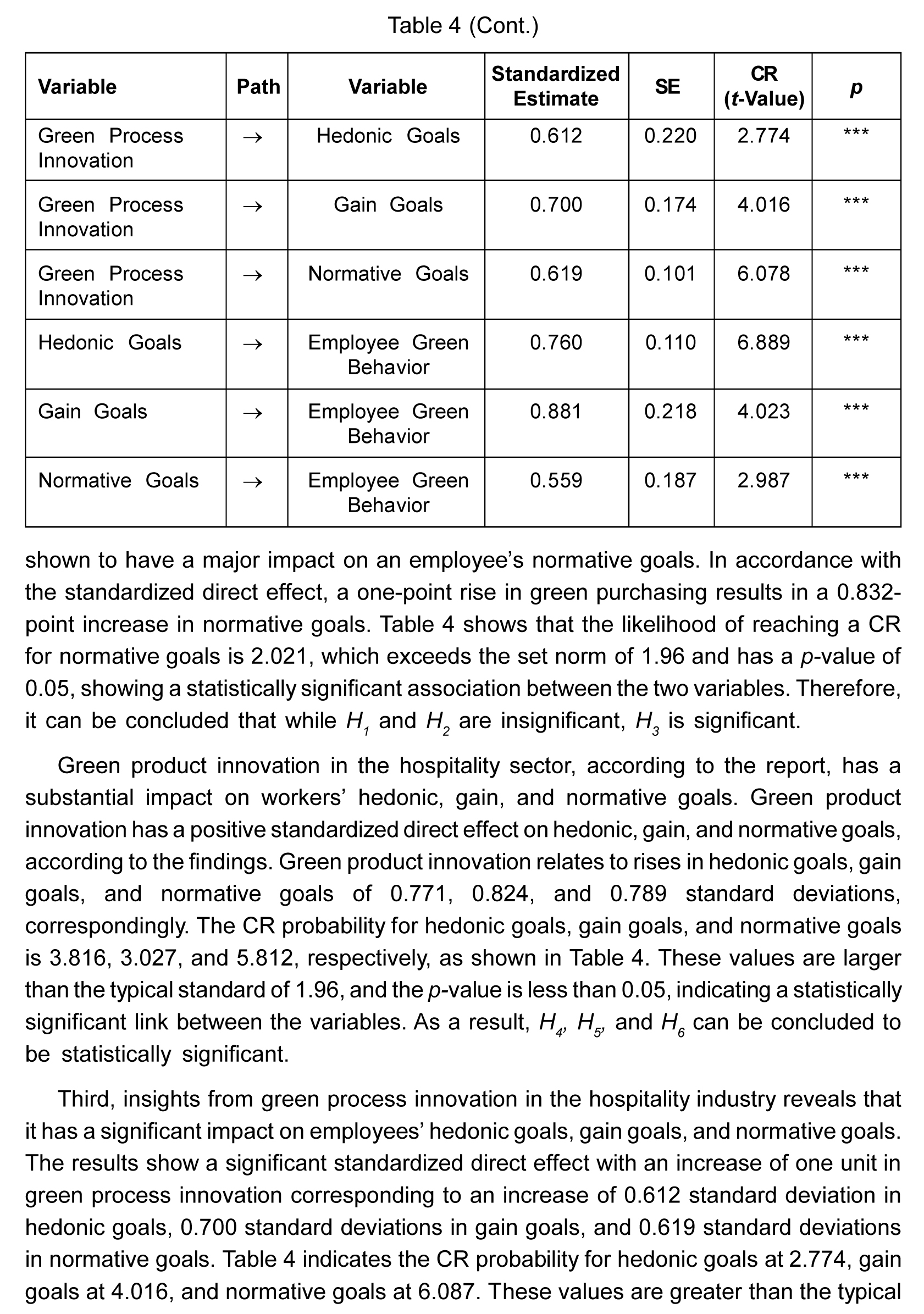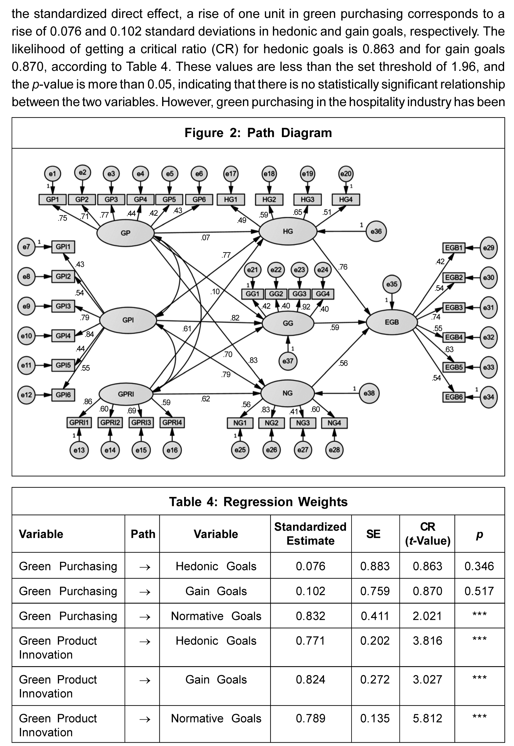 According to the findings, implementing green purchasing practices in the hotel business has no substantial impact on employees' hedonic and gain goals. Based to