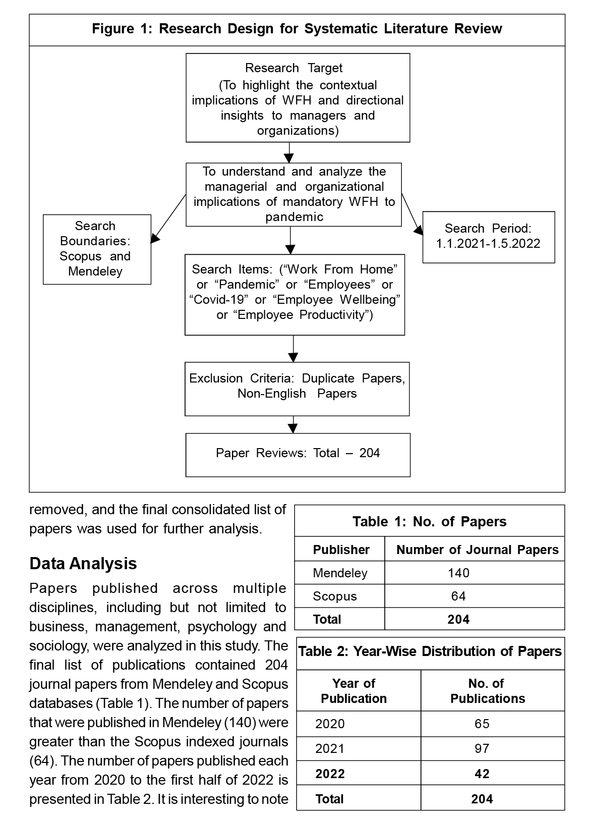 It was rightly said long ago that from time to time, "organizational environments undergo cataclysmic upheavals-changes so sudden and extensive that they alter the trajectories of entire industries, overwhelm the adaptive capacities of resilient organizations, and surpass the comprehension of seasoned managers" (Meyer et al., 1990). The effect of Covid-19 pandemic on the industry and individuals alike perfectly sums up this quote by Meyer et al. (1990). It has pushed organizations across the globe to undertake unprecedented and unforeseen risks to continue their operations and stay in business (Yue et al., 2020). Business leaders and HR managers scrambled to keep the businesses afloat while taking care of employees and following the Covid-19 protocols. WFH, although a known occurrence in the corporate environment, became a standard practice and the only available option during the pandemic, giving rise to a multitude of hitherto unseen implications and challenges to not only the management but also employees and their families. The ripple effect of this impromptu shift in work design has immediate as well as long-term consequences. The issues emerging from the pandemic induced mandatory WFH appear to be substantially diverse and are yet to be uncovered. The research shows the emerging issues in diverse perspectives and contexts to understand and strategize for future. The results are not only diverse but also directionless. This is reiterated by the surveys (Ipsen et al., 2020) which highlighted conflicting views of employees, managers and organizations, thus necessitating further investigation. This study attempts to examine and analyze the literature, using the systematic literature review tool, to answer specific research questions using a systematic and explicit methodology to identify, select, and critically evaluate results of the studies included in the literature review (Rother, 2007). It also endeavors to define the direction of literature for theoretical, practical and managerial implications of mandated WFH and proposes research direction based on the results of the literature review.