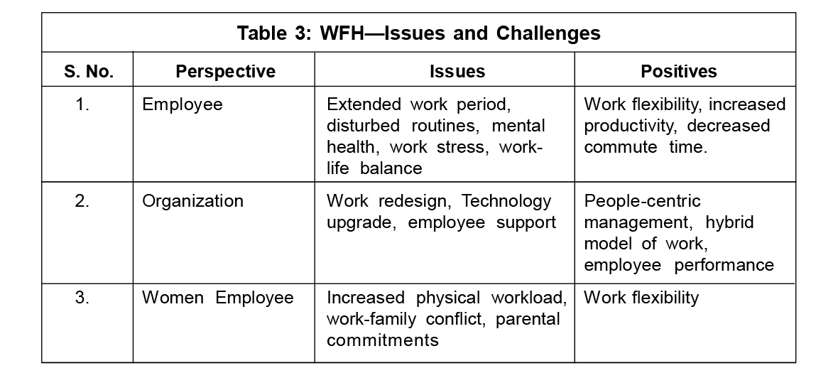 Covid-19 pandemic has created a plethora of situations in diverse contexts, resulting in issues and challenges faced by all the stakeholders of business. The systematic review of literature on WFH from employee and organizational perspective has brought forth multiple interrelated issues (Table 3).