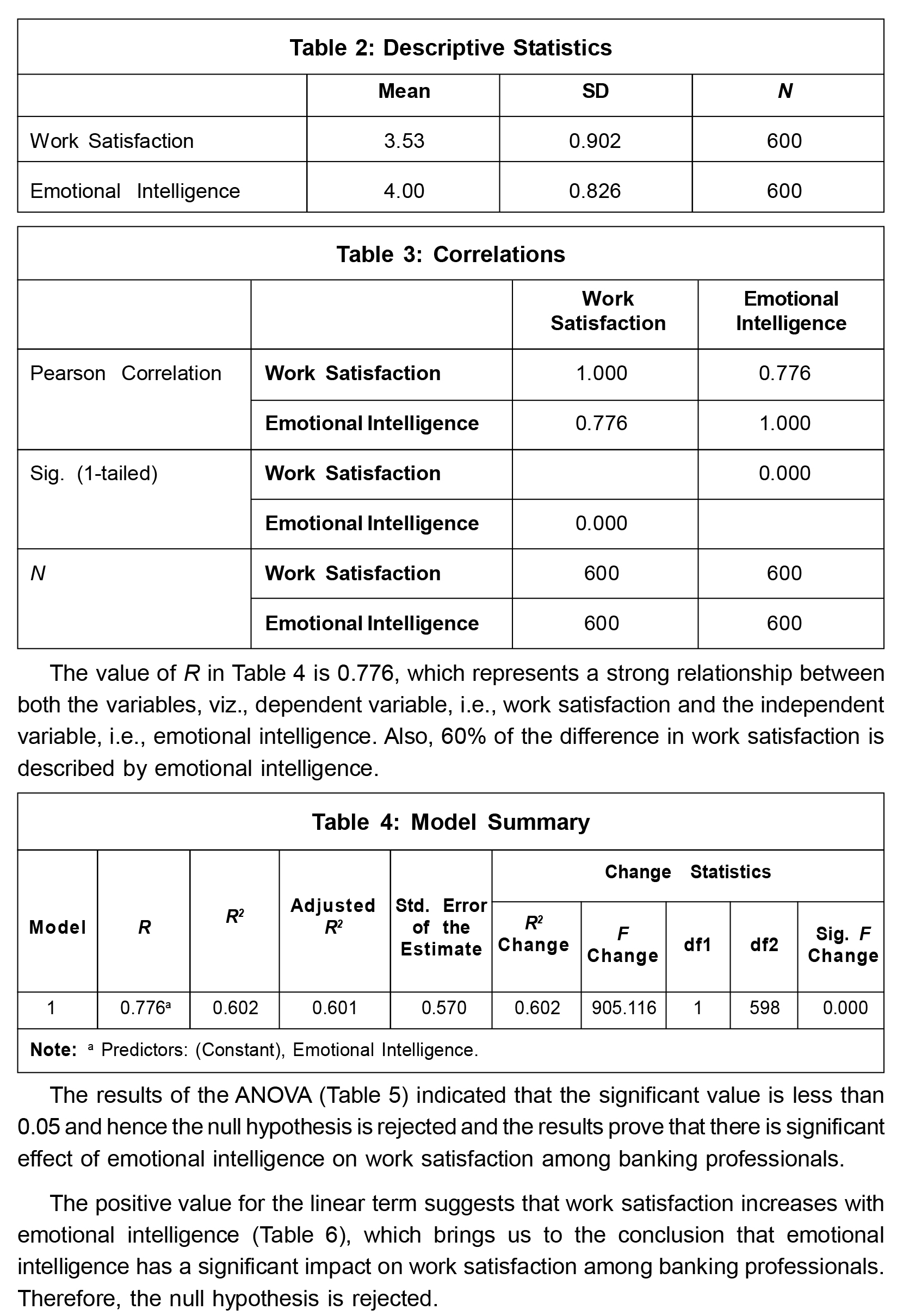Implications: Firstly, the study clearly shows that emotional intelligence is directly related to job satisfaction amongst banking professionals. The higher the emotional intelligence amongst the employees, the higher their job satisfaction level, which will directly lead to improved employee productivity, higher efficiency, better customer relationships, and a positive work environment. The banking organizations, which are an important part of the service industry, should give due importance to the emotions and emotional intelligence of their employees so as to increase job satisfaction.