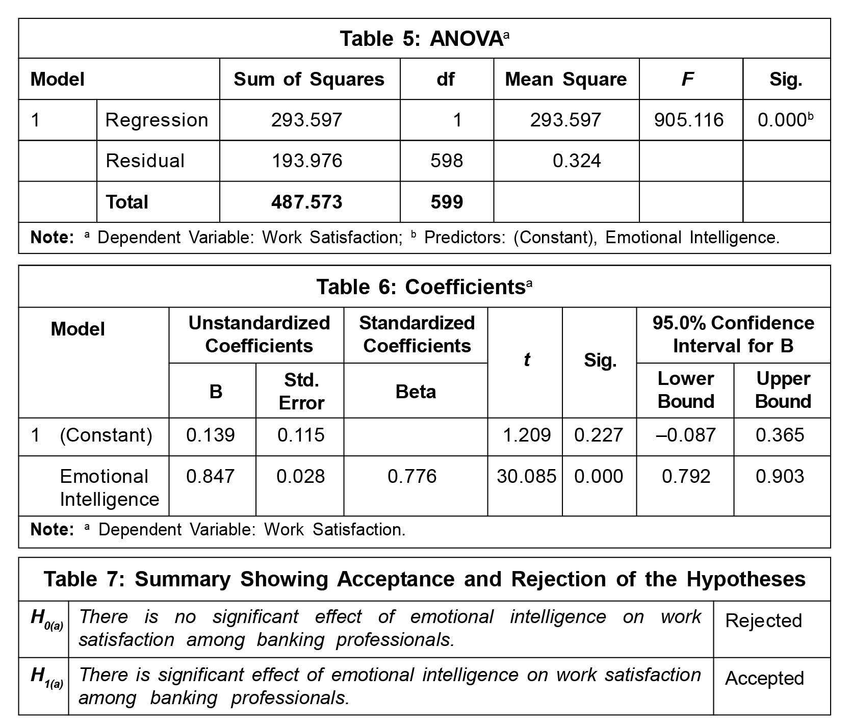 H0(a): There is no significant effect of emotional intelligence on work satisfaction among banking professionals.