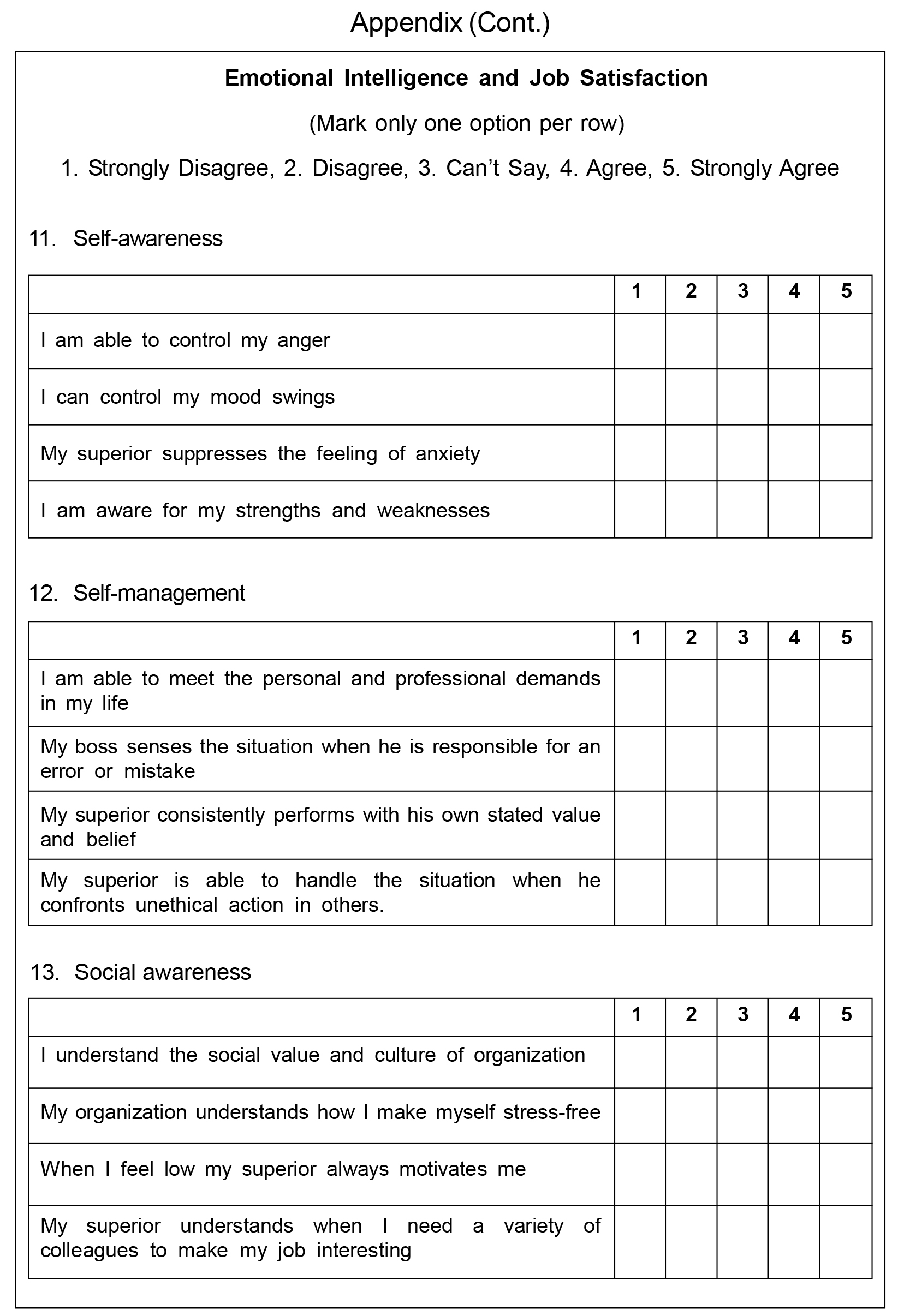 The variables that have been used in the present research-dependent variable (work satisfaction) and an independent variable (emotional intelligence)-are the constructs for the study. A 5-point Likert scale was used to assess these factors.