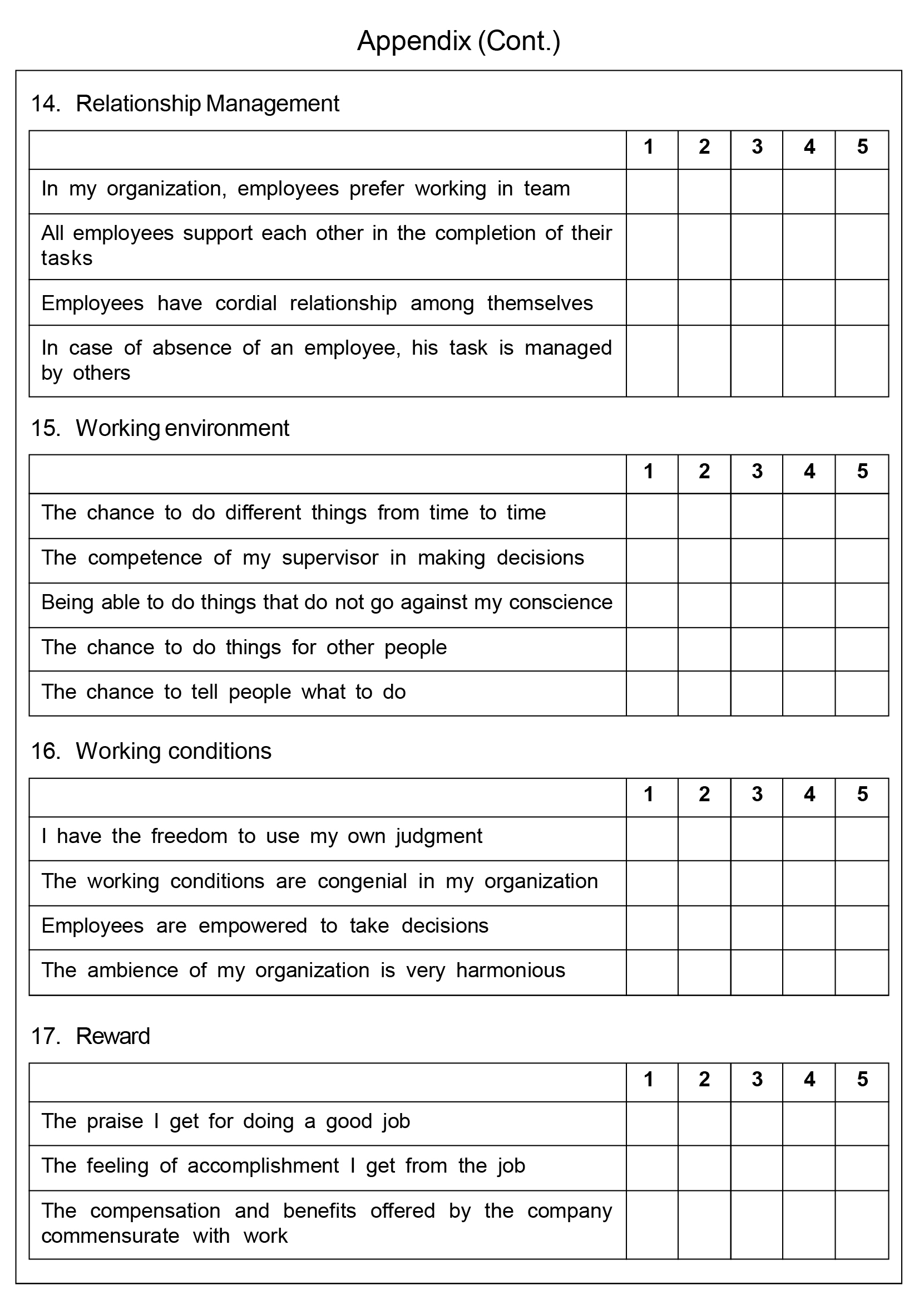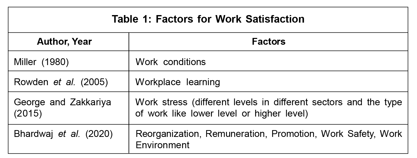 Different authors have tried to establish and test different variables with work satisfaction, some of which are summarized in Table 1. The Table shows some common factors which are considered to affect the satisfaction level of employees working in any organization, irrespective of gender and industry.