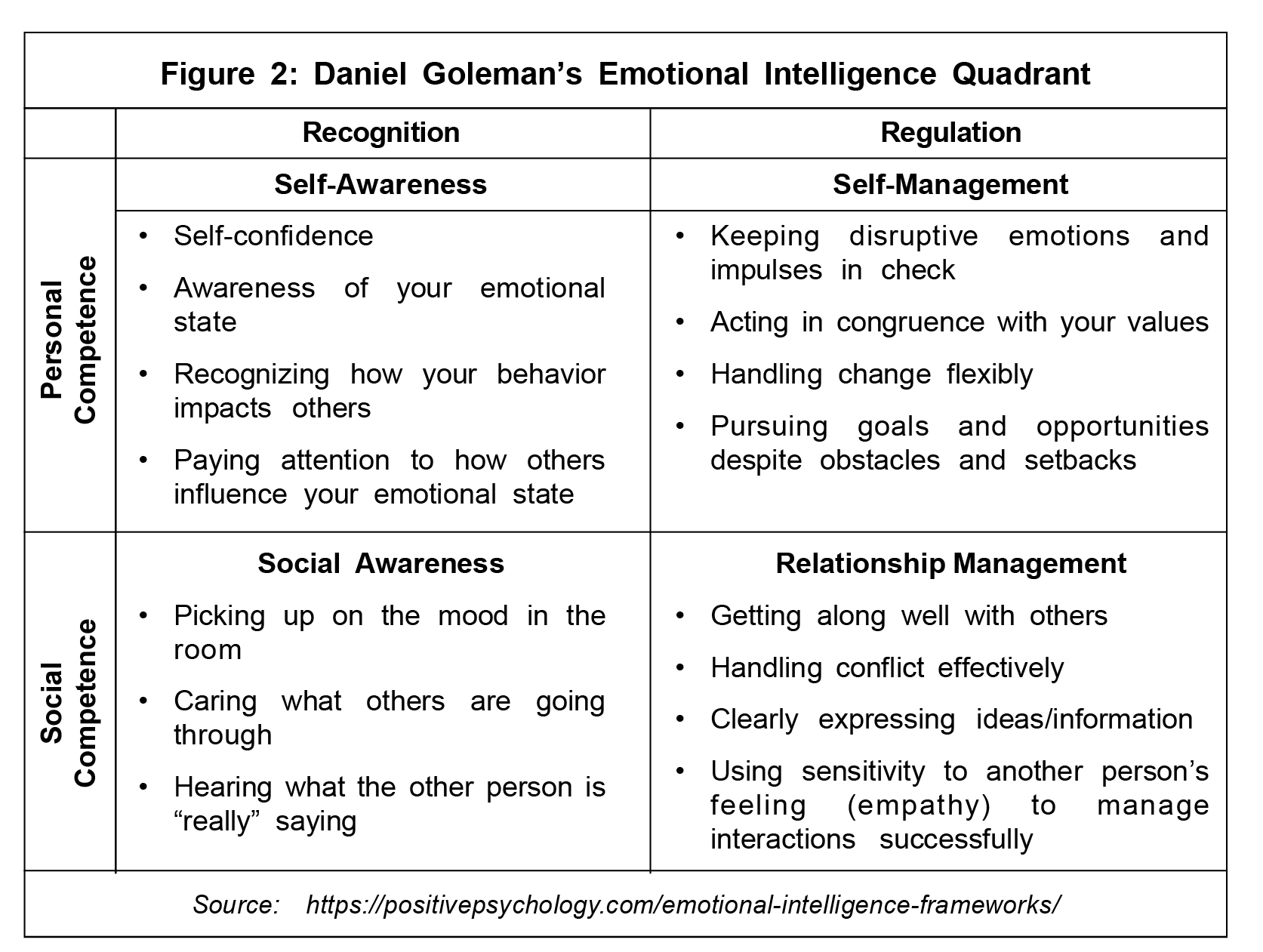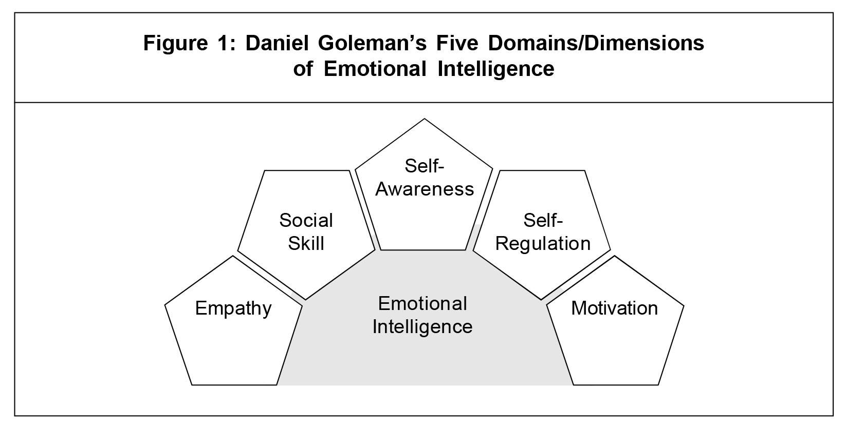 Emotional intelligence gained popularity after Daniel Goleman's publication in 1995 of Emotional Intelligence: Why It Can Matter More Than IQ. He was of the opinion that it is not our smartness that helps us to go far; rather, it is our self-awareness and empathy that help us to maintain effective relations and manage our distressing emotions. He originally presented the idea in five domains or dimensions (Figure 1). This was subsequently changed to four dimensions depicted in the Figure 2.