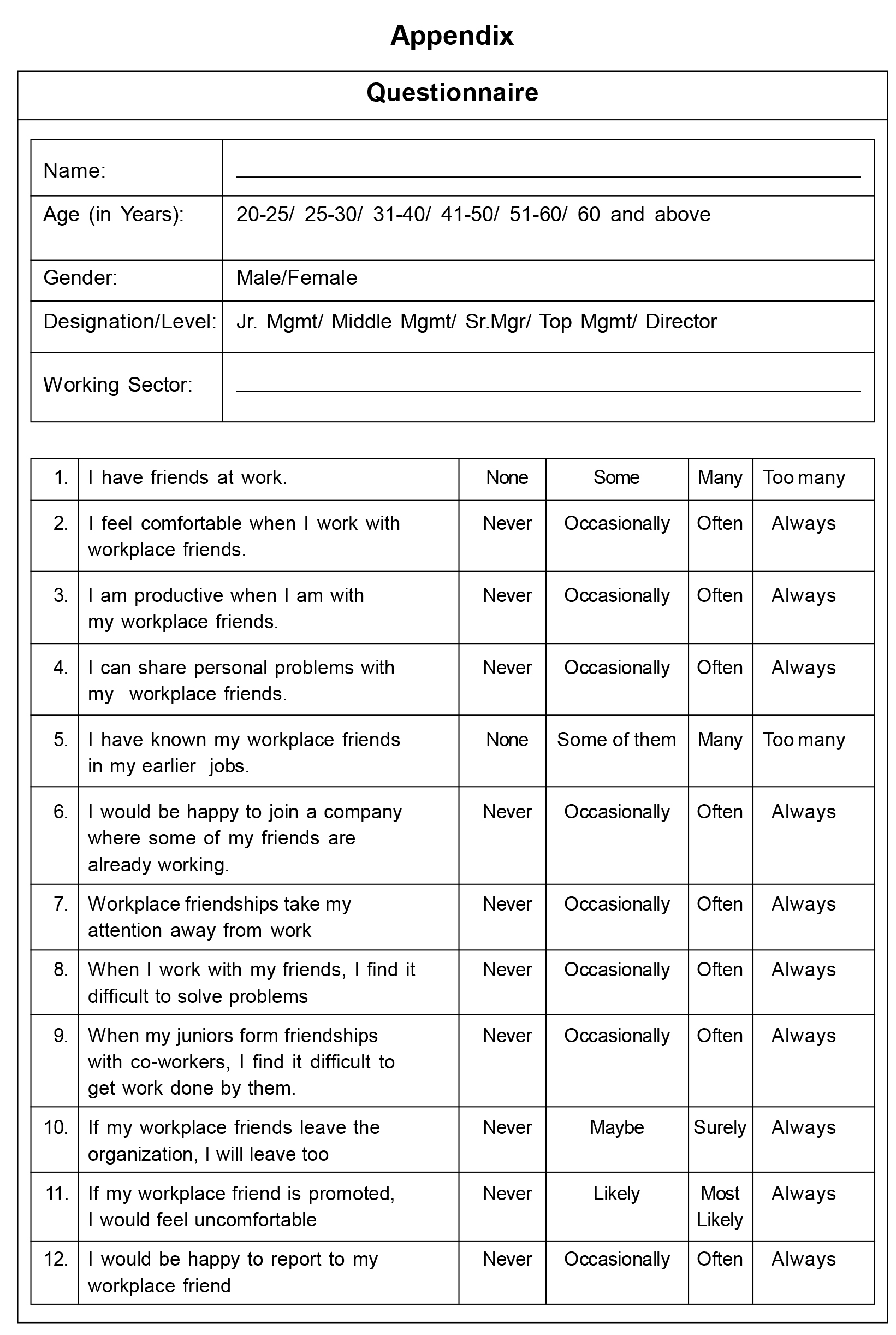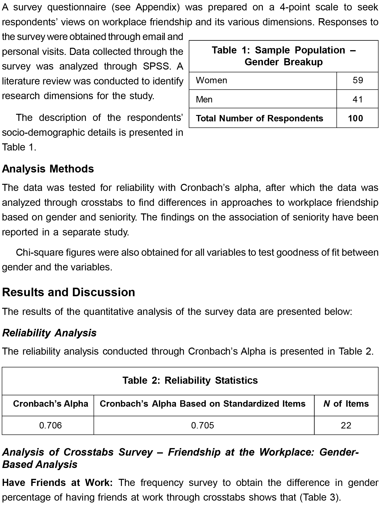 A survey questionnaire (see Appendix) was prepared on a 4-point scale to seek respondents' views on workplace friendship and its various dimensions. Responses to the survey were obtained through email and personal visits. Data collected through the survey was analyzed through SPSS. A literature review was conducted to identify research dimensions for the study.