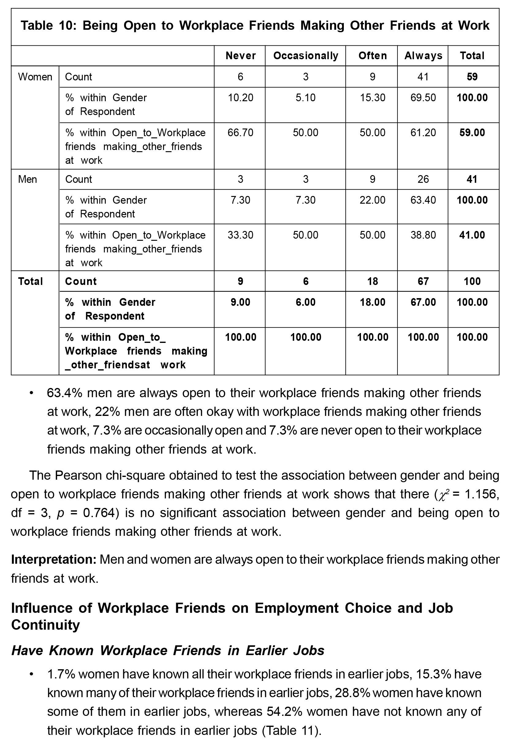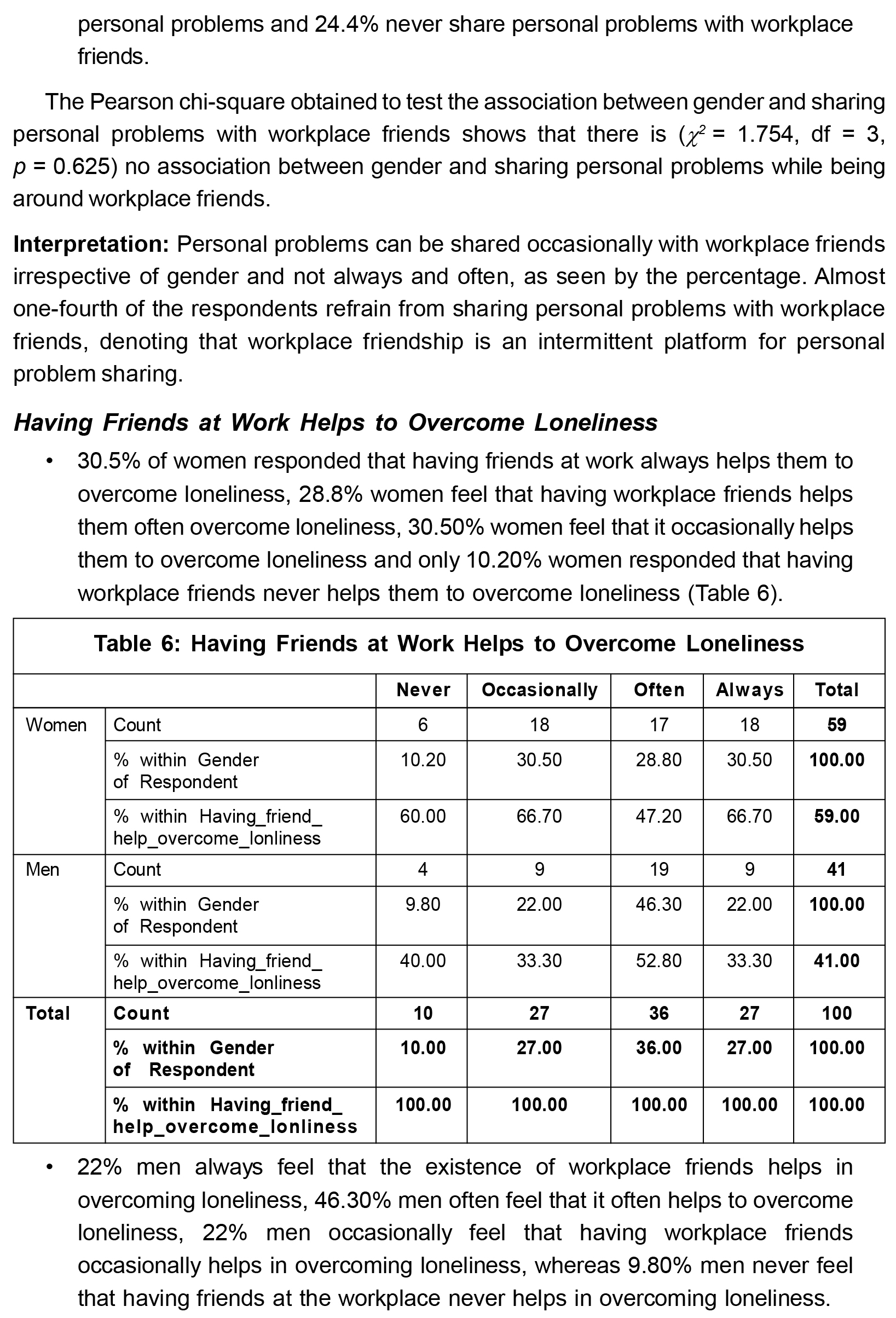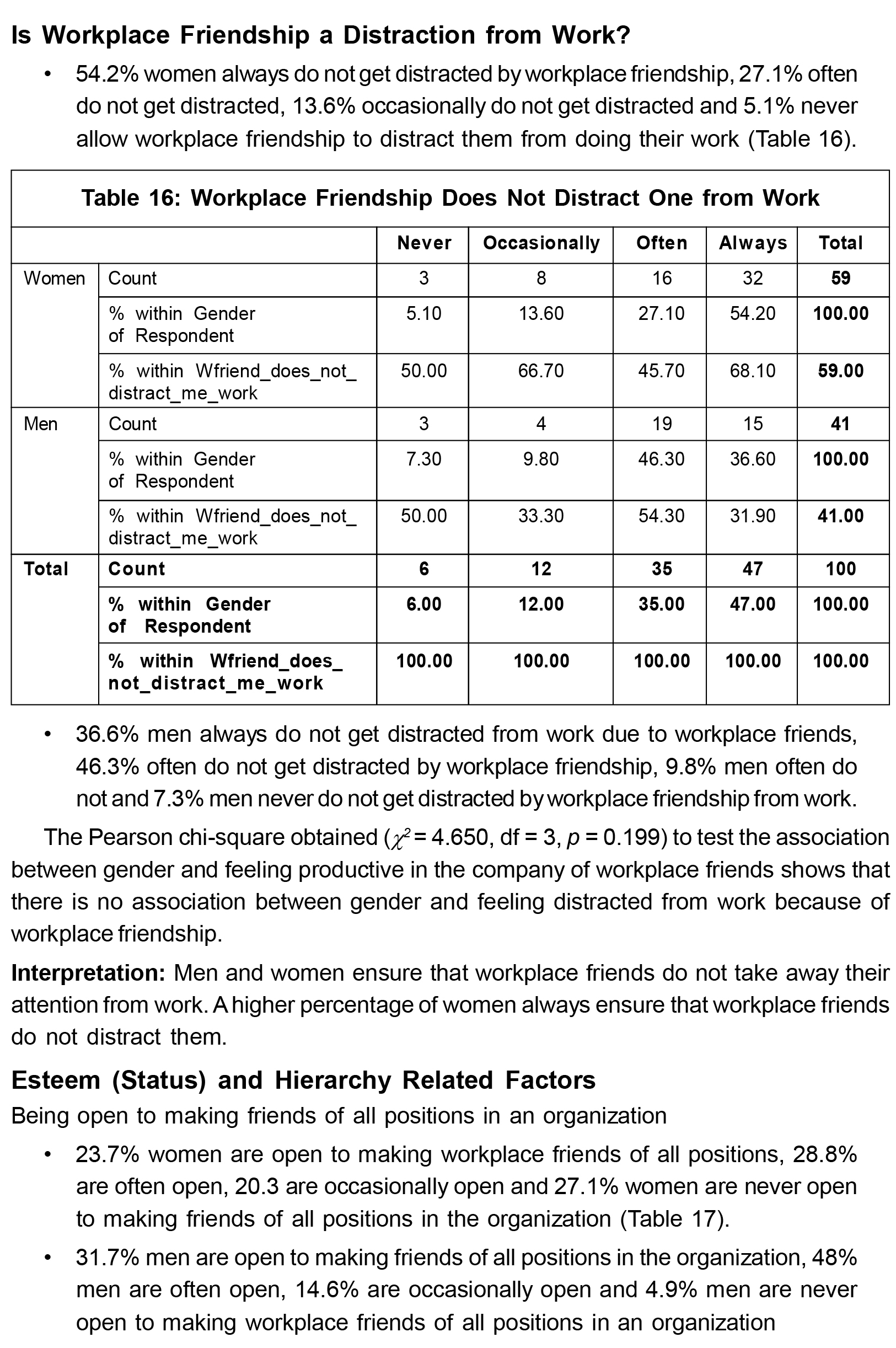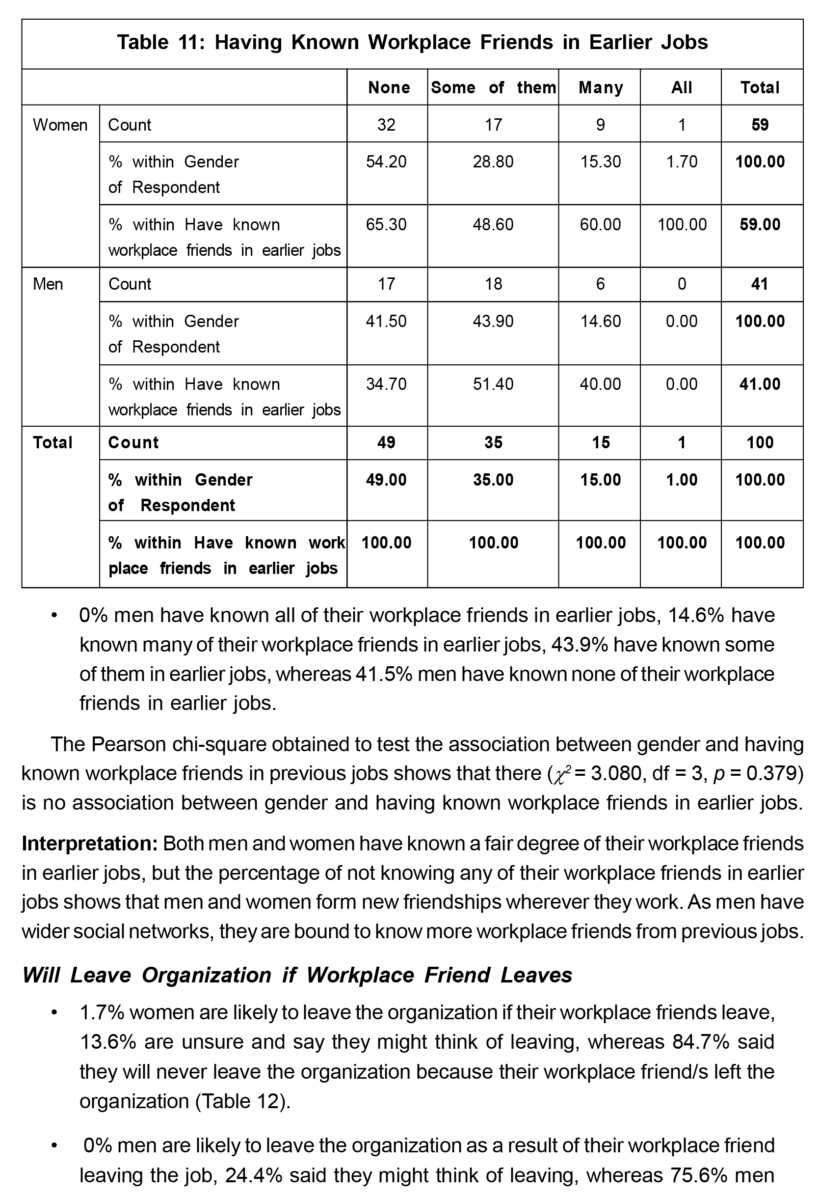 Workplace friendship has been widely researched in Western work contexts. However, performance components such as productivity, reward and equity and their relationship with workplace friendship in India remains unexplored. Social groups in organizations and their impact on work find their place in industrial relations, industrial unrest. Workplace friendship is sometimes viewed negatively as an undesirable offshoot of group formation at work. Gossip, grapevine and unionism are often attributed to friendship. The life-skill dimension of workplace friendship as also the organizational experience that workplace friendship provides, is often ignored. This study is essential to understand friendship at work and its impact on workplace behavior and performance from the gender perspective.