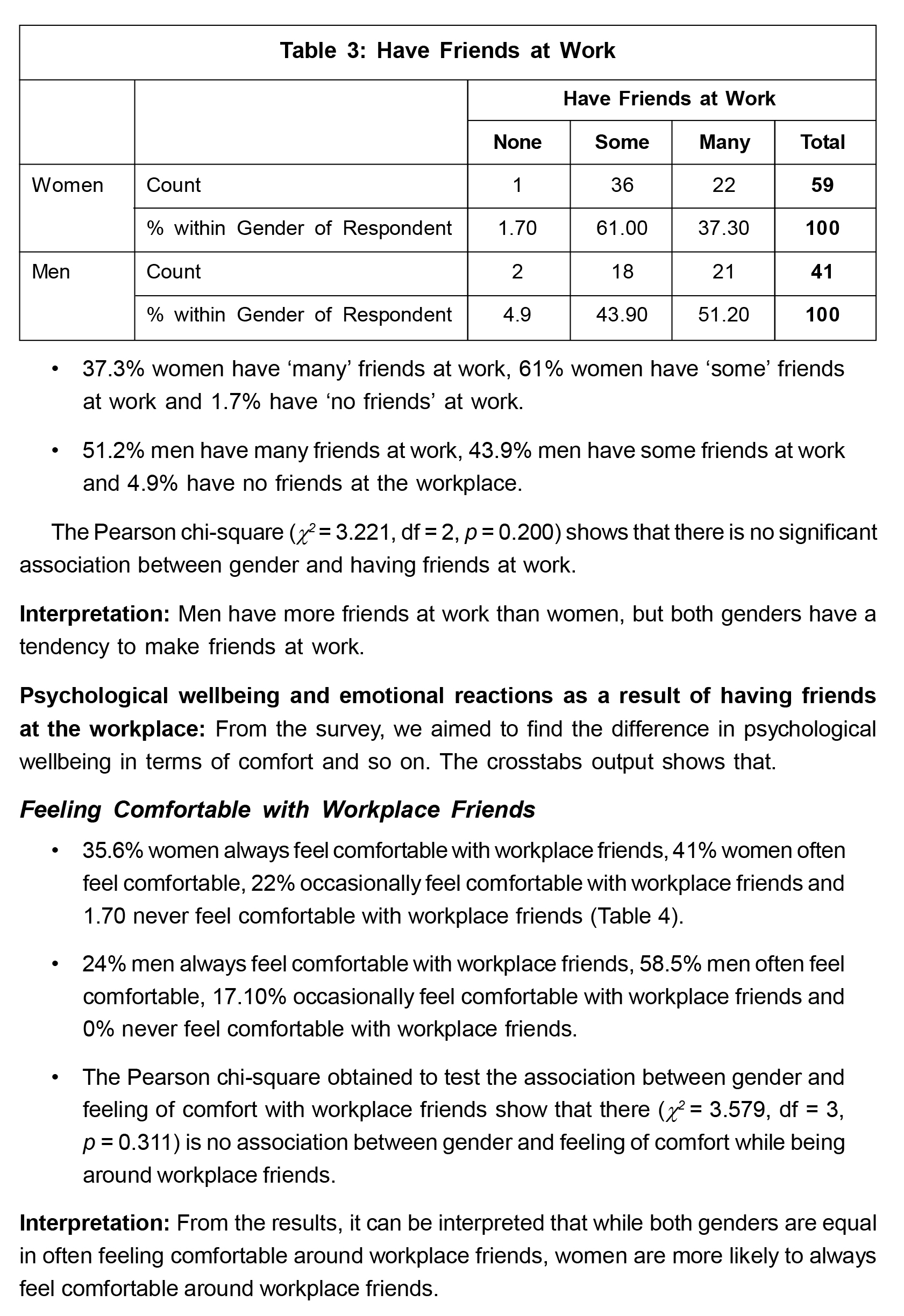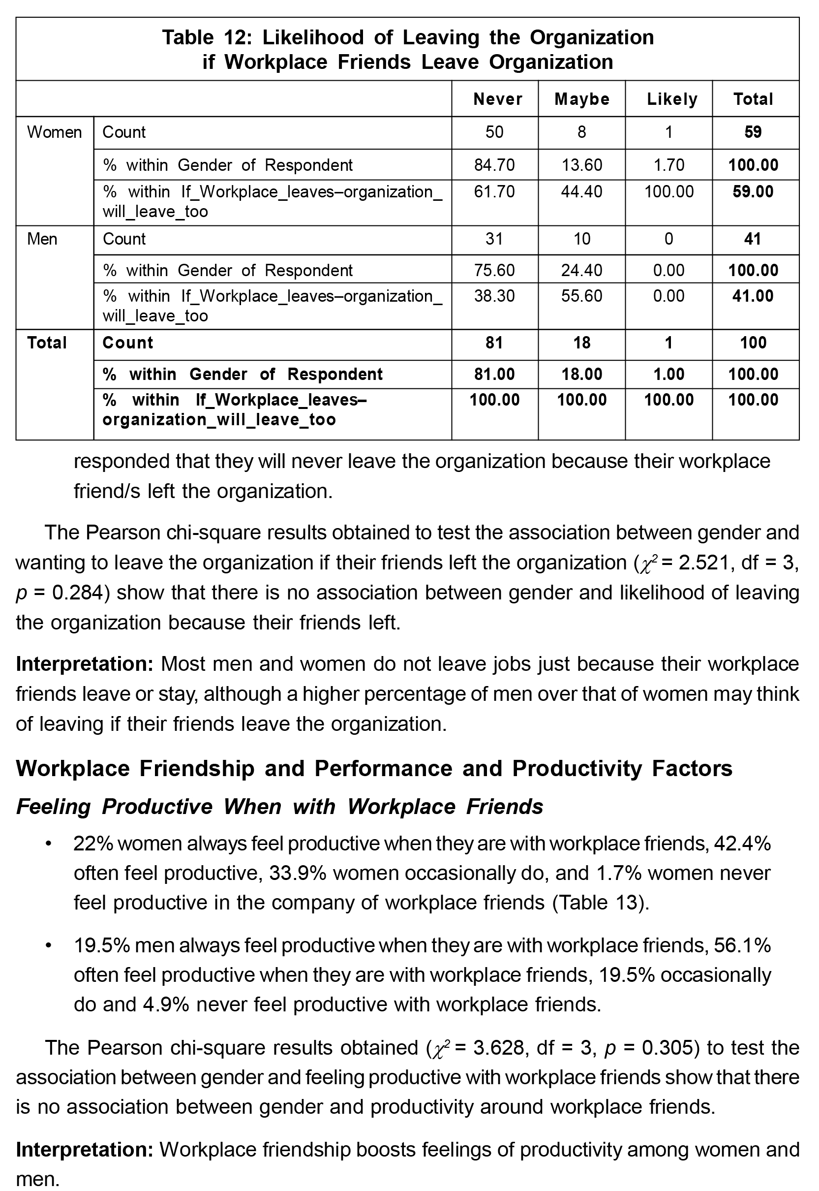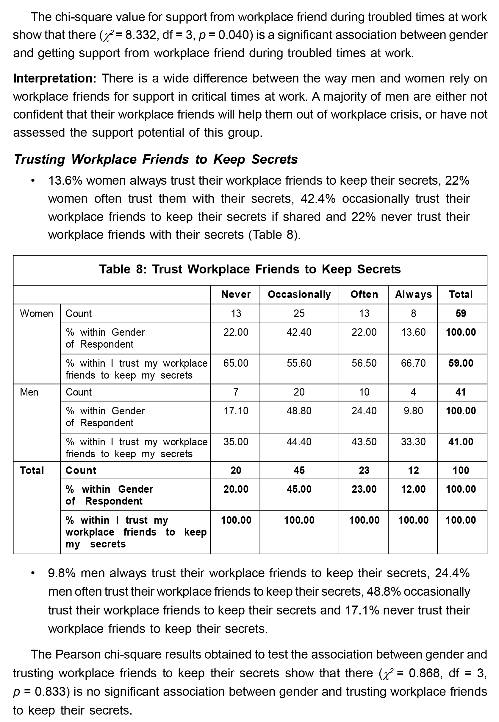 Workplace friendship has been widely researched in Western work contexts. However, performance components such as productivity, reward and equity and their relationship with workplace friendship in India remains unexplored. Social groups in organizations and their impact on work find their place in industrial relations, industrial unrest. Workplace friendship is sometimes viewed negatively as an undesirable offshoot of group formation at work. Gossip, grapevine and unionism are often attributed to friendship. The life-skill dimension of workplace friendship as also the organizational experience that workplace friendship provides, is often ignored. This study is essential to understand friendship at work and its impact on workplace behavior and performance from the gender perspective.