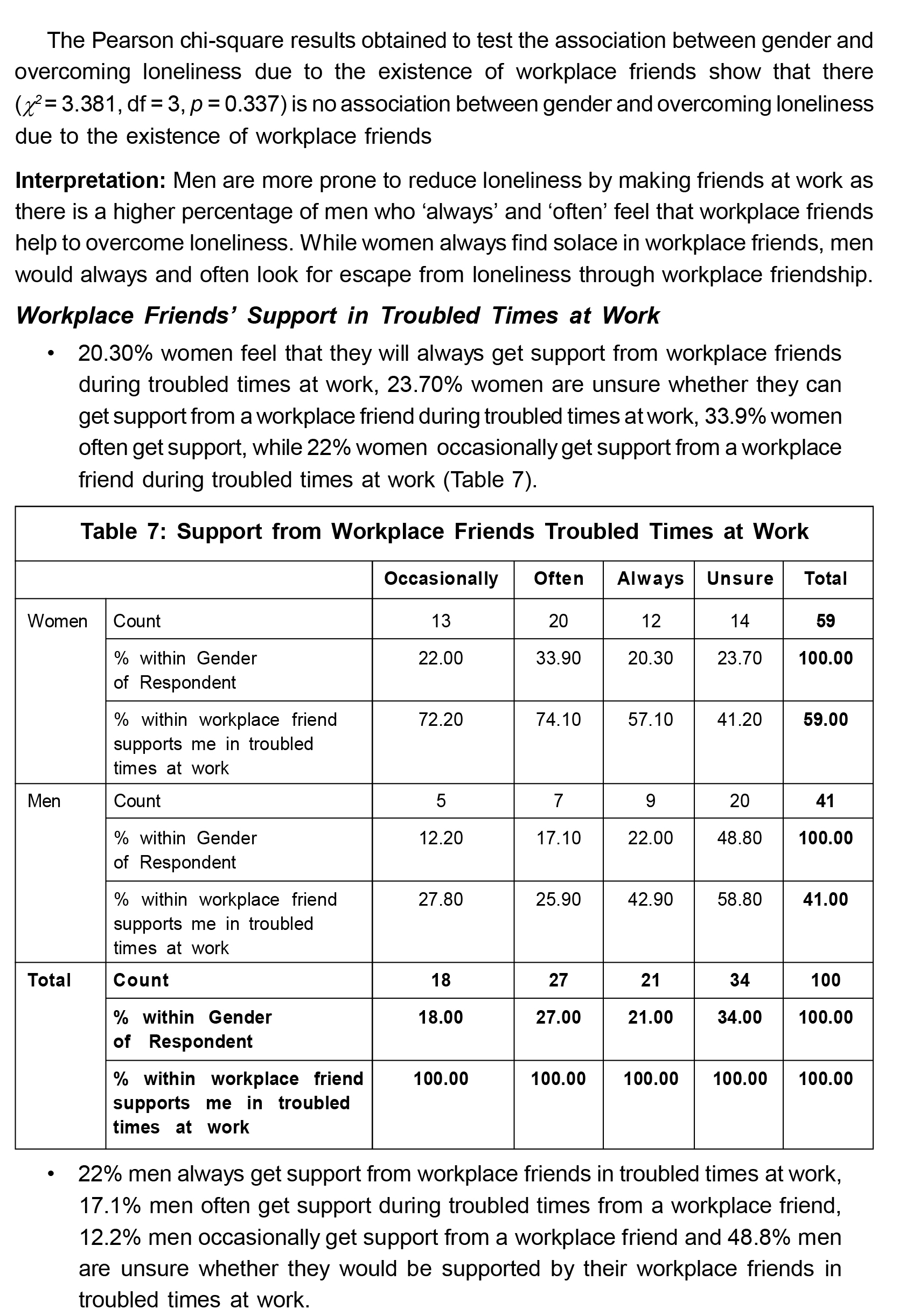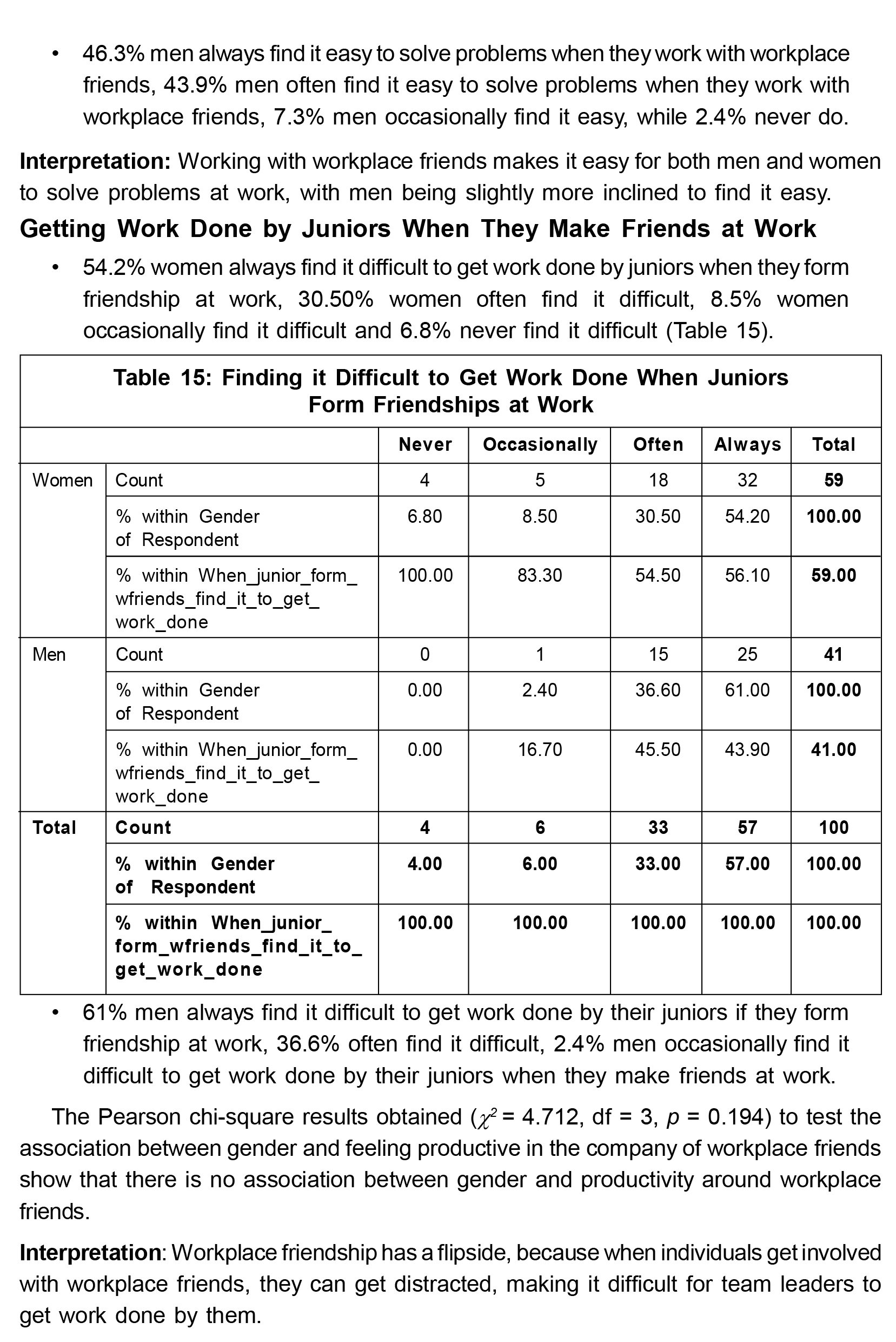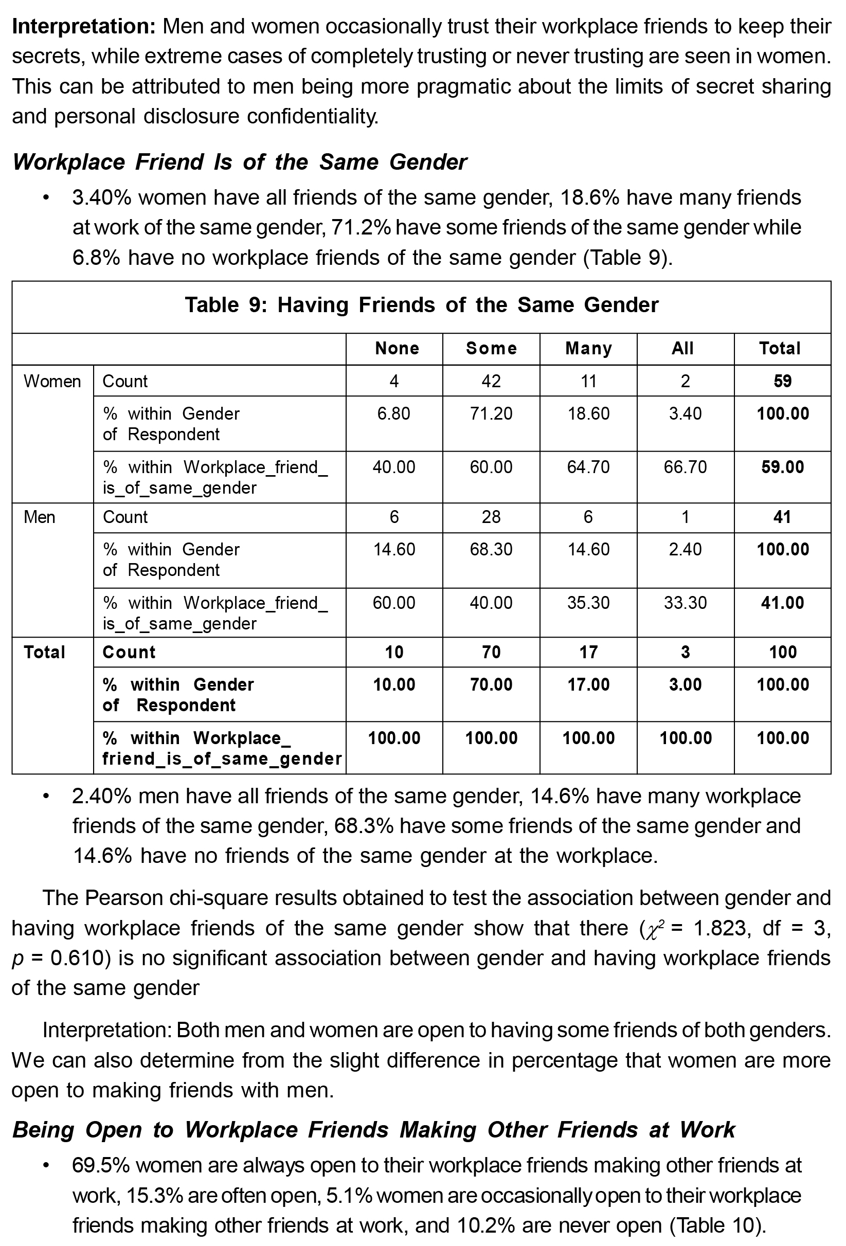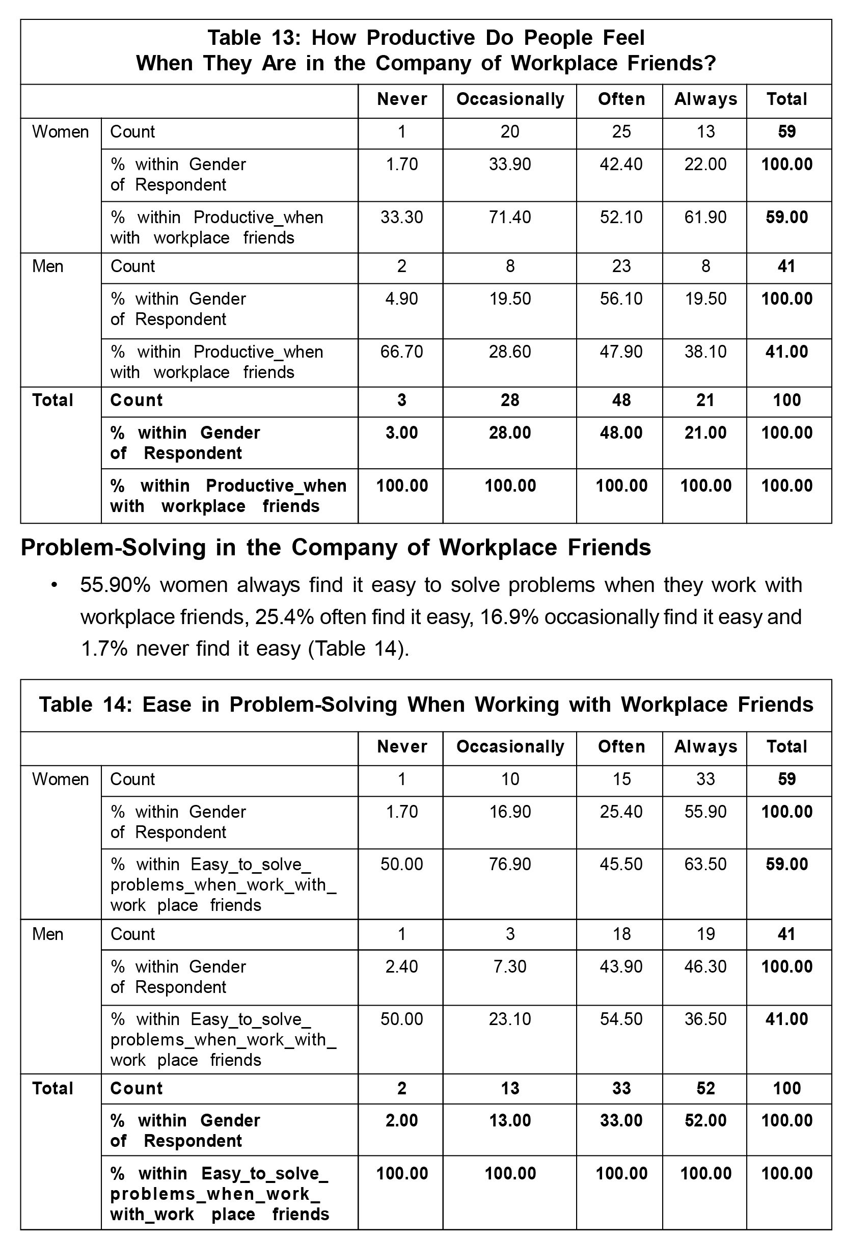 Workplace friendship has been widely researched in Western work contexts. However, performance components such as productivity, reward and equity and their relationship with workplace friendship in India remains unexplored. Social groups in organizations and their impact on work find their place in industrial relations, industrial unrest. Workplace friendship is sometimes viewed negatively as an undesirable offshoot of group formation at work. Gossip, grapevine and unionism are often attributed to friendship. The life-skill dimension of workplace friendship as also the organizational experience that workplace friendship provides, is often ignored. This study is essential to understand friendship at work and its impact on workplace behavior and performance from the gender perspective.