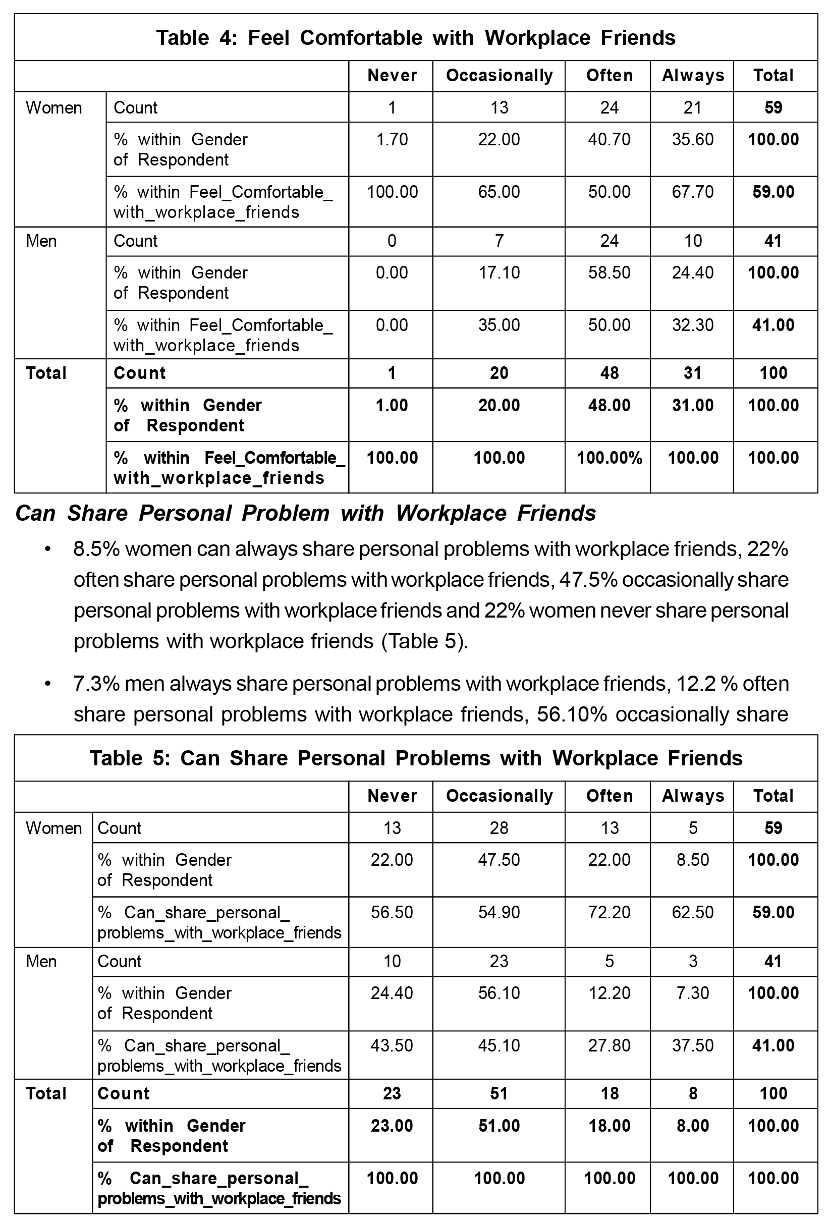The study provides critical insights on workplace friendship and its relationship with gender. From the perspective of psychological wellbeing, women are always comfortable with making workplace friends. Women and men intermittently share personal problems with workplace friends and men look to alleviate loneliness through workplace friendship. The study shows that women and men occasionally trust workplace friends and share personal secrets. Personal disclosure is intermittent in workplace friendship. Men engage in more same gender friendships at work than women.