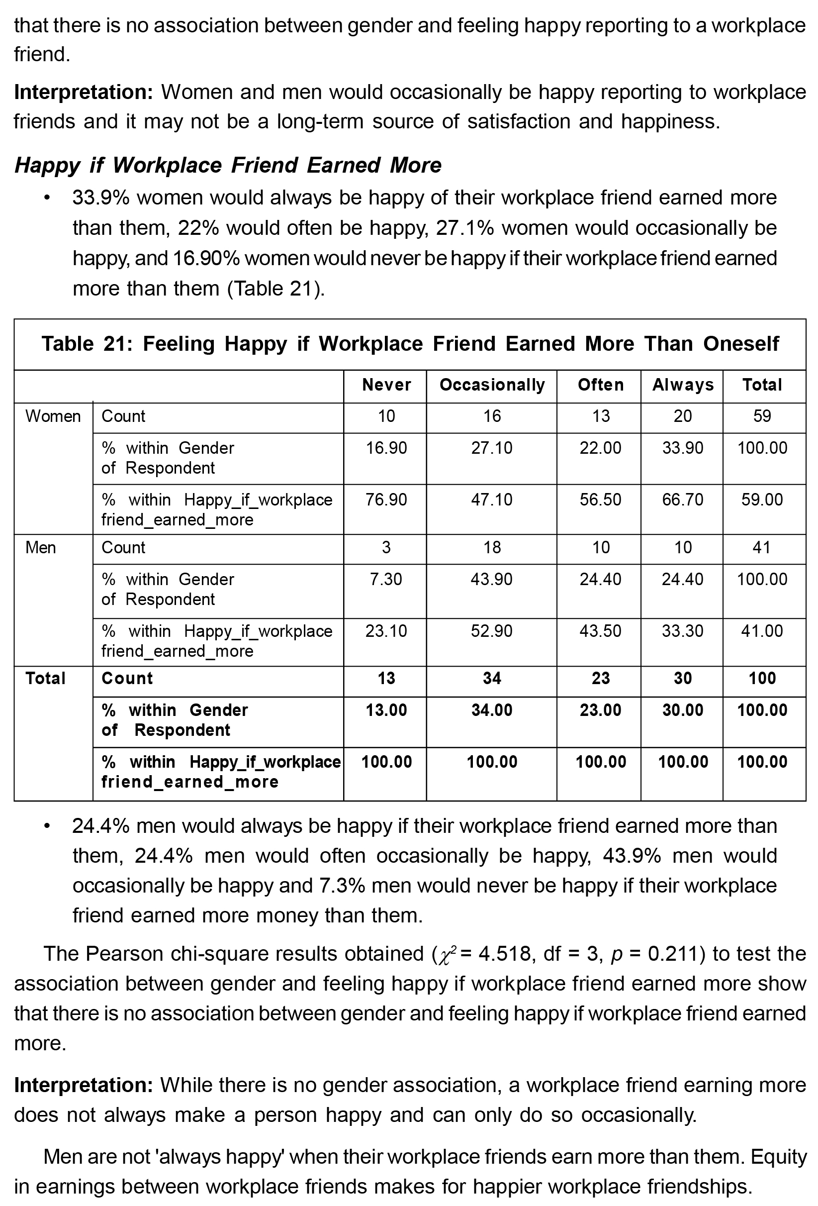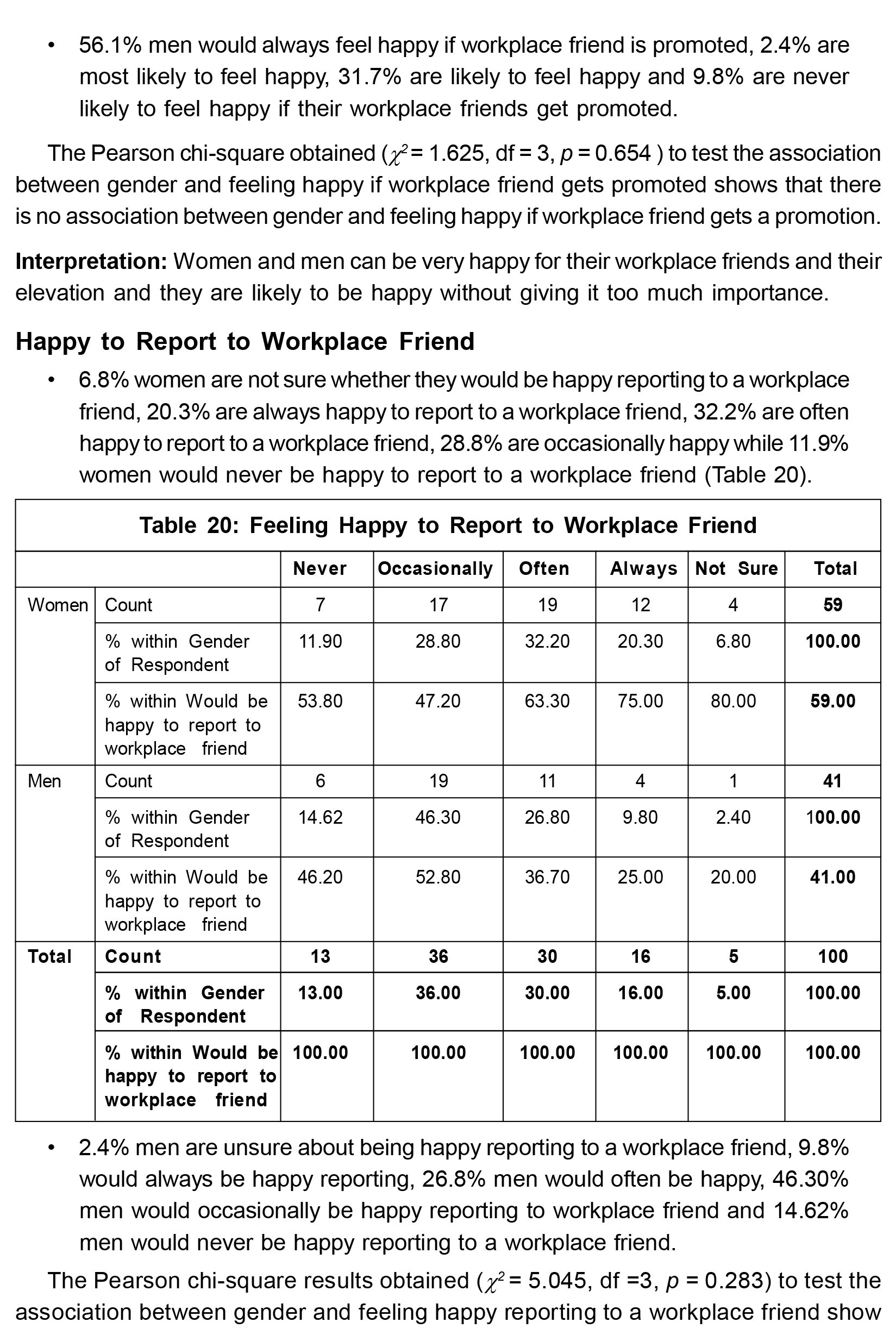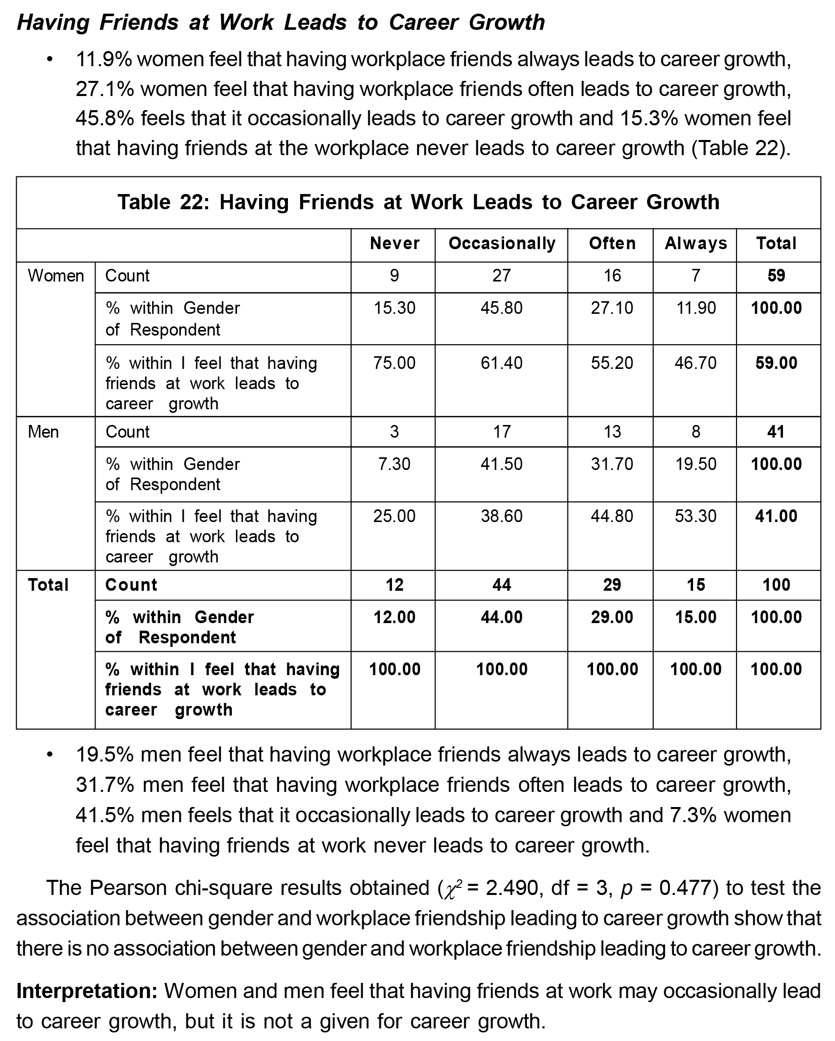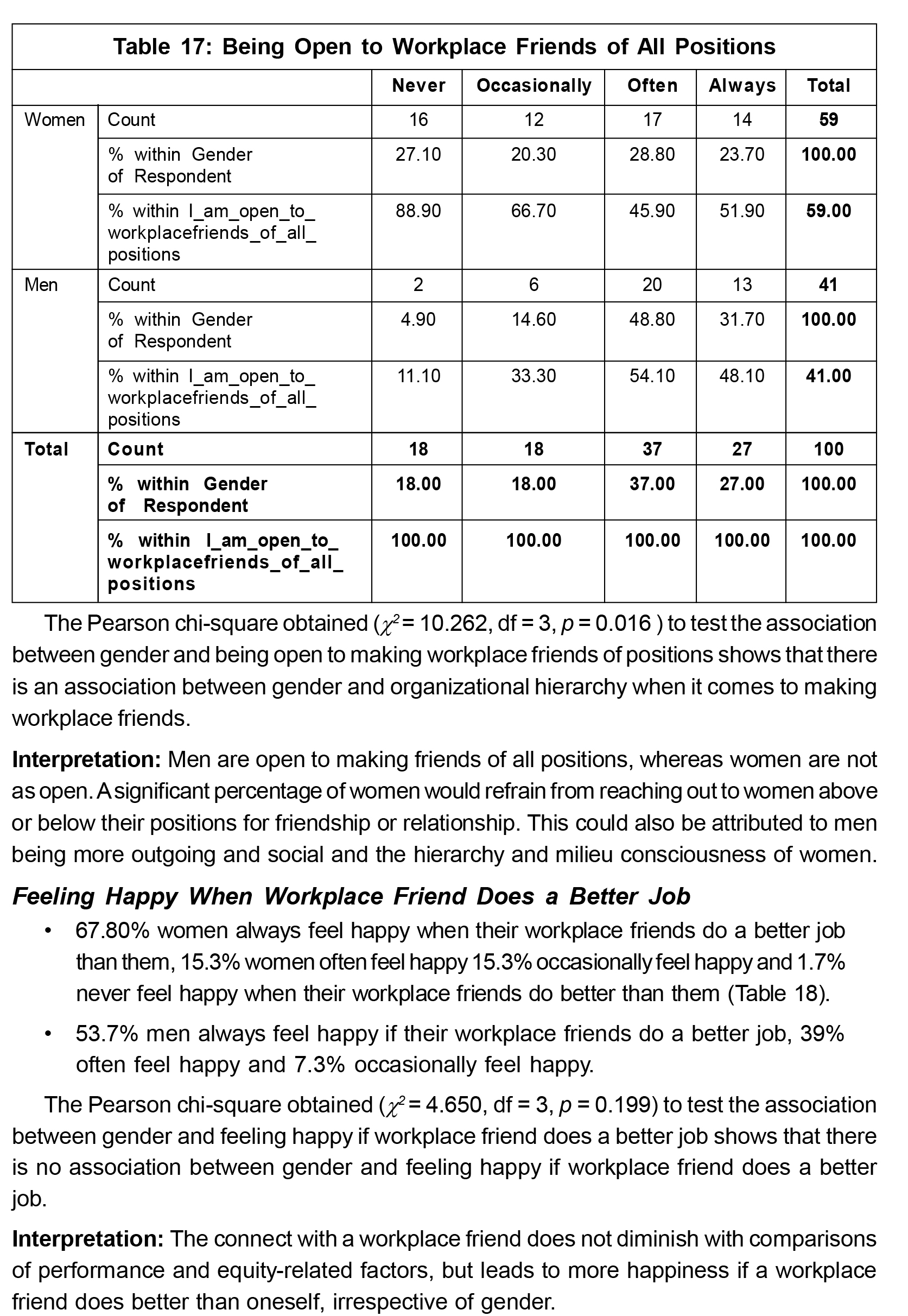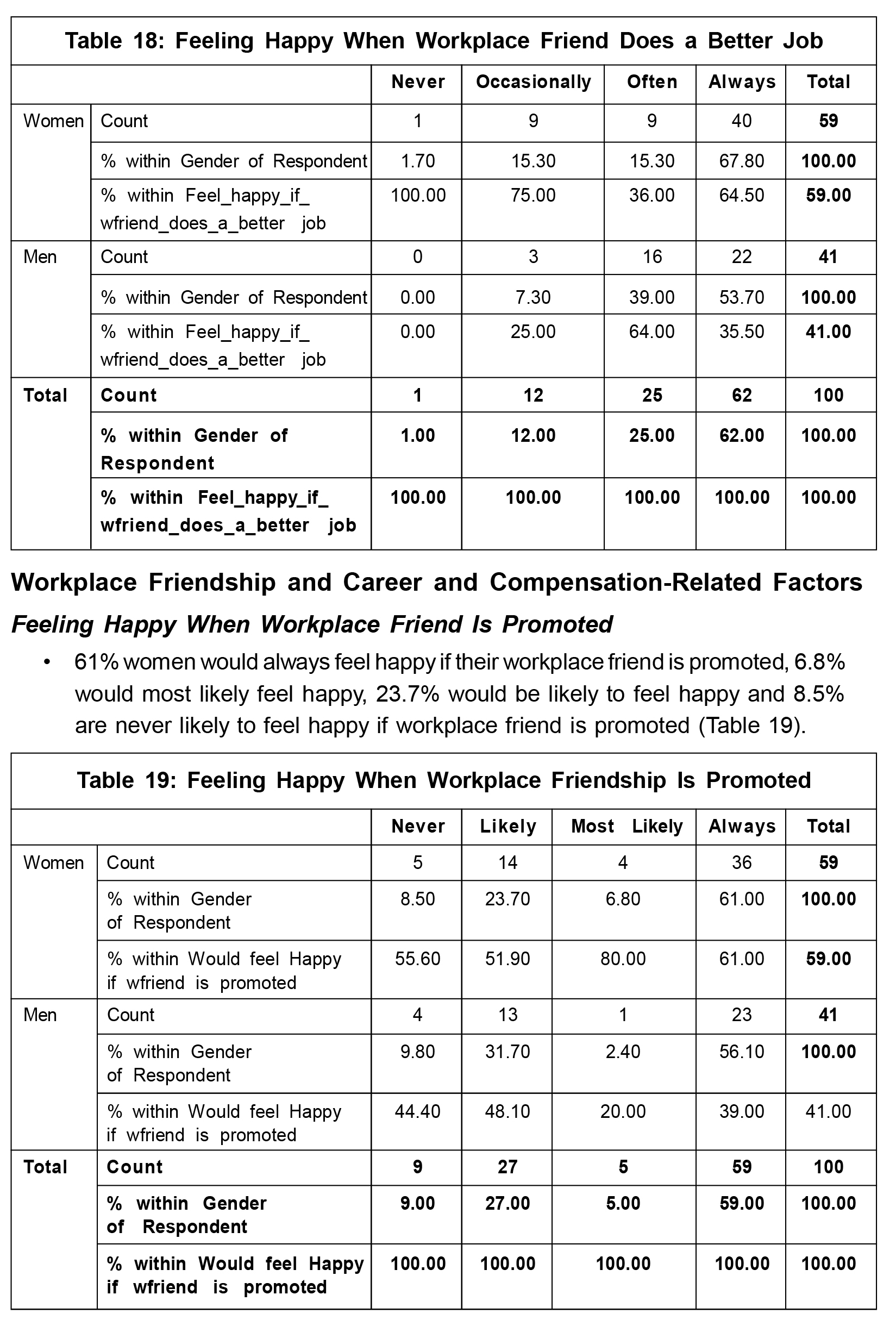 Hierarchy within the organization does not come in the way of friendship for men. Women and men are equally happy when workplace friends do better than them and get promoted, but reporting to a promoted workplace friend may not be a long-term choice. As for equity in earnings, women and men are not very happy with their workplace friends earning higher pay packages than them. Women and men agree that 'having a vital friend' at work leads to career growth.