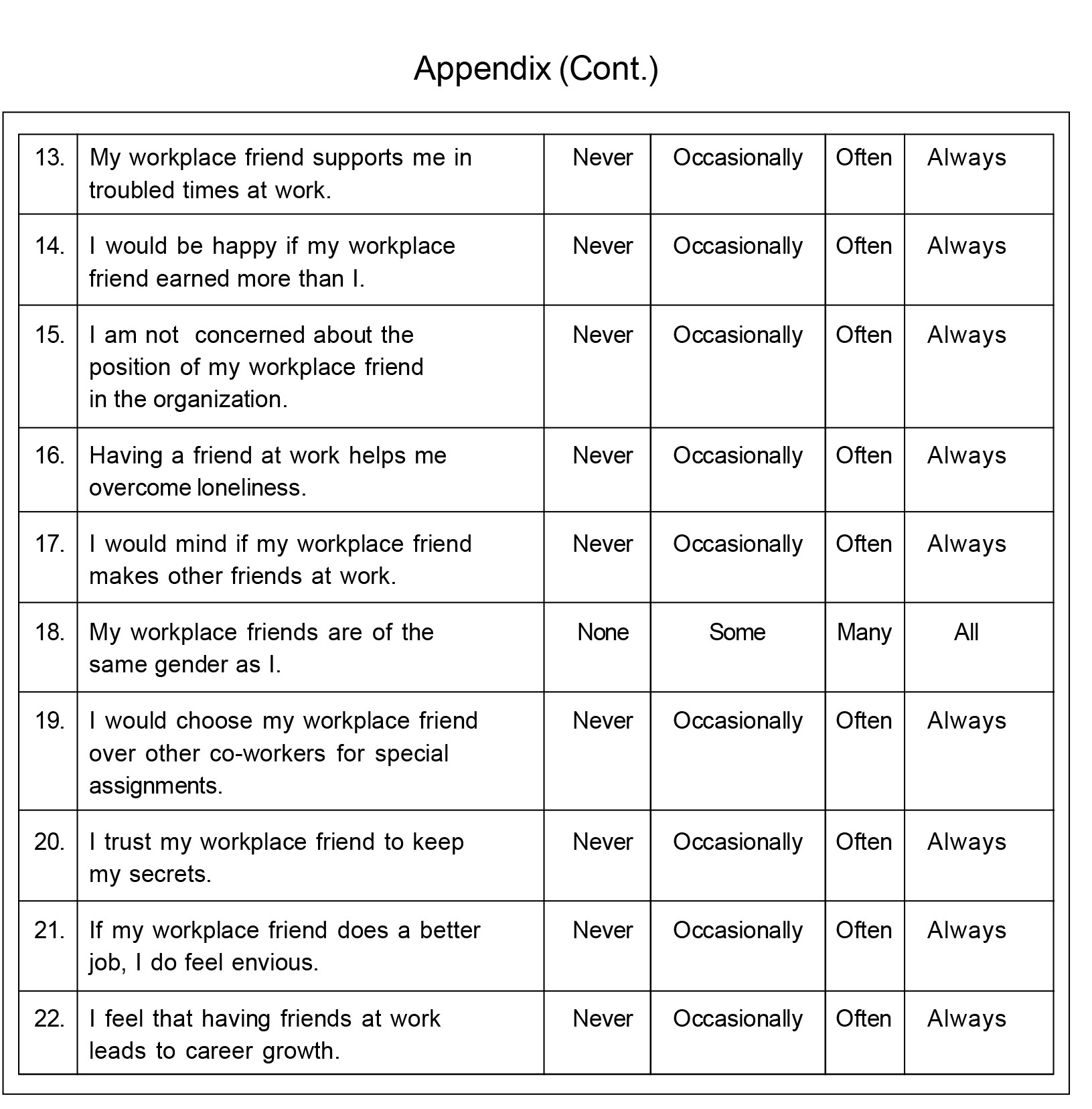 The study does not include workplace romance, workplace attraction and cross-gender intimacy, which are often associated with studies related to friendship at work and gender association.