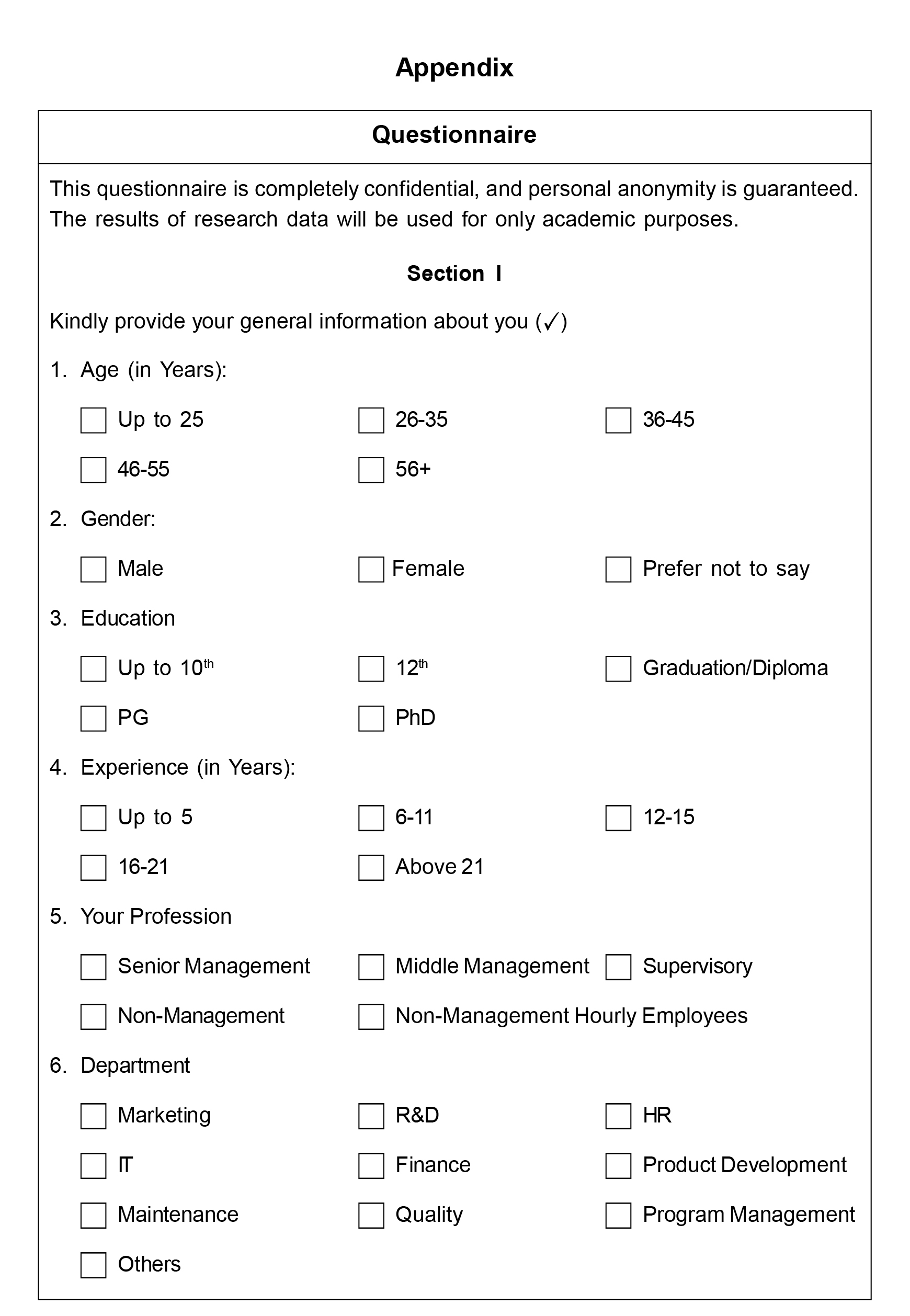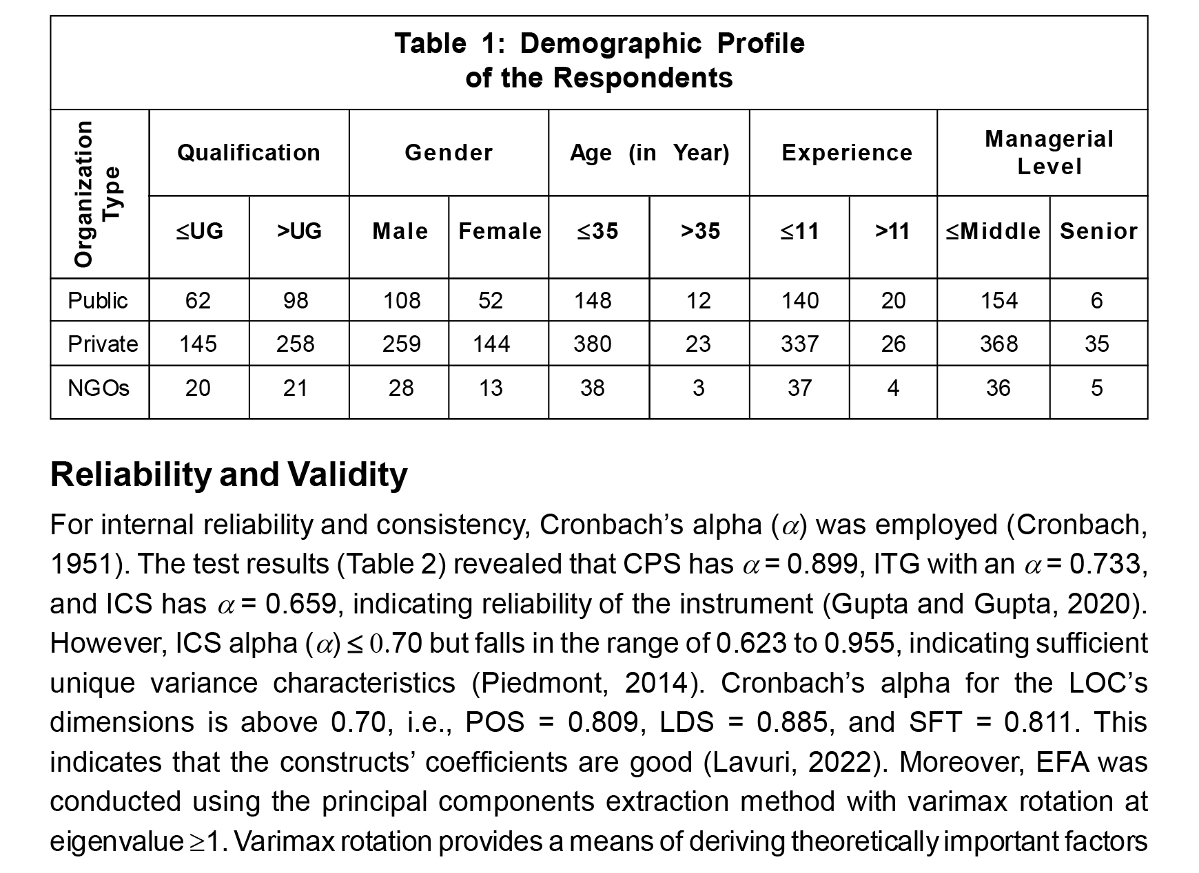 Random sampling was used to collect data between April 2020 and September 2021 from various professionals working in various sectors in India. 80% of the data was obtained using Google Forms (see Appendix) from an organization in Delhi NCR region. The sample comprised 50 employees with '10 years of experience. The study identified 2,676 potential respondents, however, only 726 completed the survey, of which we accepted only 604 sampled responses. The literature also indicates that the adequate sample size for research is 1:5 per variable (Gupta and Gupta, 2020). The main objective of this study is to examine the effect of PLA on LOC on three dimensions each. Also, the sample size for the infinite population gave n = 323 as adequate size. Thus, we consider it adequate for the study. The demographic profile of the respondents is shown in Table 1.