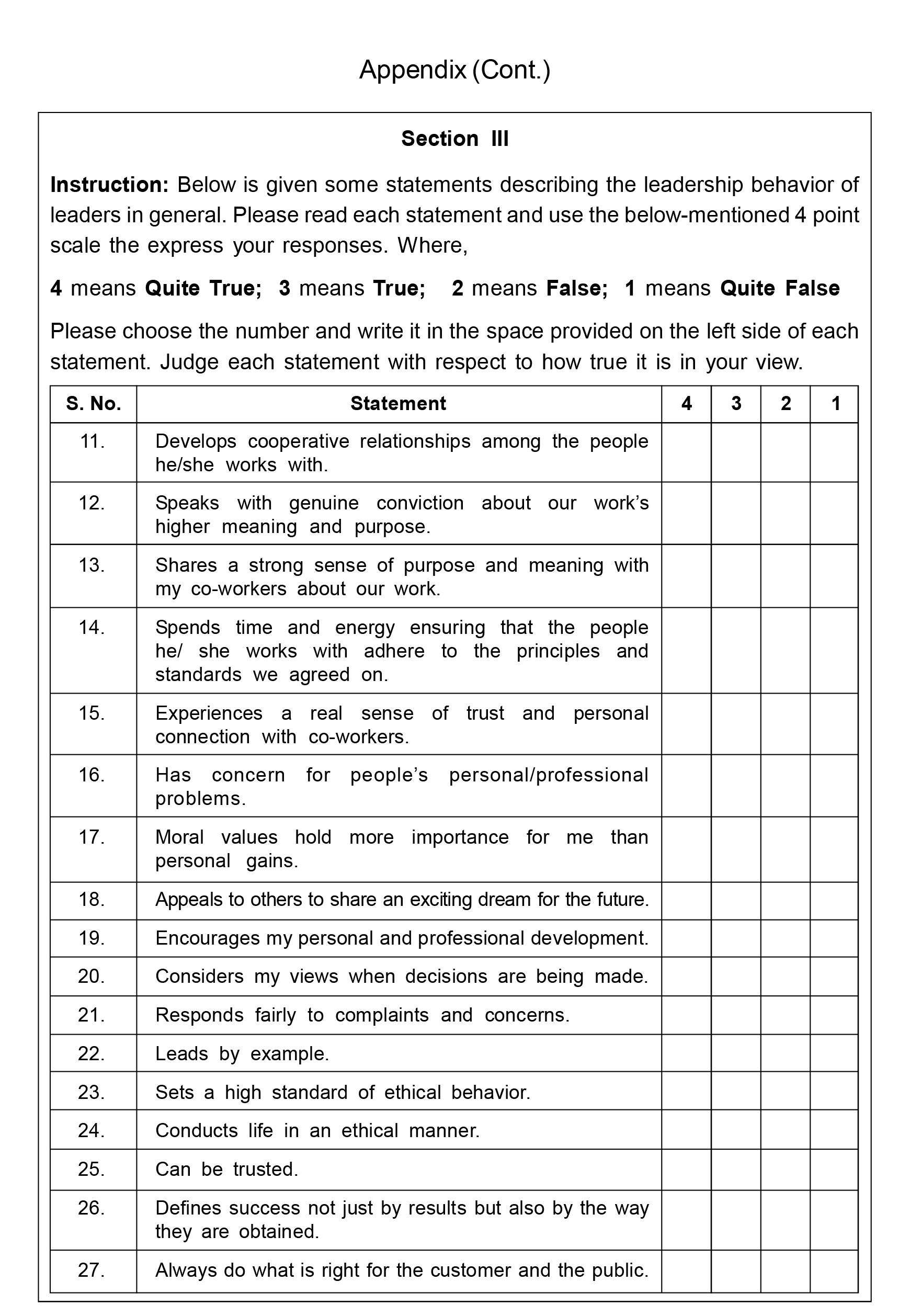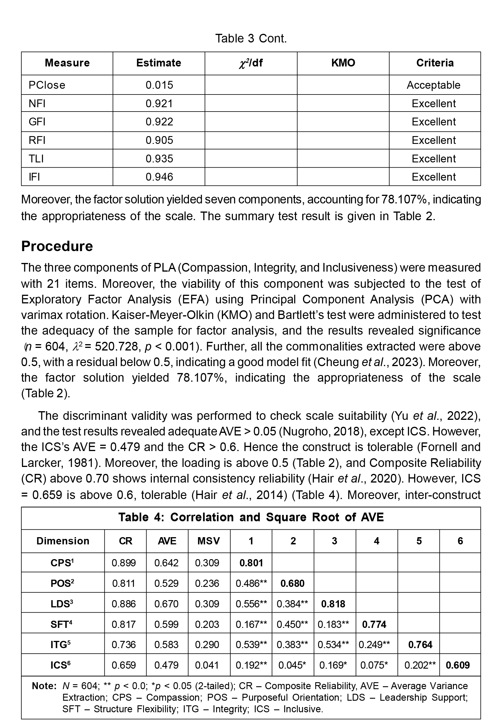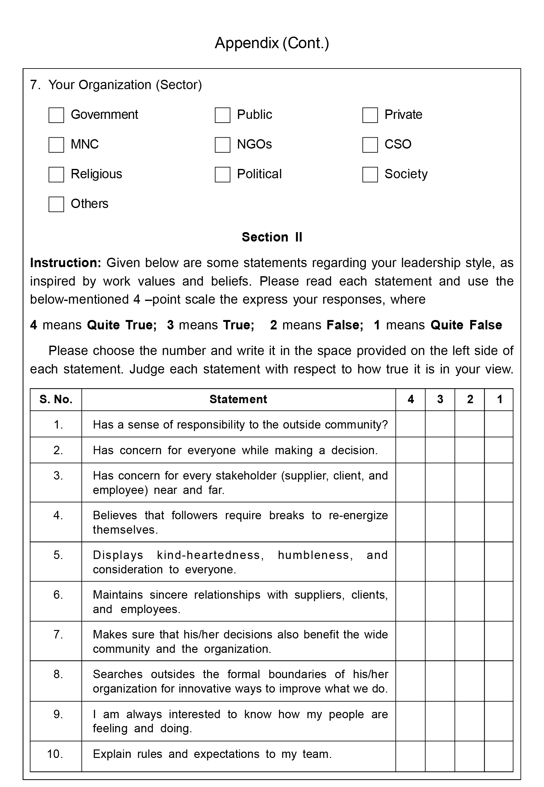 The study adopted the "Integral Leadership Questionnaire" to measure PLA (Sengupta, 2021) and the "Energy-Based Organizational Culture" item to measure LOC (Sengupta, 2021). The items are measured on a 4-point scale, where 1 = quite false, 2 = false,