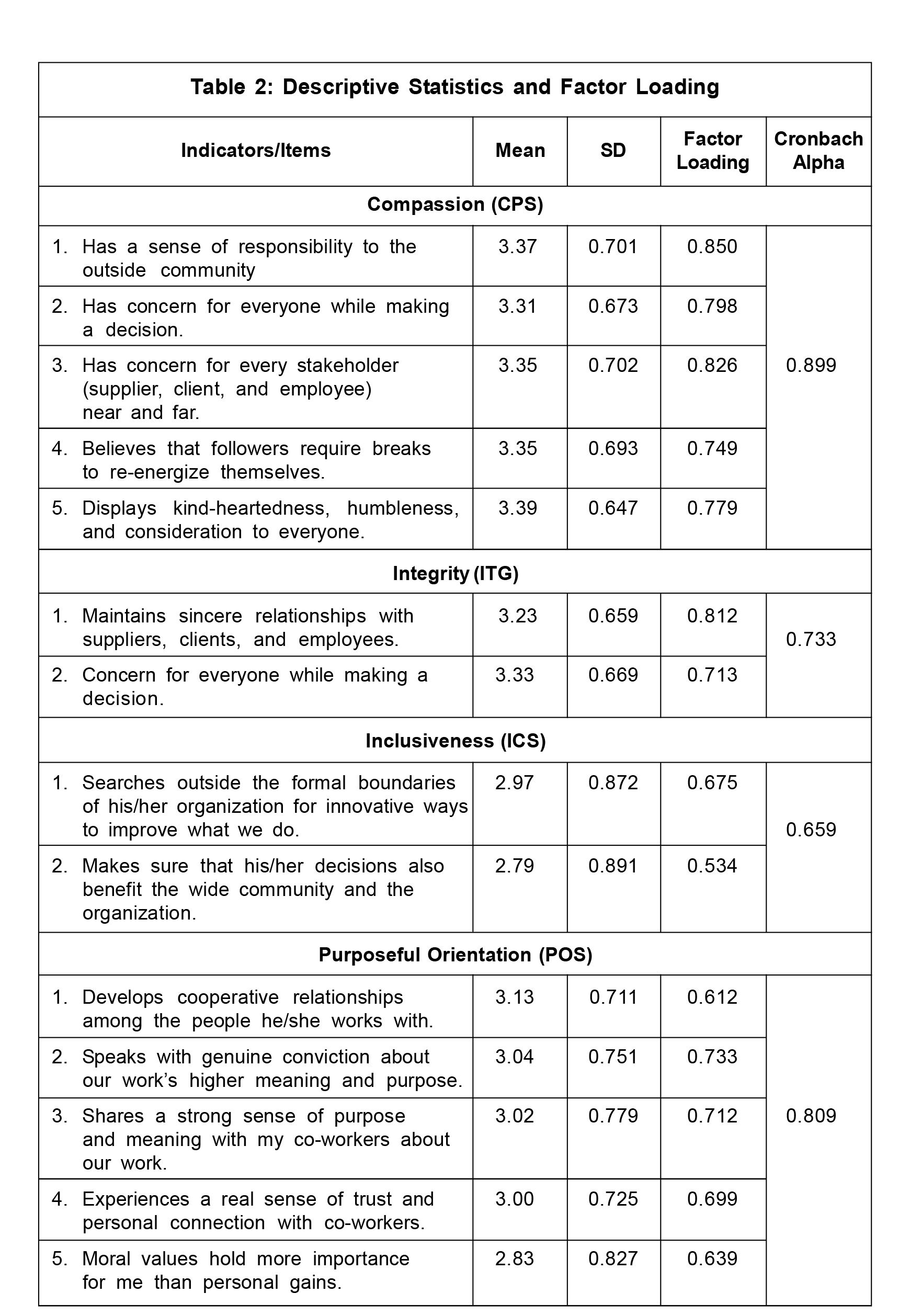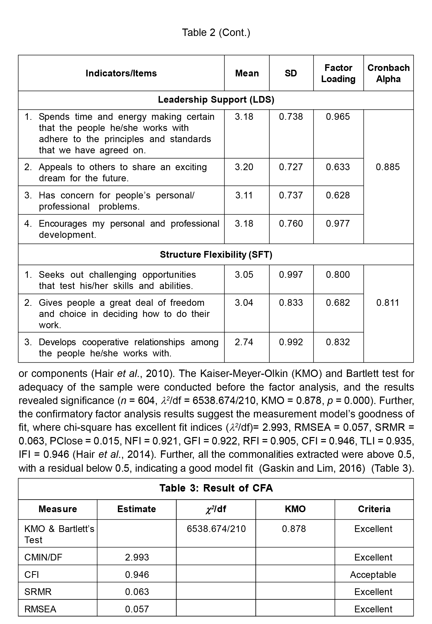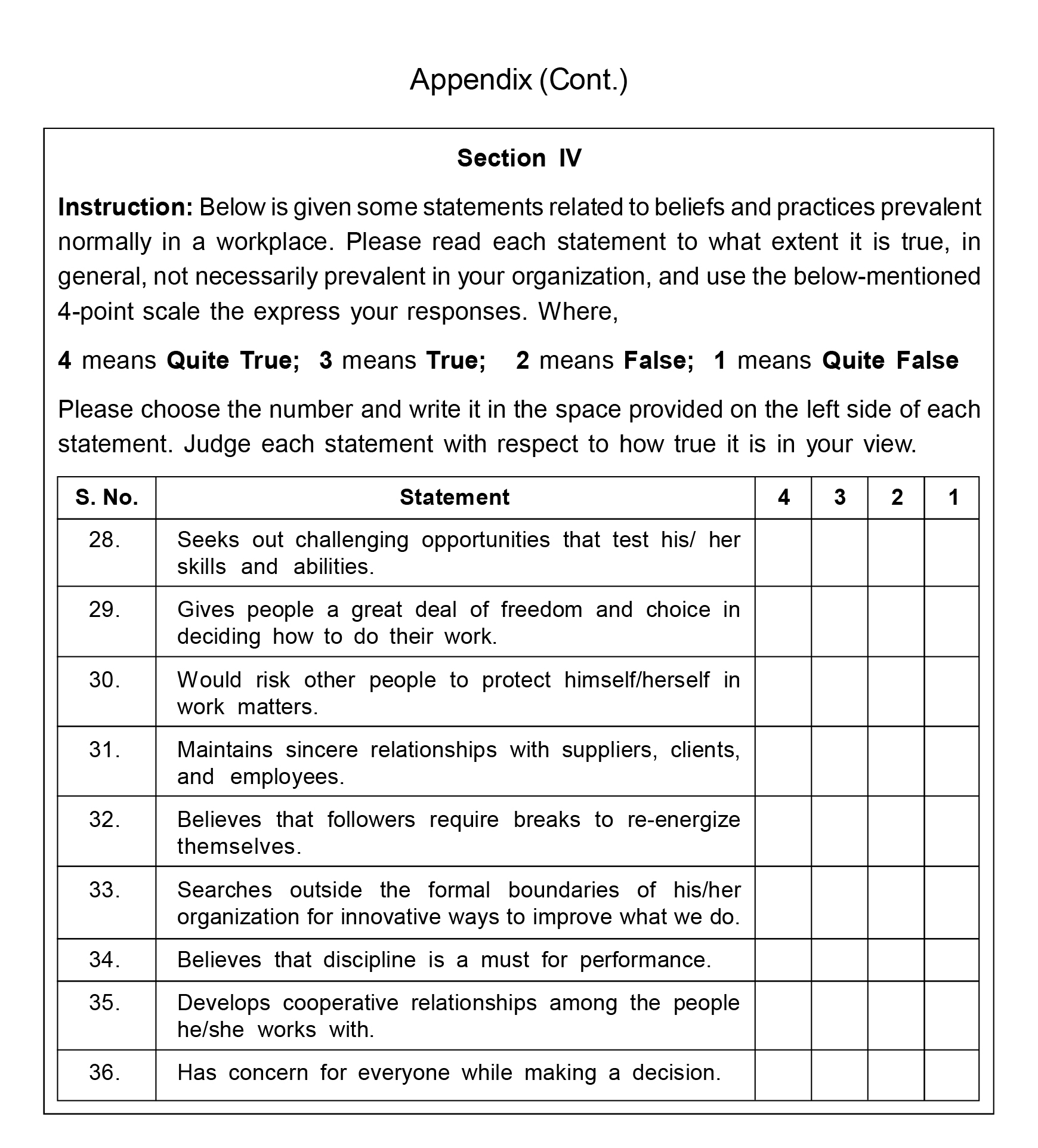 The study adopted the "Integral Leadership Questionnaire" to measure PLA (Sengupta, 2021) and the "Energy-Based Organizational Culture" item to measure LOC (Sengupta, 2021). The items are measured on a 4-point scale, where 1 = quite false, 2 = false,