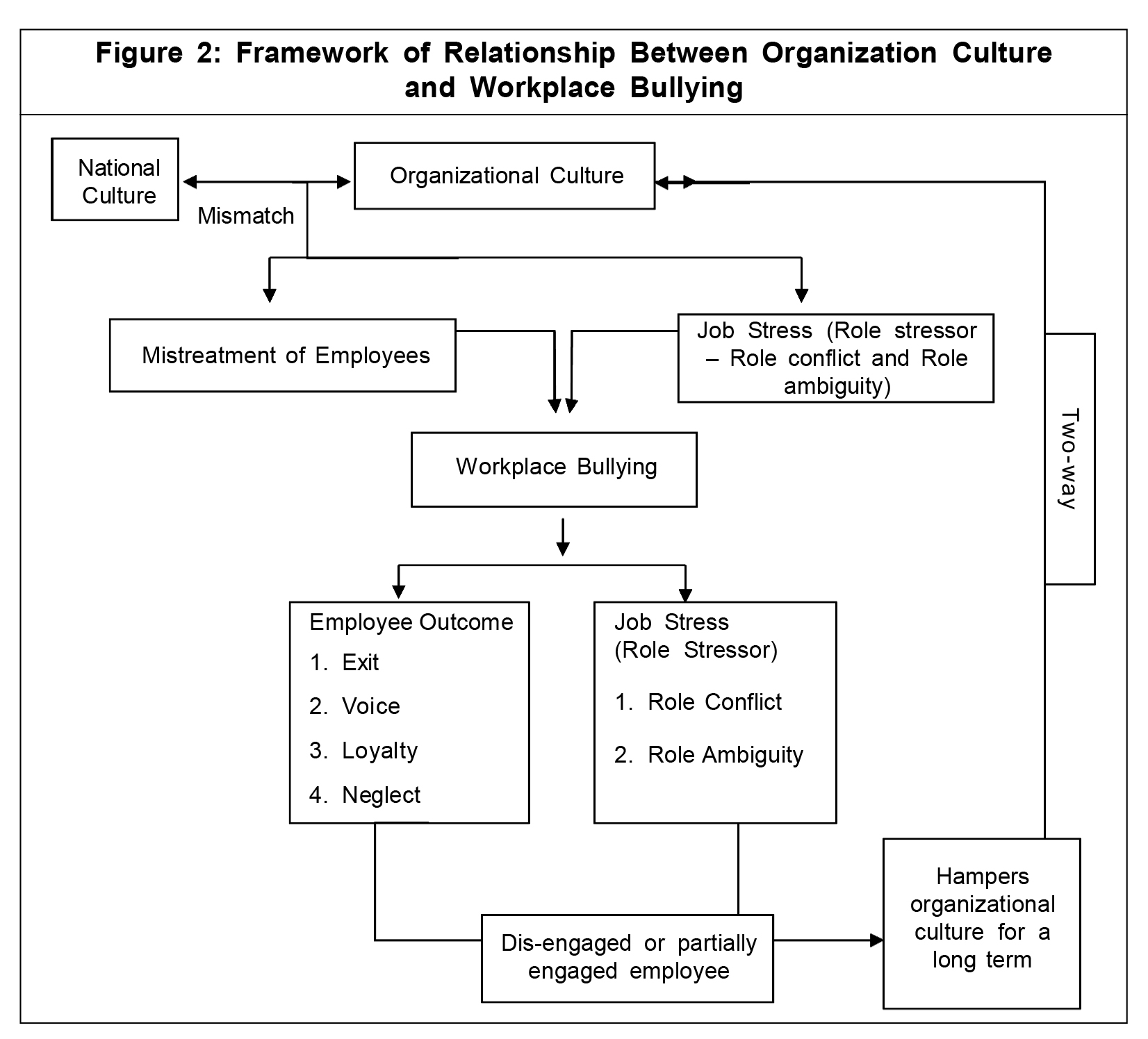 For sustaining organizational culture, it is important to consider national culture as well, since both are closely related (Szydlo and Grzeae-Buklaho, 2020). A mismatch between national culture and organizational culture can lead to negative impact such as employee stress and mistreatment of employees (Joiner, 2001). There are many types of mistreatments reported in the literature. A few of them are: disrespect and abuse (Madhiwalla et al. 2018), workplace bullying (Pilch and Turska, 2015), harassment (Einarsen et al., 2009), etc. On the other hand, work culture, such as job challenge, low trust, low support for innovative environment, etc., also influences the stress levels of the employees. The lower the positive environment in the organization, the higher the chances of stress to the employees (Suri and Arora, 2009). While stress arises from role stressors-role conflict and role ambiguity-it is a preliminary cause to ignite workplace bullying.