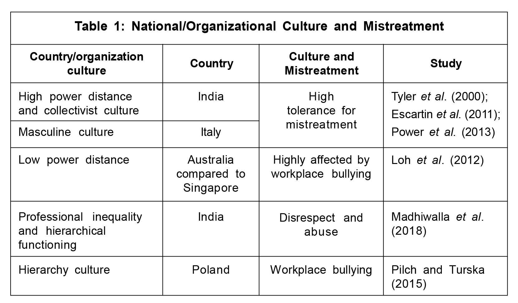 The mismatch between national and organizational culture in terms of employees' social belief and values, norms and belief in the organization leads to harmful employee outcomes such as job-related stress, bullying, etc. (Joiner, 2001). Table 1 demonstrates the mistreatment that employees experience as a result of the national or organizational culture.