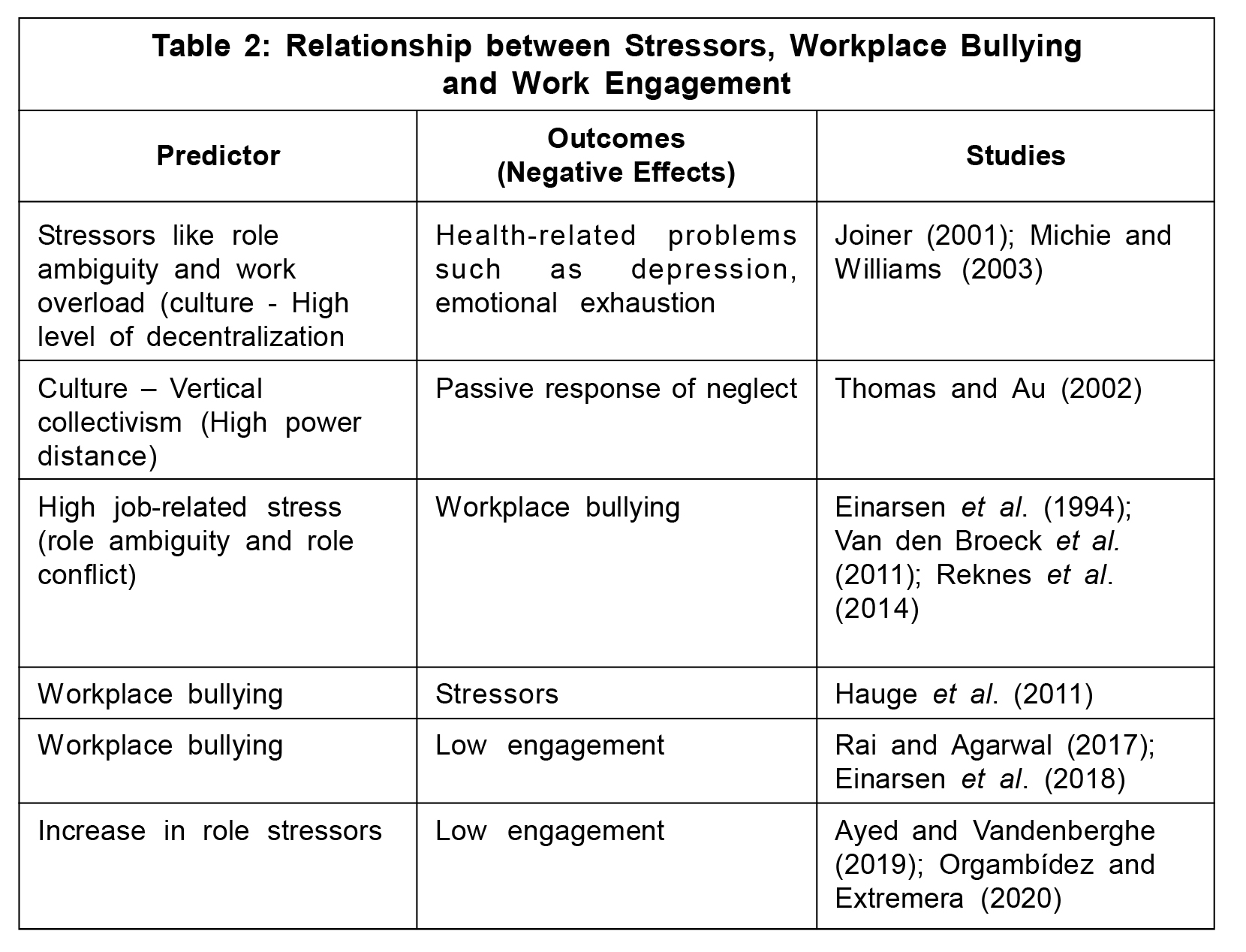 Both workplace bullying and stress have detrimental effects on work engagement. Employees exposed to workplace bullying do not feel engaged towards their work (Rai and Agarwal, 2017a). Many other researchers have also shown the detrimental effects of workplace bullying on work engagement (e.g., Einarsen et al., 2018). Similarly, increase in role stressors leads to low engagement from employees (Ayed and Vandenberghe, 2019). In other words, when stress level is high, engagement does not seem to have its positive effects (Orgambidez and Extremera, 2020). Negative environment arising out of bullying gets influenced by organizational culture (Salin, 2003). The organizational culture deals with various factors such as management influences, rules and regulations, risk-taking attitude of organization and leadership style (Rajalakshmi and Gomathi, 2016). To reduce workplace bullying, organizations must consider the organizational culture that prompts the employees to respond in behaviors that are unfavorable from the organization's viewpoint (Giorgi et al., 2015).