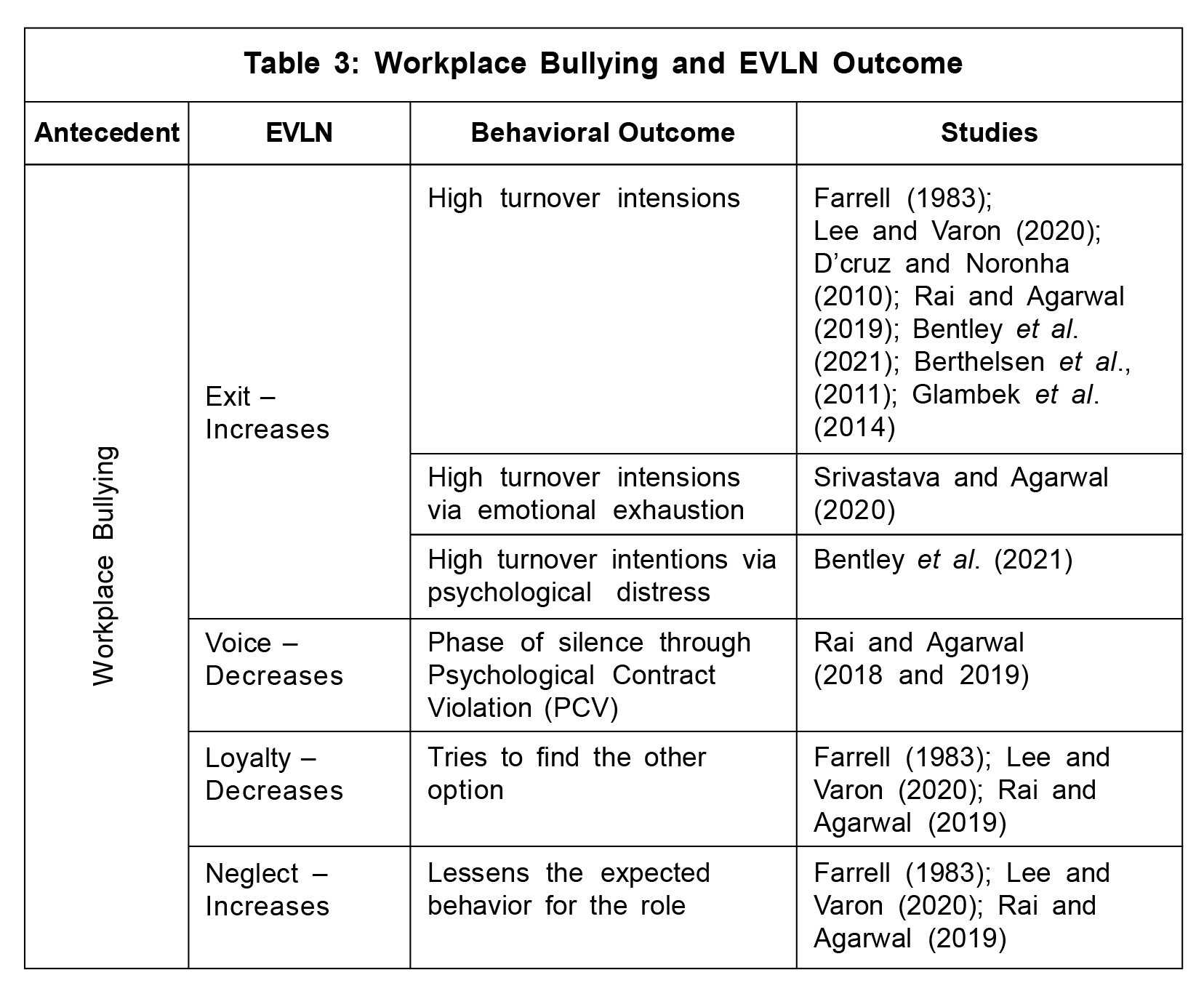 Limitations and Future Scope: The first limitation of this study is that it is purely based on literature review and does not have empirical evidence for the whole framework. Hence, future studies can be done to test the relationship between the factors and the process established in the framework. The second limitation is that with the help of the model, the paper identifies the issues that are already reported in the past research, but does not provide a solution to the issues, for instance, workplace bullying affecting the employees psychologically and organizations in terms of high attrition. Hence, future research can be done on factors that can mitigate workplace bullying and the behavioral/organizational outcomes. Also, this review is limited to the EVLN model, future research can be done on other types of behavioral outcomes as well.