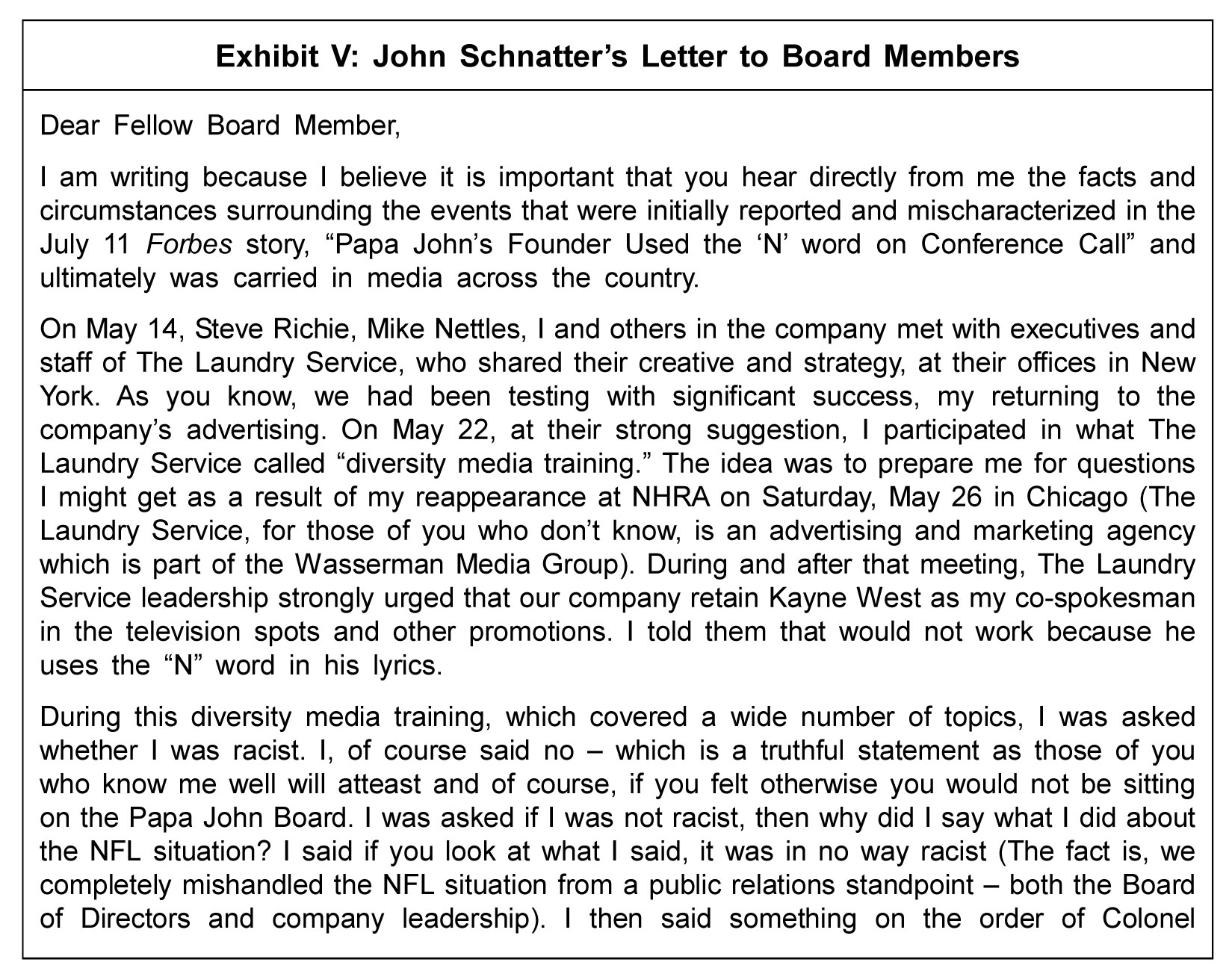 While the company was trying to distance itself from Schnatter, he came up with an allegation against the board of directors. On July 17, 2018, in a letter to Papa John's board, Schnatter wrote that he had made "a mistake" by stepping down as chairman and accused the board of not investigating the racial scandal. He claimed the board's decision was based on "rumor and innuendo"xxxvii (Refer to Exhibit V for more details). Vowing to fight the company over his ouster, Schnatter hired Los Angeles high-profile trial lawyer Patricia Glaser (Glaser) as his attorney.xxxviii