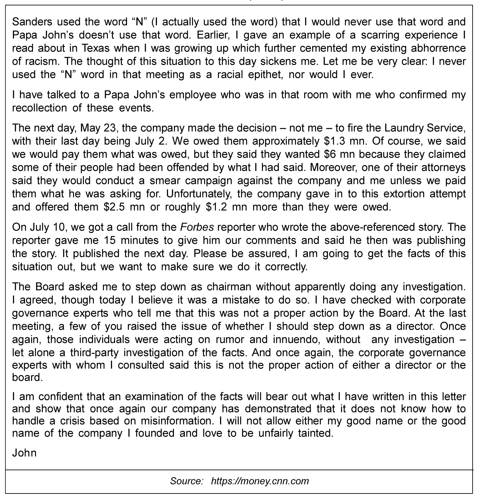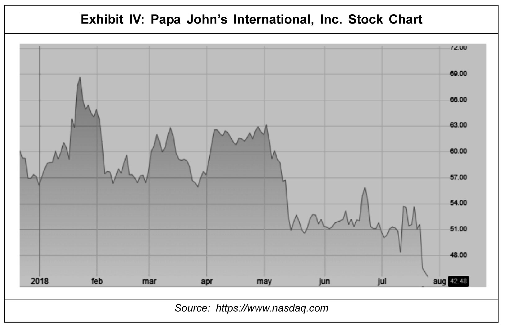 On July 11, 2018, Forbes reported that Schnatter had used the 'N-word' during a conference call in May. The conference call, which was arranged between Papa John's executives and its media agency Laundry Service, was designed to be a role-playing exercise and was intended to help ensure that Schnatter would not make incendiary remarks and cause public relations flare-ups in the future. Schnatter, however, made snafus with his statement. Asked how he would distance himself from racist groups online, he said, "Colonel Sanders called blacks n-s."xxv Schnatter allegedly complained that Sanders (Colonel Harland Sanders, founder of Kentucky Fried Chicken) had never faced a public backlash for using the N-word. The news of the call came to light as Forbes magazine was conducting an investigation of the culture at Papa John's. The day the news broke, the shares of Papa John's fell by as much as 5.9%, erasing $96.2 mn in its market valuexxvi (Refer to Exhibit IV for more details). Subsequently, Laundry Service parted ways with the company.