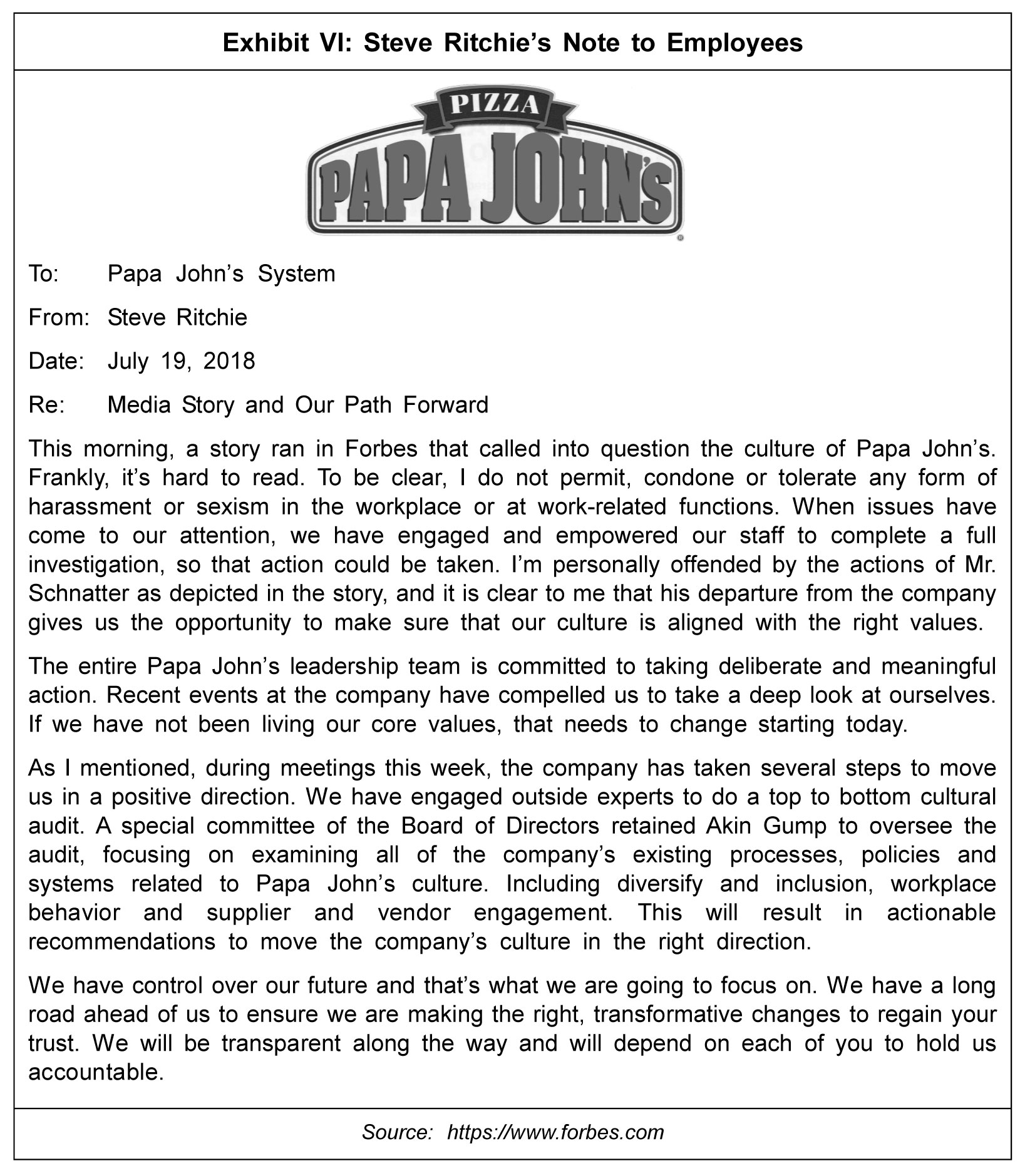 There seemed to be no end to the controversies dogging Papa John's even after Schnatter left the company. On July 19, 2018, an investigative article in Forbes reported that Papa John's suffered from a 'toxic' culture.xl The article stated that the problems at the company extended well beyond the founder's PR crisis. Based on interviews with 37 current and former employees of Papa John's, Forbes accused Schnatter of numerous allegations ranging from spying on his workers to sexually inappropriate conduct. It alleged that Schnatter had recruited employees to spy on their colleagues. He read workers' emails, according to two sources with knowledge of the episodes, and sometimes conducted business from disposable phones. Schnatter allegedly also engaged in sexual misconduct that resulted in at least two confidential settlements.xli