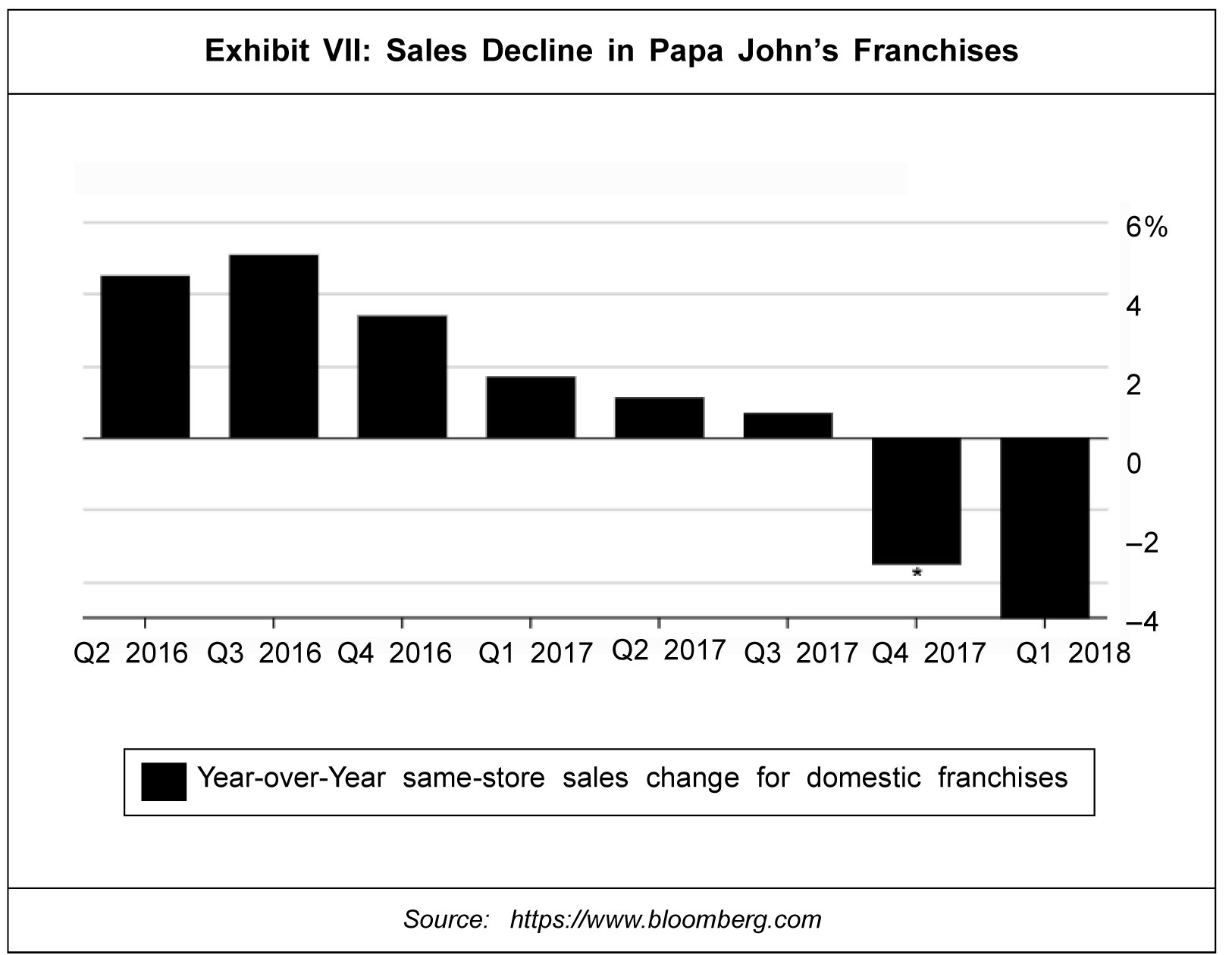 The unsavory situation started hurting sales and footfall at Papa John's franchisees. Locked in long-term contracts with Papa John's which required them to pay the company for all marketing materials and food as well as a percentage of the their sales, the franchisees found themselves in a vulnerable position. As of July 2018, same-store sales for domestic franchisees turned negative and were likely to drop further (Refer to Exhibit VII for more details).