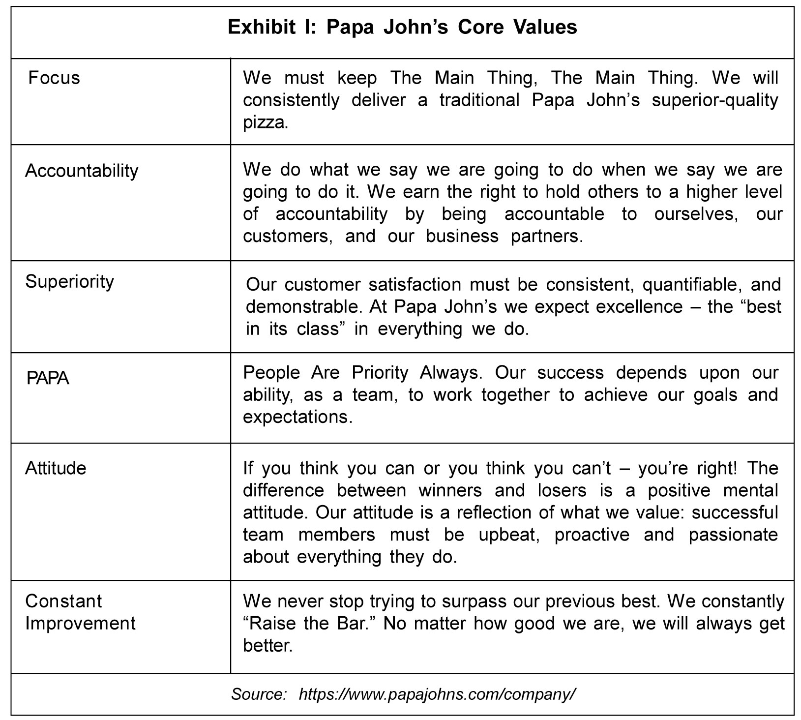 Schnatter started his entrepreneurial venture at the very young age of 8, when he founded a grass-cutting company with his younger brother. At 12, he started a gutter-painting startup. At the age of 15, he started working as a dishwasher at Ricky's Sub Pub, a pizza restaurant in Jeffersonville, Indiana. There, he eventually started making pizzas. That experience inspired him to open a pizza restaurant of his own. After completing his studies, Schnatter started managing his father's pub, Mick's Lounge, which was running at a loss. Schnatter did not like the bar business but loved running the business. Finally, in 1984, he started selling pizzas out of the back of the bar. In 1985, the first Papa John's restaurant was opened in Jeffersonville. In 1986, Papa John's sold its first franchise. In 1991, the pizza chain opened its 100th restaurant in Clarksville, Tennessee. The firm went public in 1993 and was listed as "PZZA" on NASDAQ. It focused on quality and hence ranked high in customer satisfaction among national pizza chains (Refer to Exhibit I for core values of Papa John's). In 1995, it was ranked 10th on Forbes' list of the nation's 200 best small companies. In 2001, Papa John's became the first national pizza company to offer online ordering. After that, the company's sales grew exponentially with online sales growing by more than 50% each year on an average. In 2008, Papa John's hit the $1 bn mark in e-commerce sales, becoming the first company to achieve cumulative online sales of $1 bn. In less than two years - by 2010 - it surpassed $2 bn in online sales.viii