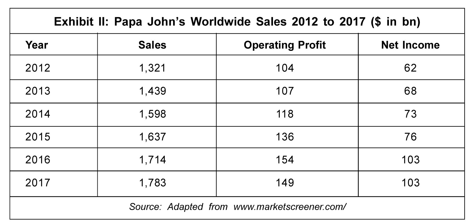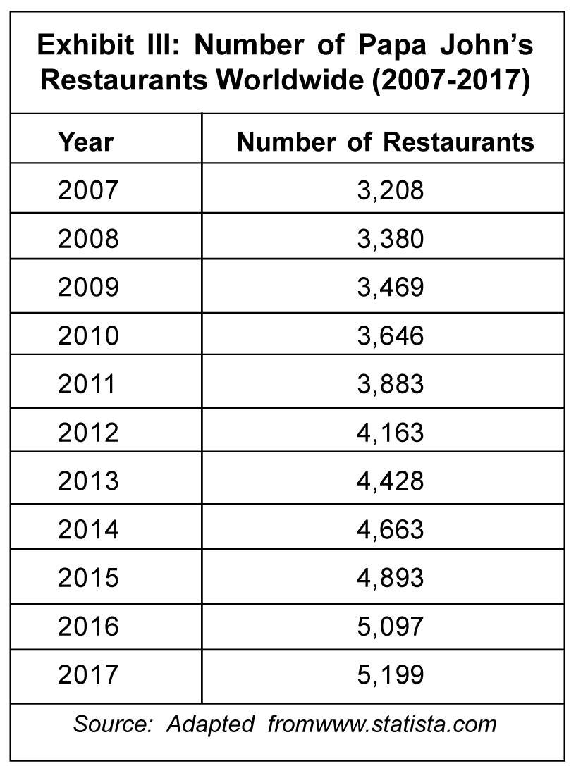 The revenues of the company continued to soar year after year (Refer to Exhibit II for the details of revenue). The shares hit an all-time high of nearly $90 in December 2016. By 2017, Papa John's had become one of the largest pizza companies in America with 5,199 restaurants in operation, consisting of 743 company-owned and 4,456 franchised restaurantsxii (Refer to Exhibit III for details of the number of restaurants). In March 2017, Schnatter featured on the Forbes' World's Billionaires list for the first time.