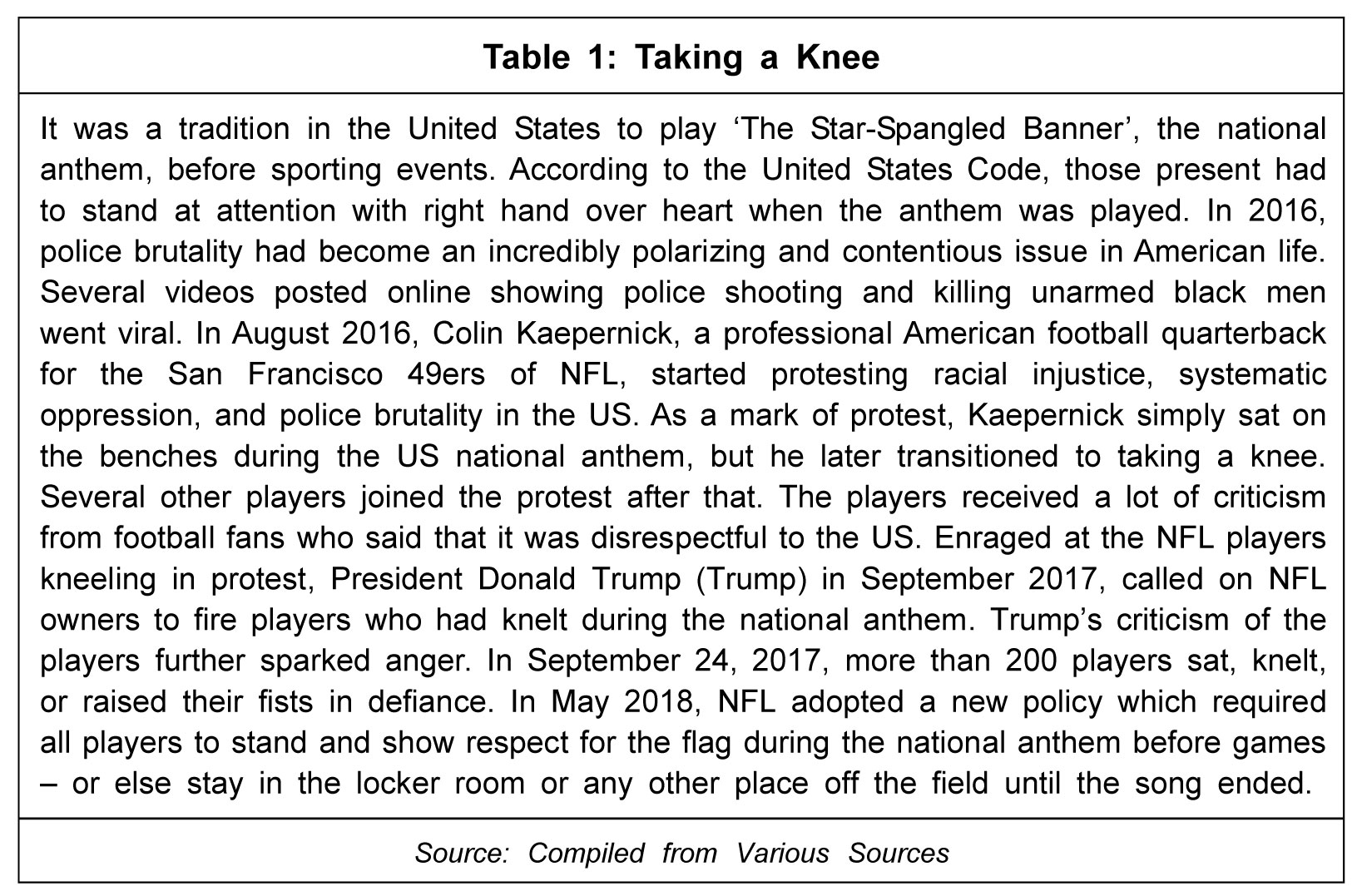 The restaurant chain lost a quarter of its market capitalization owing to quality issues. The third quarter earnings of the company were disappointing. The North American same-store sales, a key measure of the company's operations, grew at 1.5% for 2017, instead of in the expected 2% to 4% range. Diluted Earnings Per Share (EPS) also fell short of analysts' expectations. EPS grew by just 3% to 7% against the projected 8% to 12%.xiii In less than 24 hours of the company releasing its third-quarter financial report, the net worth of Schnatter fell by $70 mn. The worst damage was caused by Schnatter blaming the NFL players' protest for the sales drop (Refer to Table 1 for more on National Anthem protest).