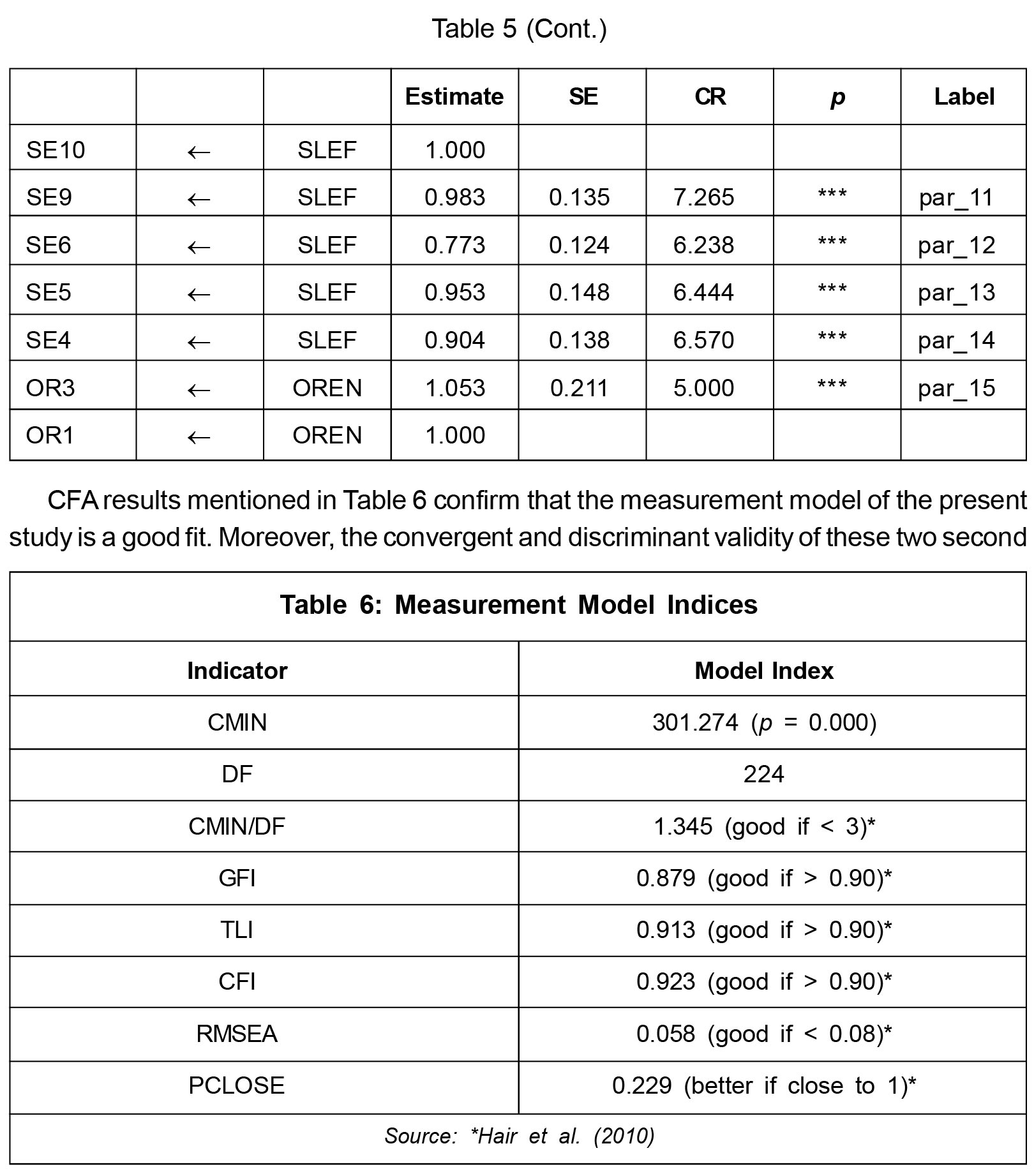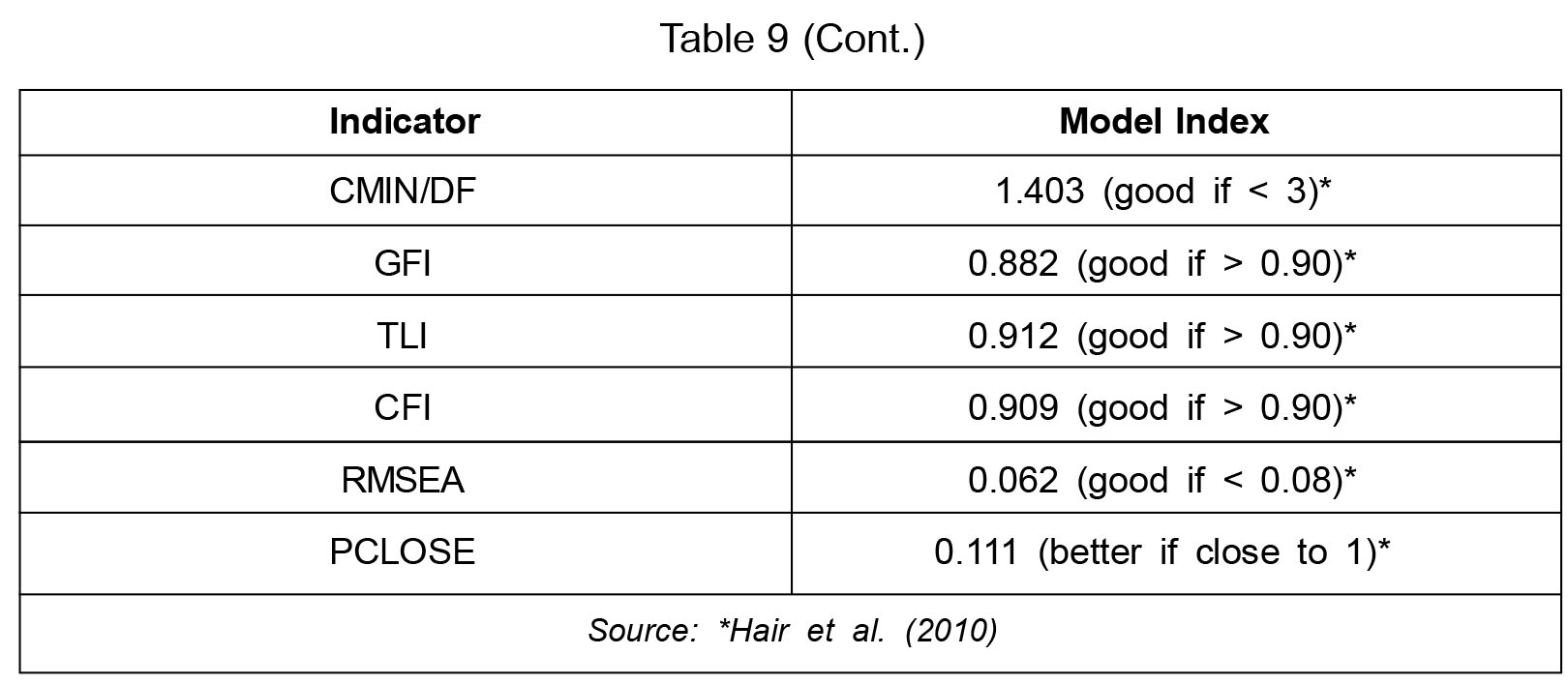 Model fit has been assessed with the help of fit indices suggested by Hair et al. (2010).
