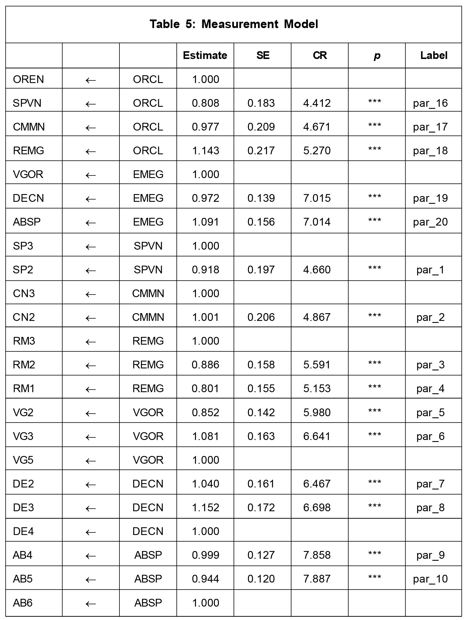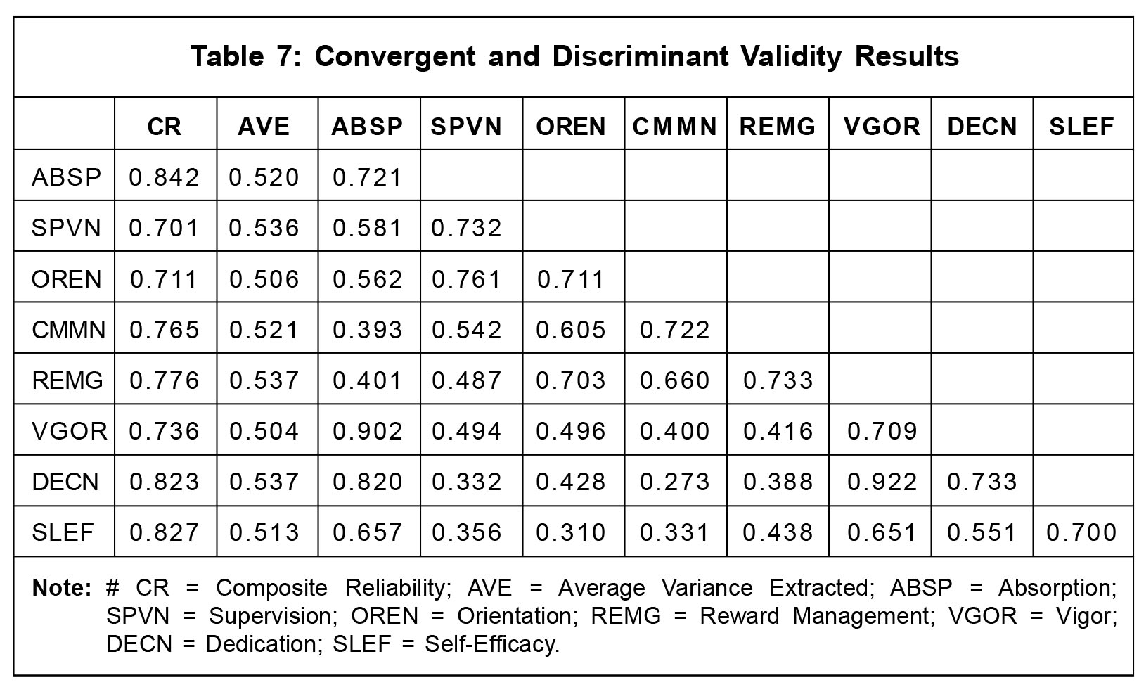 0.5 (Hair et al., 2010). For each set of indicators, CR ranges from 0.701 to 0.842, and