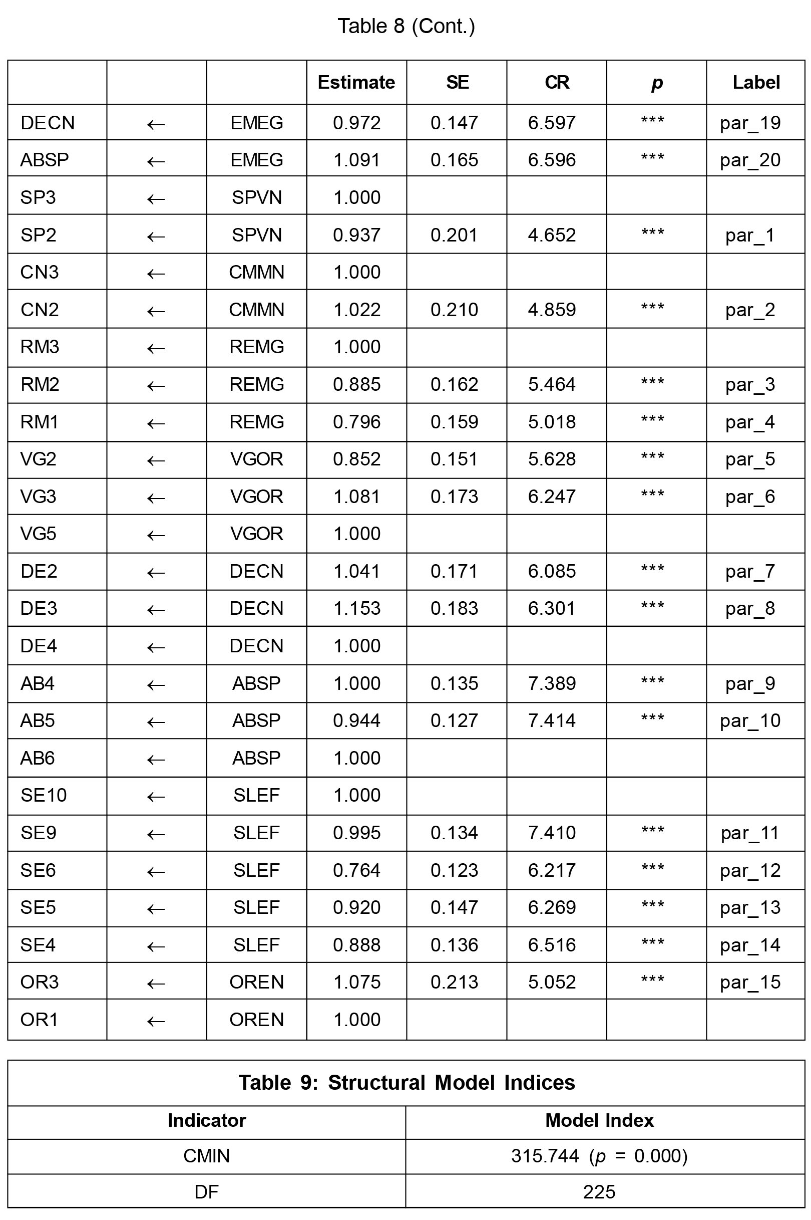 All the fit indices are in the prescribed range (Table 8). Therefore, the structural model