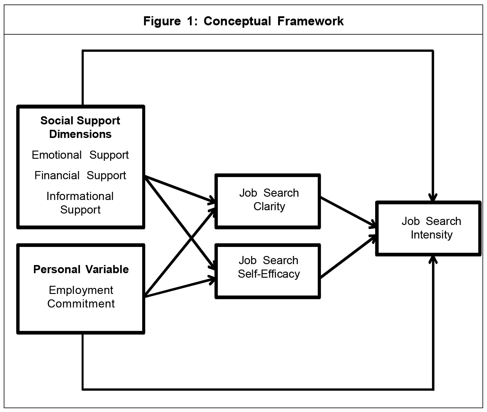 Though job search clarity and job search self-efficacy are noted as vital mechanisms of self-regulatory process and play a critical role in accelerating job seekers' search intensity, there is paucity of research examining the factors that may strengthen job seekers' job search clarity and job search self-efficacy. In this regard, past studies have only examined the individual differences such as personality and dispositional variables as predictors of job search self-efficacy (Brown et al., 2006) and individual differences and career-relevant activities as predictors of job search-clarity (Cote et al., 2006; and Zikic and Saks, 2009). However, in the light of the social cognitive theory framework, situational factors also play a critical role in determining an individual's personal and cognitive states which in turn leads to an action. In particular, availability of social support such as emotional, informational and instrumental support will help job seekers in obtaining resources, information, feedback, and direction which may boost their job search clarity and job search self-efficacy. Further, although individual differences have been widely examined as predictors of job search clarity and job search self-efficacy, employment commitment of job seekers is also likely to foster job search clarity and self-efficacy. The present study, therefore, focuses on the social support dimensions and employment commitment as antecedents of job search self-efficacy, job search clarity, and the job search intensity of graduating students in India.