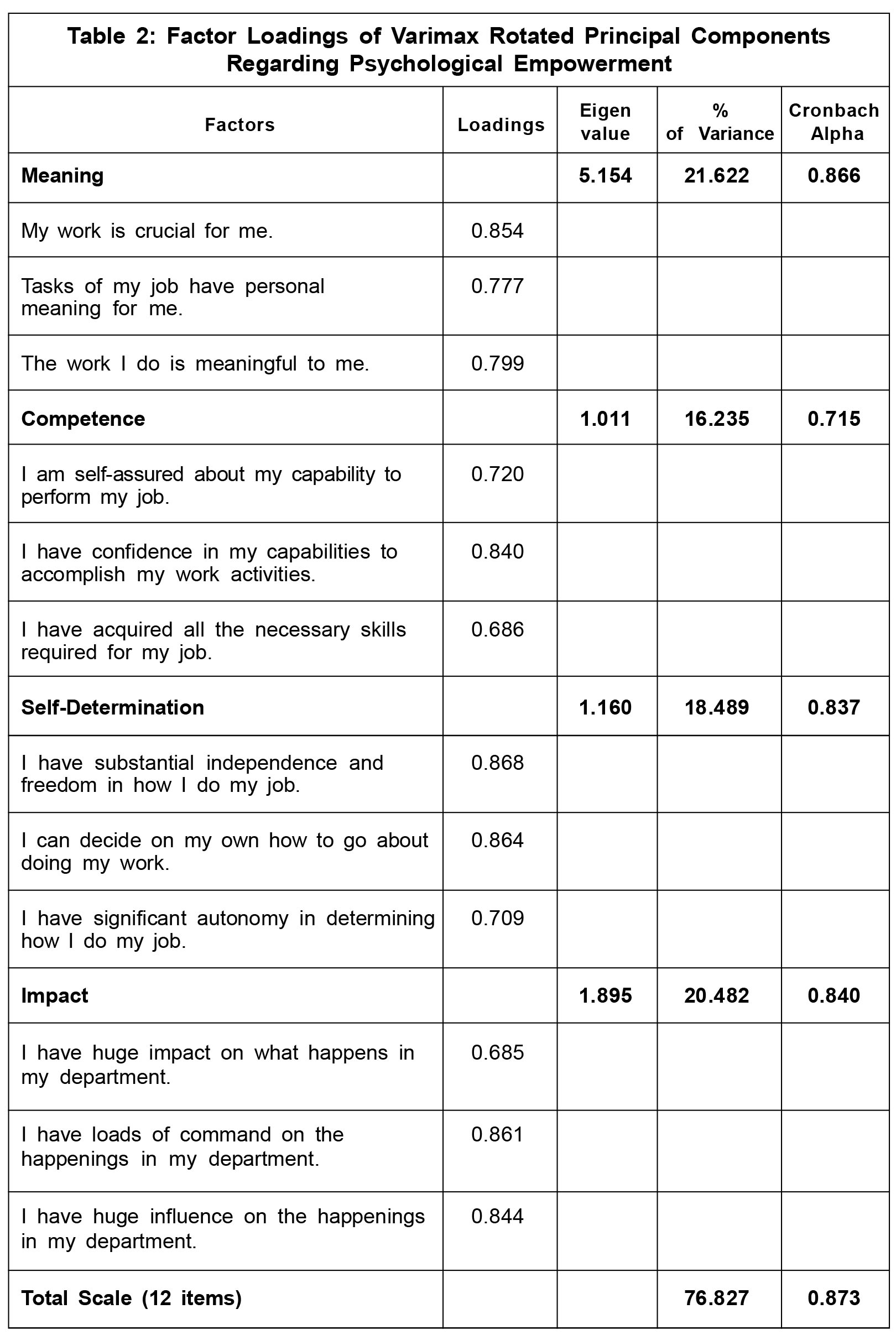 of factor analysis regarding psychological empowerment are given in Table 2. When