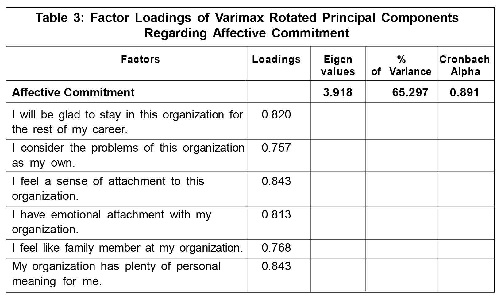 The results of factor analysis for affective commitment are presented in Table 3. When