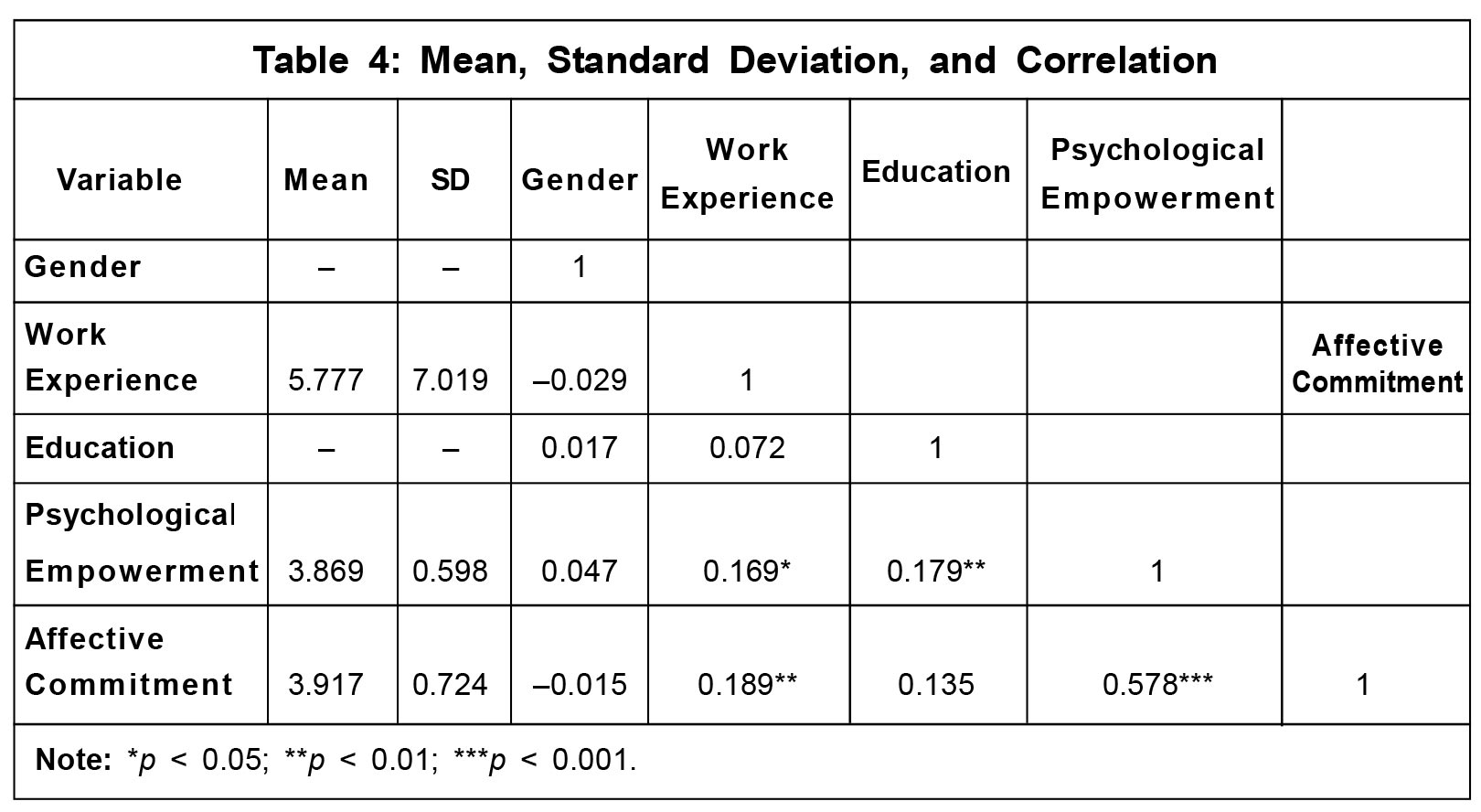 was significantly related with affective commitment (r = 0.578***).