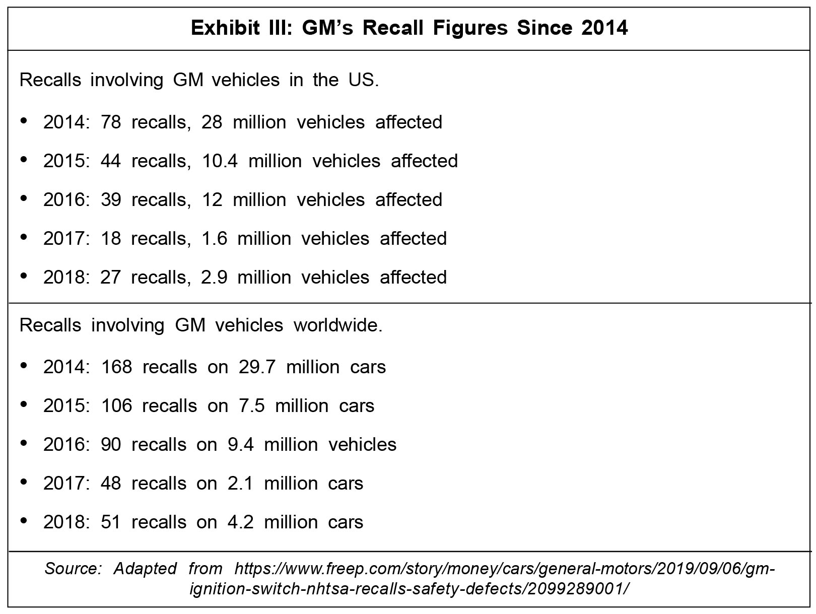 After the ignition switch recall, GM intensified its focus on workplace safety so that there would never be another safety lapse. The company's efforts on safety helped it to reduce recordable injury rates and total incident rates (Refer to Exhibit III for details on US and worldwide recall figures). However, GM was determined that it would pursue further safety initiatives until that figure was 100% injury-free.