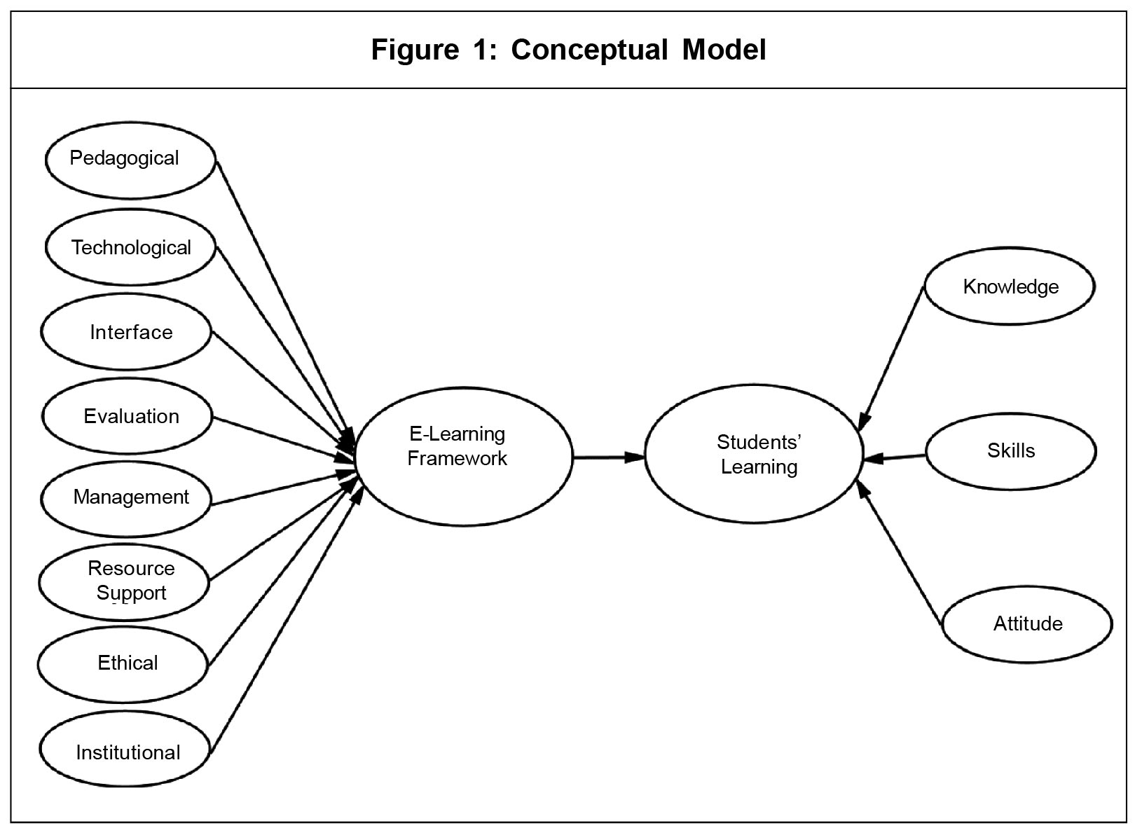 The conceptual model of the present research paper is shown in Figure 1. We have adopted Khan's (2005 and 2007) e-learning framework to understand the students' perception of the e-learning system used in their technical education institutions in the selected sample.