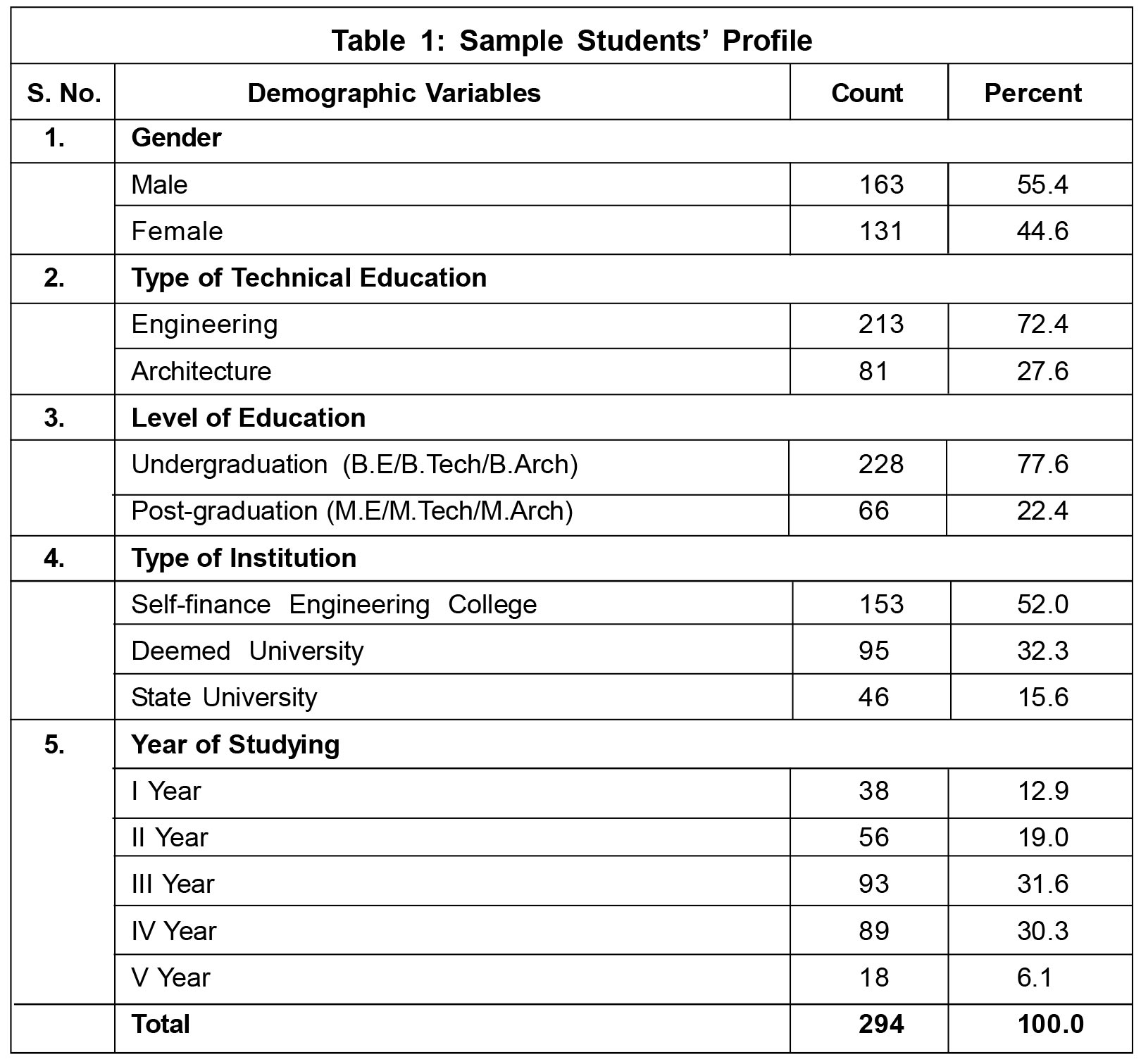 Among the 294 students surveyed, 55.4% of the respondent are males, and the remaining are females. 72.4% of respondents are studying engineering courses in various branches, whereas 27.6% are studying architecture courses. Most of them are pursuing undergraduate programs, only 22.4% of them pursued programs at the postgraduate level. A majority of them studying their technical education in self-financing engineering colleges are affiliated to Anna University, Chennai, whereas around one-third of them study in deemed universities located in and around Chennai city, and only 15.6% of them are from Anna University, Chennai. Out of 294 students surveyed, 31.6% are studying in III year of the course, 30.3% of respondents are pursuing their IV year, 19.0% pursuing their II Year, 12.9% are undergoing their I year, and only 6.1% are studying in V year of their technical education.