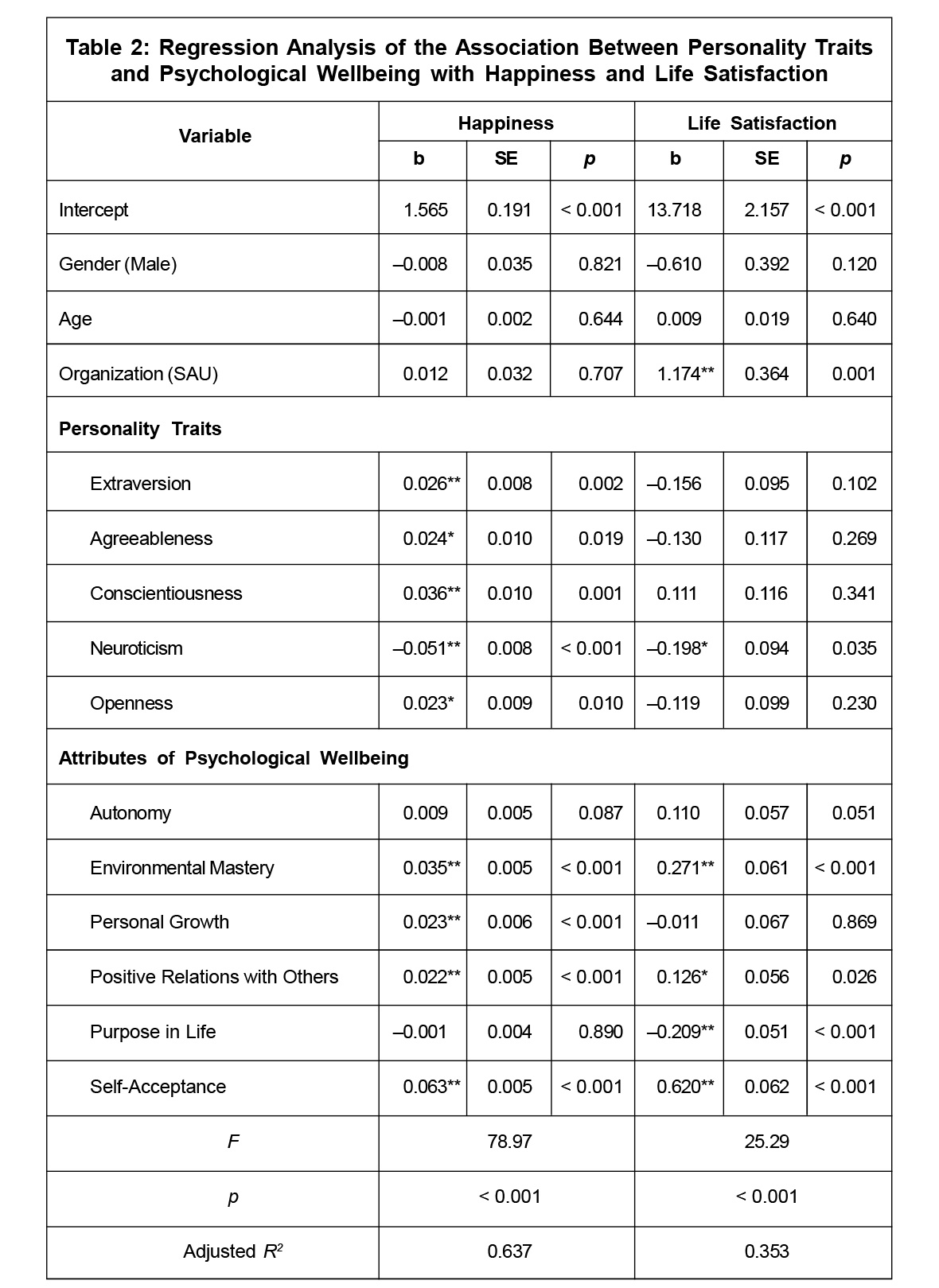 The results of the regression analysis for happiness and life satisfaction as a function of personality traits and PWB attributes are presented in Table 2. From the data, it is observed that gender, age, and organization were not contributing significantly (p > 0.1) in predicting happiness. Personality traits were found to be significantly (p > 0.05) contributing towards happiness. Except for neuroticism, all other personality traits were found to be having a positive contribution to happiness. Neuroticism has the highest association (but negative) with happiness. Among PWB attributes, environmental mastery, personal growth, positive relations with others, and self-acceptance were positively contributing towards happiness. This model is successful in capturing 63.7% of the variation in happiness. In the model for life satisfaction, organization (positively) and neuroticism (negatively) were found to be having a significant (p > 0.05) contribution. Among the attributes of PWB, self-acceptance, environmental mastery, positive relations with others significantly and positively contributed towards life satisfaction. This model successfully captured 35.3% of the variation in life satisfaction.