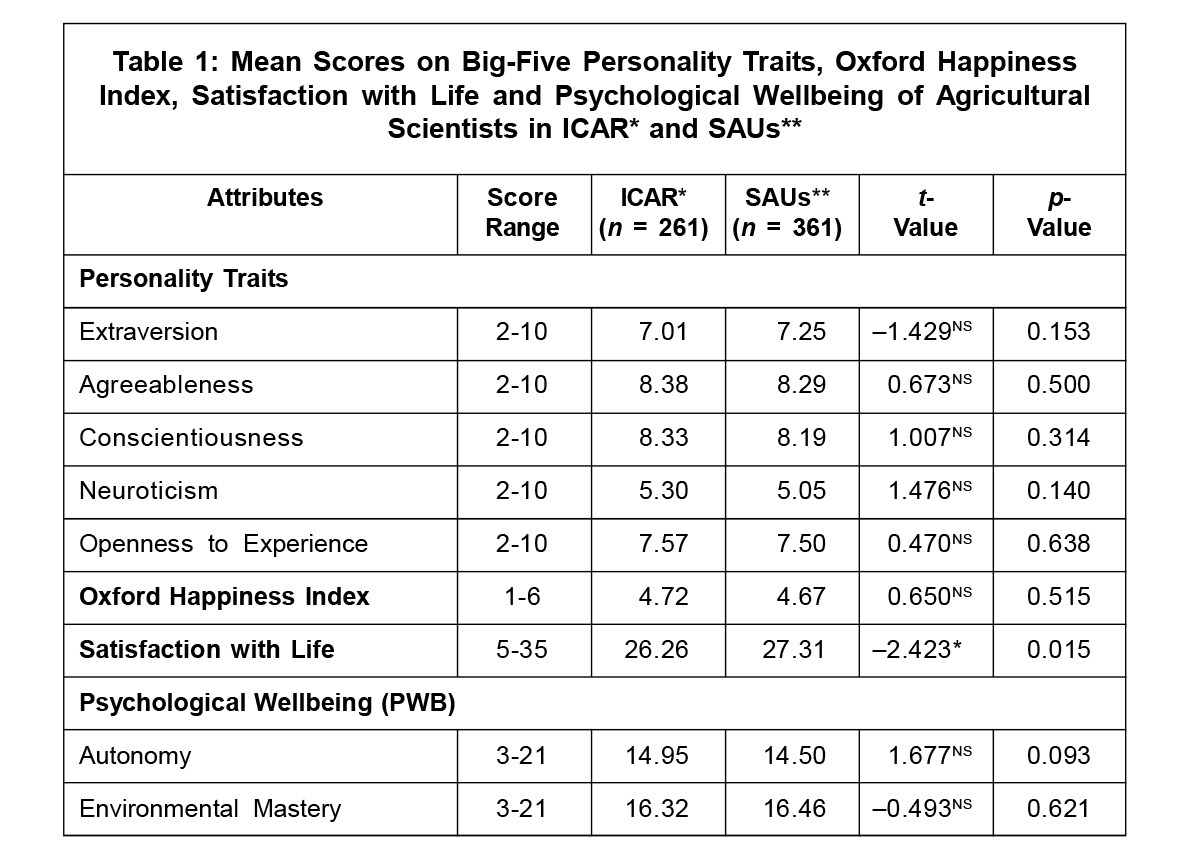 The mean scores on Big-Five personality traits and happiness index did not significantly differ between ICAR and SAU scientists (Table 1). However, scientists from SAUs recorded significantly higher scores on life satisfaction (27.31) compared to scientists from ICAR (26.26). The total PWB score was significantly higher among ICAR scientists (99.02) compared to SAU scientists (95.99). Among PWB attributes, the scores on 'personal growth', 'positive relations with others' and 'purpose in life' were significantly higher among ICAR scientists than among those in SAUs.