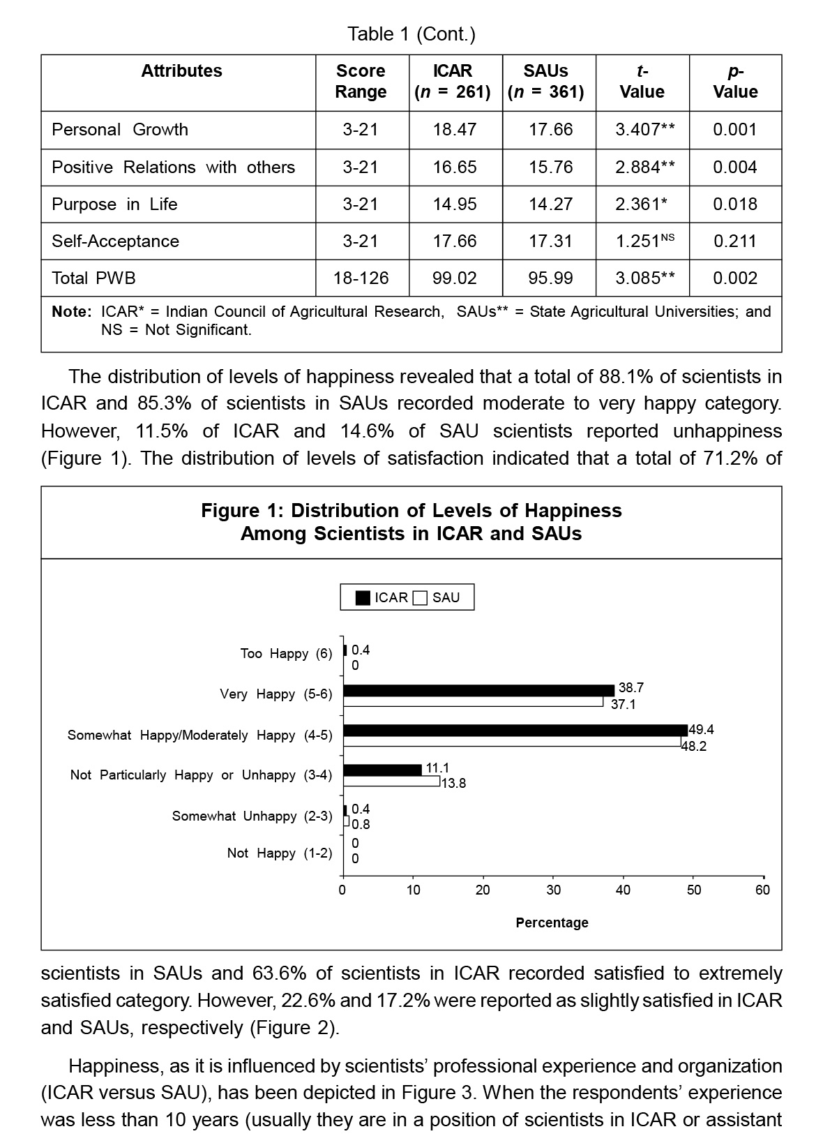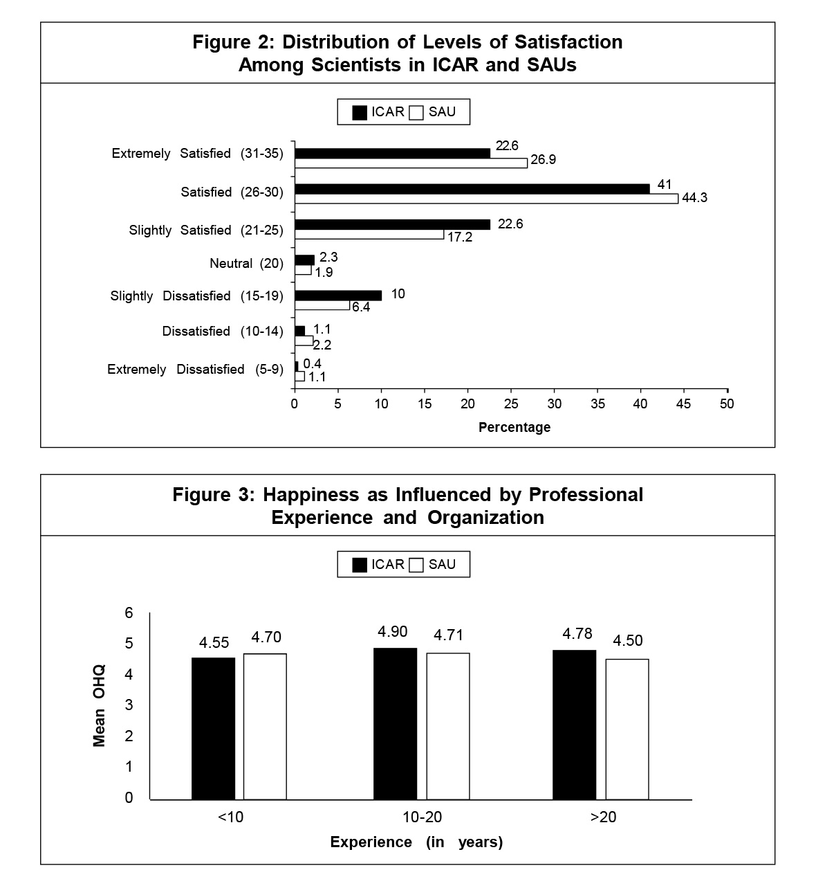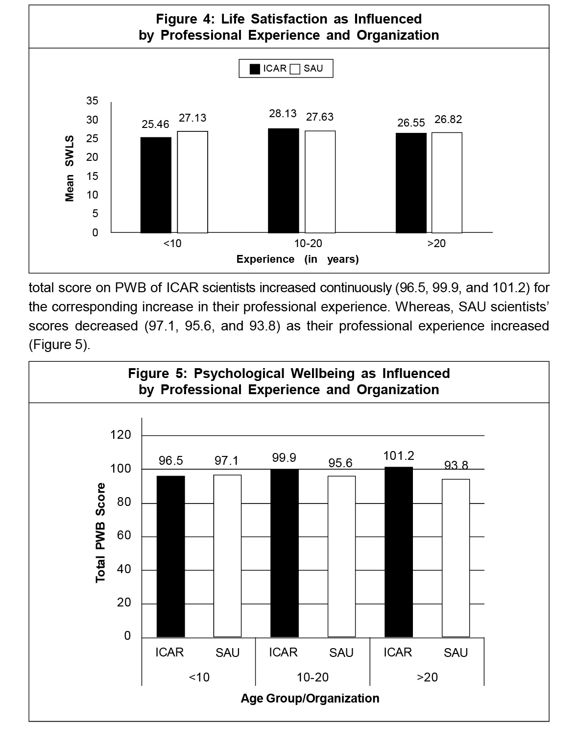 Higher levels of wellbeing among the SAU scientists, especially at the early stages of their career (less than 10 years), are probably due to the initial euphoria of getting placement in their native states with familiar sociocultural context, which makes them more comfortable and have feelings of happiness and satisfaction. In ICAR, scientists on selection are likely to be placed anywhere in India depending upon the vacancy positions in 101 institutions of ICAR, which makes some people not happy or unsatisfied till they get acclimatized in their organization, which may take considerable time. But once they get effectively adapted to their research environment in ICAR, their wellbeing is better than that of the scientists of SAUs.