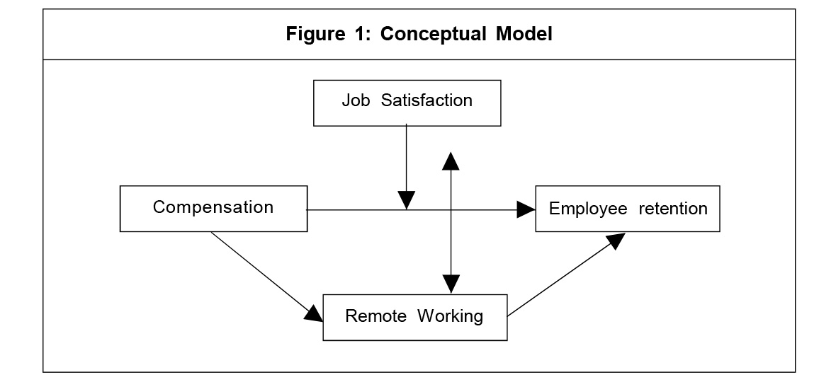 Fair wages are the cornerstone of the implied and contractual tie between employers and employees, with the underlying assumption that money may influence attitude towards work (Parker and Wright, 2001). Wages are the biggest factor determining employee attraction and retention (Williams and Dreher, 1992). Compensation plays a significant role in determining the commitment levels of employees and their retention as one of the critical factors in attracting and keeping talent in organizations (Willis, 2000). According to Ganesan (2010), major indicators of job satisfaction for an employee include compensation, promotion, and the work itself. Job satisfaction is always linked to an employee's productivity, creativity, and devotion in the workplace and it is the most important element influencing employees' retention (Robyn, 2012). According to Yaseen (2013), effective compensation programs will boost job satisfaction and as a result, workforce retention. Hassan et al. (2021) discovered that job satisfaction moderates the relationship between compensation and retention of millennial employees. According to Harvard Business Review (2014), remote workers were more productive, more willing to work overtime, and more likely to stay with a company for a longer period than counterparts who worked in an office. According to FlexJobs (2022)7 research, 86% of people believe that working remotely allows flexible schedules, reduces stress, and fewer distractions, and those who work remotely are happier and more productive and 76% of employees are eager to stay with their current employer if they could work from home. The flexibility of creative workers to work remotely, manage their tasks, and have operational autonomy is associated with their wellbeing, job satisfaction, and dedication. Creative people with geographical autonomy have more favorable work attitudes and greater mental health (Rubin, 2012). Research suggests that allowing employees to work remotely is extremely helpful to their wellbeing, aids in attracting talent, and reduces attrition. Remote working also provides organizations access to the talented and high-ability workforce who prefer job flexibility.
