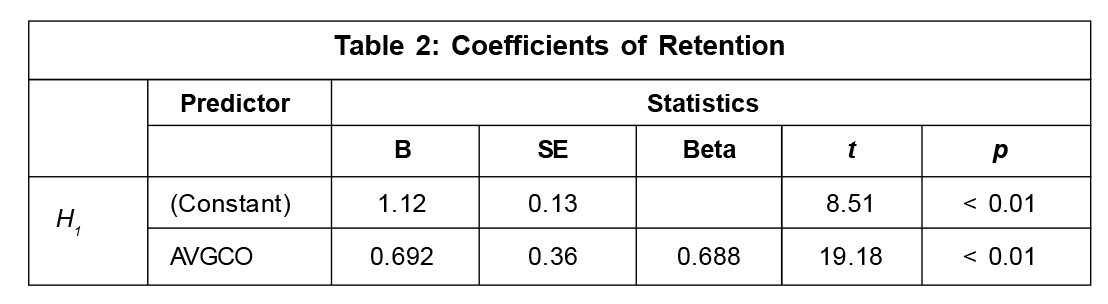 To test the hypothesis, linear regression analysis was done. The first hypothesis refers to examining the impact of compensation on the retention of employees in animation companies in India. The regression model summary was statistically significant and indicated R2 = 0.47 with the value of F = 367.904, p < 0.001 (Table 1). The results indicate a significant impact of compensation on employee retention (b = 0.69, t = 19.18, p < 0.01), implying a 47% variance in the retention of employees is explained by compensation, while the remaining variances are explained by other factors outside the model.